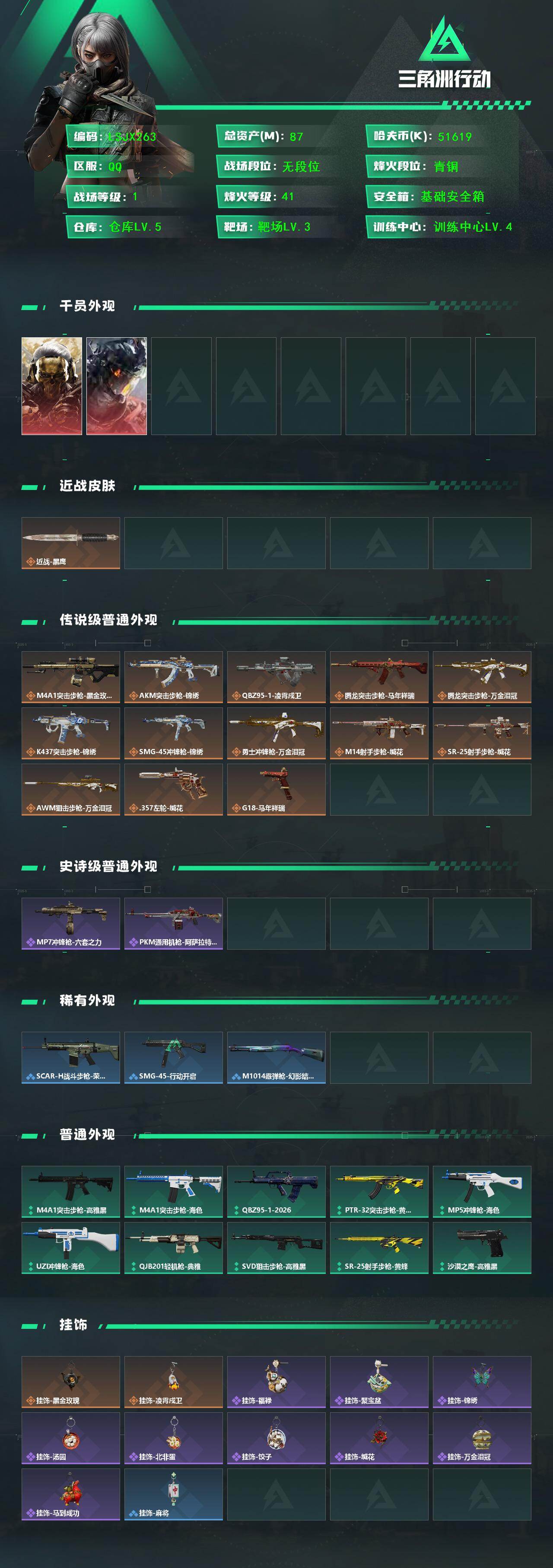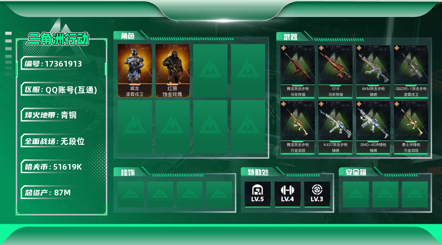 [17361913]【特价出售/店主推荐】87m总资产-51619k哈伏币-41烽火等级-青铜-1战场等级-无军衔 【干员外观】:红狼-蚀金玫瑰,威龙-凌霄戍卫 【近战皮肤】:近战-黑鹰 【传说外观】:M4A1突击步枪-蚀金玫瑰,AKM突击步枪-锦绣,QBZ95-1突击步枪-凌霄戍卫,腾龙突击步枪-马年祥瑞,腾龙突击步枪-万金泪冠,K437突击步枪-锦绣,SMG-45冲锋枪-锦绣,勇士冲锋枪-万金泪冠,M14射手步枪-缄花,SR-25射手步枪-缄花,AWM狙击步枪-万金泪冠,.357左轮-缄花,G18-马年祥瑞 【史诗外观】:MP7冲锋枪-六套之力,PKM通用机枪-阿萨拉特攻 【稀有外观】:SCAR-H战斗步枪-荣耀列队,SMG-45冲锋枪-行动开启,M1014霰弹枪-幻影结构 【普通外观】:M4A1突击步枪-高雅黑,M4A1突击步枪-海色,QBZ95-1突击步枪-2026,PTR-32突击步枪-黄蜂,MP5冲锋枪-海色,UZI冲锋枪-海色,QJB201轻机枪-典雅,SVD狙击步枪-高雅黑,SR-25射手步枪-黄蜂,沙漠之鹰-高雅黑 【挂饰】:挂饰-蚀金玫瑰,挂饰-凌霄戍卫,挂饰-福禄,挂饰-聚宝盆,挂饰-锦绣,挂饰-汤圆,挂饰-北非蛋,挂饰-饺子,挂饰-缄花,挂饰-万金泪冠,挂饰-马到成功,挂饰-麻将
