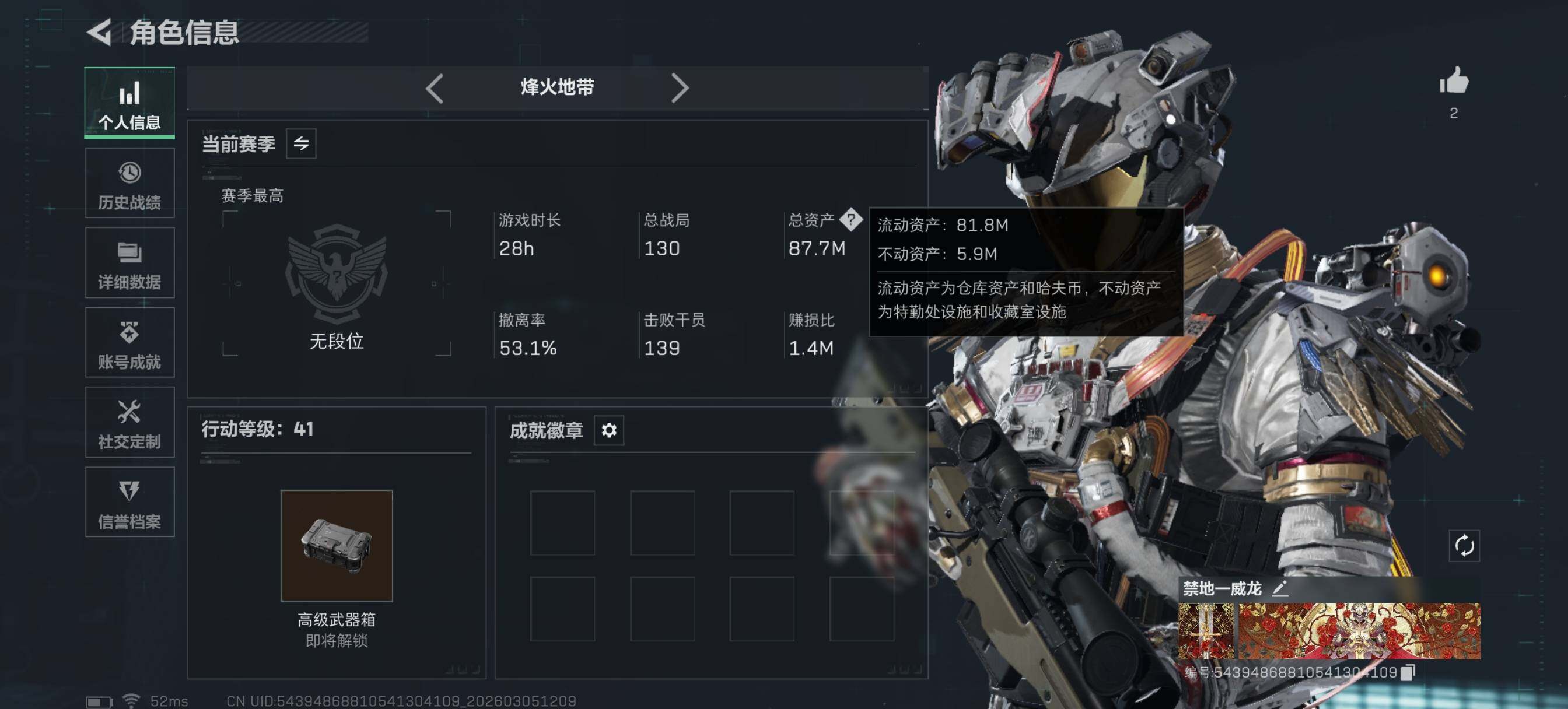 [17361913]【特价出售/店主推荐】87m总资产-51619k哈伏币-41烽火等级-青铜-1战场等级-无军衔