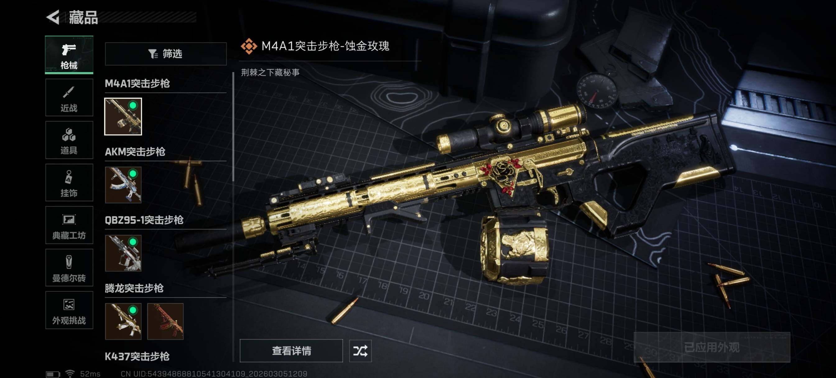 【传说外观】:M4A1突击步枪-蚀金玫瑰,AKM突击步枪-锦绣,QBZ95-1突击步枪-凌霄戍卫,腾龙突击步枪-马年祥瑞,腾龙突击步枪-万金泪冠,K437突击步枪-锦绣,SMG-45冲锋枪-锦绣,勇士冲锋枪-万金泪冠,M14射手步枪-缄花,SR-25射手步枪-缄花,AWM狙击步枪-万金泪冠,.357左轮-缄花,G18-马年祥瑞