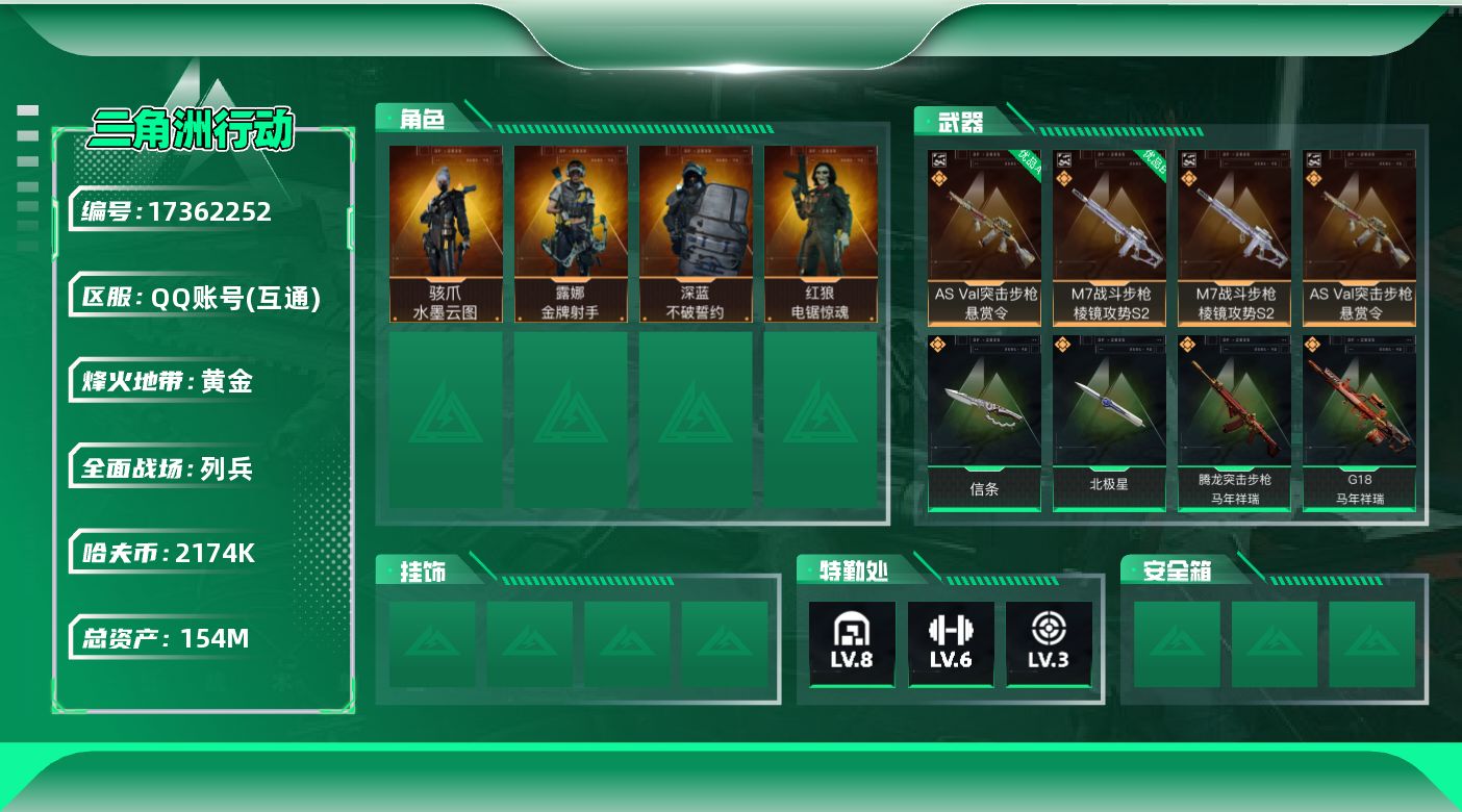 [17362252]可二次【特价出售/店主推荐】154m总资产-2174k哈伏币-60烽火等级-黄金-50战场等级-列兵 【干员外观】:骇爪-水墨云图,深蓝-不破誓约,红狼-电锯惊魂,露娜-金牌射手 【近战皮肤】:近战-北极星,近战-信条,近战-黑鹰 【典藏外观】:M7战斗步枪-棱镜攻势S2,AS Val突击步枪-悬赏令 【典藏外观成色】:M7战斗步枪-棱镜攻势S2(优品B),AS Val突击步枪-悬赏令(优品A) 【传说外观】:M4A1突击步枪-阿米娅,ASh-12战斗步枪-鹅鸭杀,SG552突击步枪-运动员,AK-12突击步枪-特斯拉线圈,SCAR-H战斗步枪-水墨云图,SCAR-H战斗步枪-启航,G3战斗步枪-骑士,CAR-15突击步枪-阿米娅,腾龙突击步枪-捞点薯条,腾龙突击步枪-马年祥瑞,腾龙突击步枪-万金泪冠,K437突击步枪-几何解构,KC17突击步枪-电锯惊魂,P90冲锋枪-信条,UZI冲锋枪-特斯拉线圈,SMG-45冲锋枪-骑士,SR-3M紧凑突击步枪-特斯拉线圈,勇士冲锋枪-能天使-午夜邮差,勇士冲锋枪-万金泪冠,QCQ171冲锋枪-鹅鸭杀,M250通用机枪-骑士之心,QJB201轻机枪-鹅鸭杀,M14射手步枪-电锯惊魂,M14射手步枪-蛮荒,SKS射手步枪-骑士,SR-25射手步枪-水墨云图,SR-25射手步枪-信条,AWM狙击步枪-捞点薯条,AWM狙击步枪-万金泪冠,G18-马年祥瑞,93R-捞点薯条,复合弓-黑·天际线 【史诗外观】:AKM突击步枪-林中猎手,QBZ95-1突击步枪-曙光,ASh-12战斗步枪-刀锋,ASh-12战斗步枪-无极限,K416突击步枪-冬日风情,M16A4突击步枪-竞赛选手,AUG突击步枪-蝮蛇,M7战斗步枪-百步穿杨,SG552突击步枪-深海恐惧,SG552突击步枪-哈夫克警备,SCAR-H战斗步枪-囚徒,G3战斗步枪-流沙送葬,AS Val突击步枪-百步穿杨,K437突击步枪-守护者,MP5冲锋枪-深海恐惧,MP5冲锋枪-战术竞备,MP5冲锋枪-竞技风,Vector冲锋枪-阿萨拉文明,Vector冲锋枪-猎鳄行动,Vector冲锋枪-百步穿杨,Vector冲锋枪-异域战争,SR-3M紧凑突击步枪-战术竞备,勇士冲锋枪-深海恐惧,勇士冲锋枪-工业狂潮,MP7冲锋枪-守护者,M1014霰弹枪-林中猎手,PKM通用机枪-蝮蛇,M25