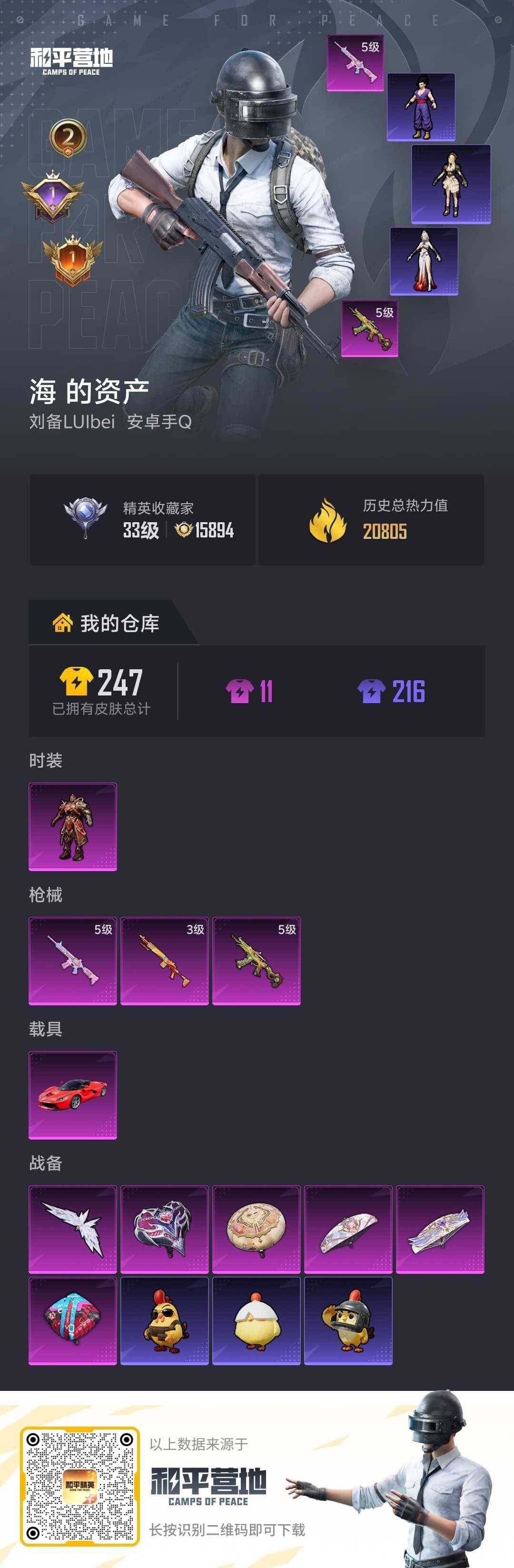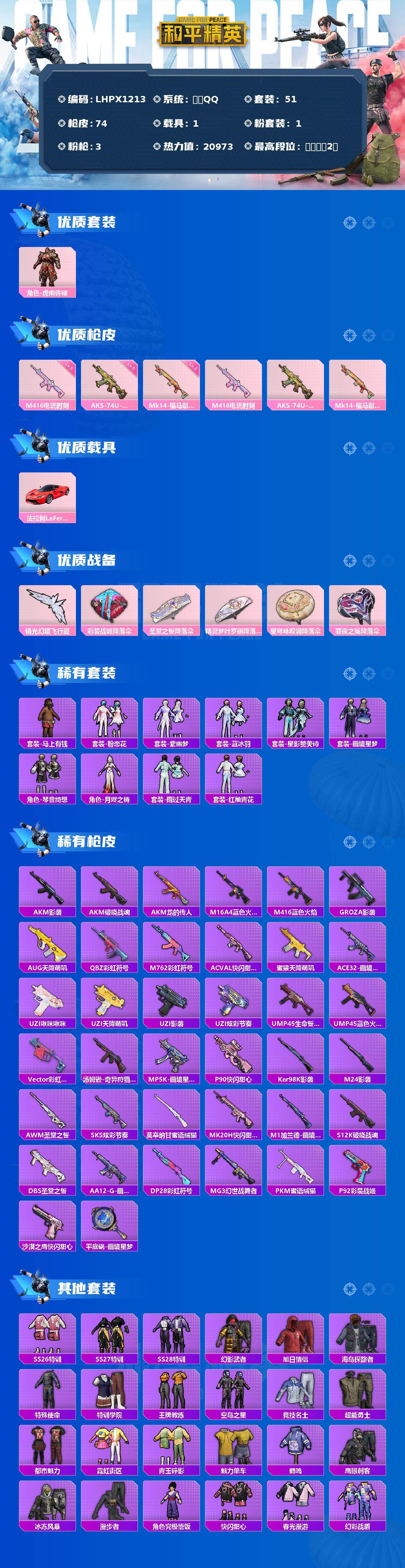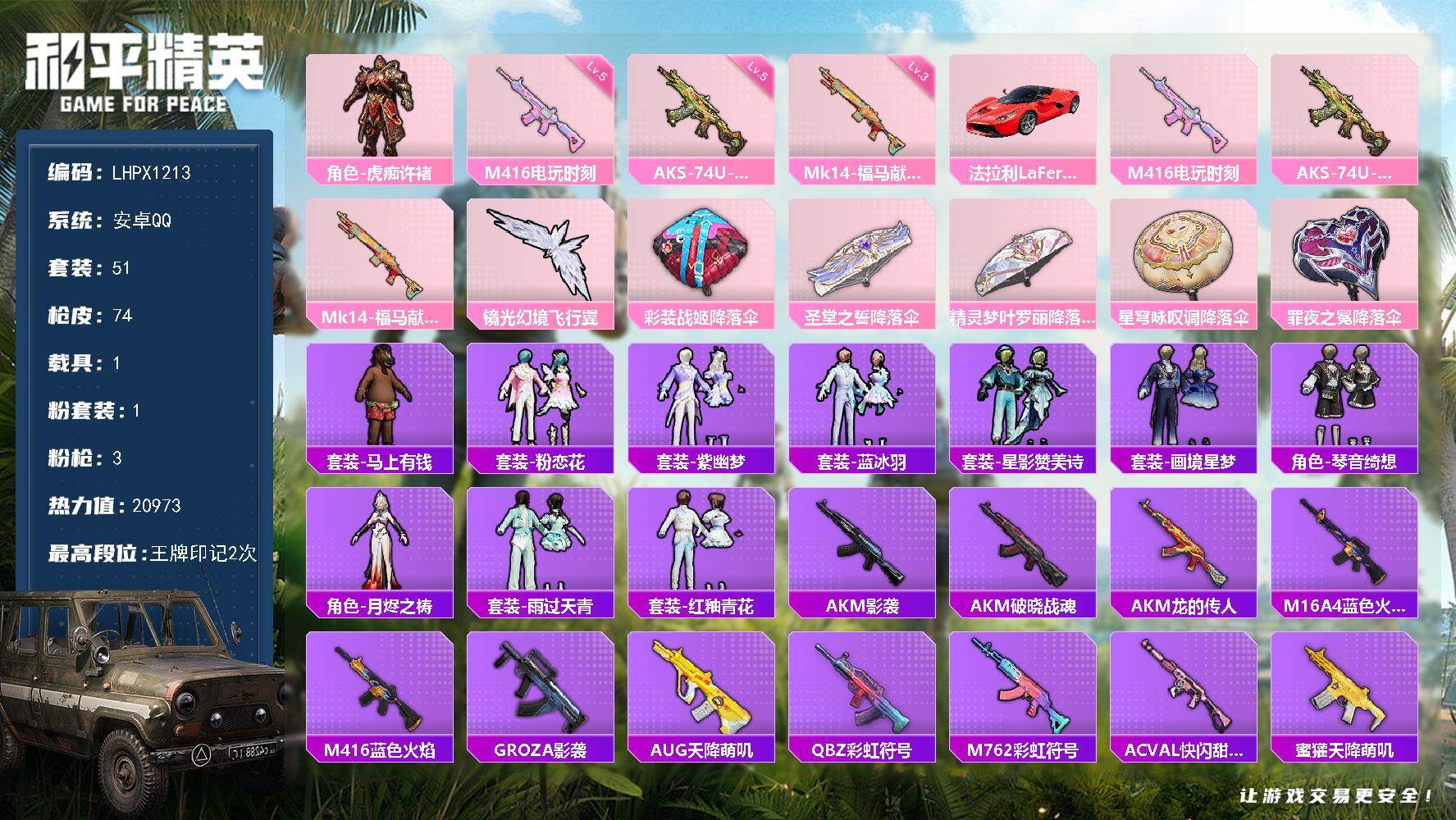 [17362281]【特价出售/店主推荐】安卓 手Q-1粉装-3特效枪-1载具-1粉色飞行器-20973热力值-2王牌印记-51套装-74枪皮 【粉色套装】:角色-虎痴许褚 【粉色枪皮等级】:M416-电玩时刻(五级),AKS-74U-森灵之息(五级),Mk14-福马献瑞(三级) 【粉色载具】:法拉利LaFerrari(赛车红) 【粉色枪皮】:M416-电玩时刻,AKS-74U-森灵之息,Mk14-福马献瑞 【粉色飞行器】:镜光幻境飞行翼 【粉色降落伞】:彩装战姬降落伞,圣堂之誓降落伞,精灵梦叶罗丽降落伞,星穹咏叹调降落伞,罪夜之冕降落伞 【稀有套装】:套装-马上有钱,套装-粉恋花,套装-紫幽梦,套装-蓝冰羽,套装-星影赞美诗,套装-画境星梦,套装-琴音绮想,角色-月烬之祷,套装-雨过天青,套装-红釉青花 【稀有枪皮】:AKM-影袭,AKM-破晓战魂,AKM-龙的传人,M16A4-蓝色火焰,M416-蓝色火焰,GROZA-影袭,AUG-天降萌叽,QBZ-彩虹符号,M762-彩虹符号,AC-VAL-快闪甜心,蜜獾-天降萌叽,ACE32-画境星梦,UZI-啾咪啾咪,UZI-天降萌叽,UZI-影袭,UZI-炫彩节奏,UMP45-生命誓言,UMP45-蓝色火焰,Vector-彩虹符号,汤姆逊-奇异狩猎者,MP5K-画境星梦,P90-快闪甜心,Kar98K-影袭,M24-影袭,AWM-圣堂之誓,SKS-炫彩节奏,莫辛纳甘-蜜语绒猫,MK20-H-快闪甜心,M1加兰德-画境星梦,S12K-破晓战魂,DBS-圣堂之誓,AA12-G-画境星梦,DP-28-彩虹符号,MG3-幻世战舞者,PKM-蜜语绒猫,P92-彩装战姬,沙漠之鹰-快闪甜心,平底锅-画境星梦 【其他套装】:套装-SS26特训,套装-SS27特训,套装-SS28特训,套装-幻影武者,套装-旭日情侣,套装-海岛探路者,套装-特殊使命,套装-特训学院,套装-王牌教练,套装-空岛之星,套装-竞技名士,套装-超能勇士,套装-都市魅力,套装-霓虹街区,套装-青玉碎影,套装-魅力单车,套装-鹤鸣,套装-鹰眼刺客,套装-冰冻风暴,套装-漫步者,角色-究极悟饭,套装-快闪甜心,套装-春光漫游,套装-幻彩战盾,套装-彩霞狙击,套装-童真绒兔,角色-白光莹 【营地ID】:984089313