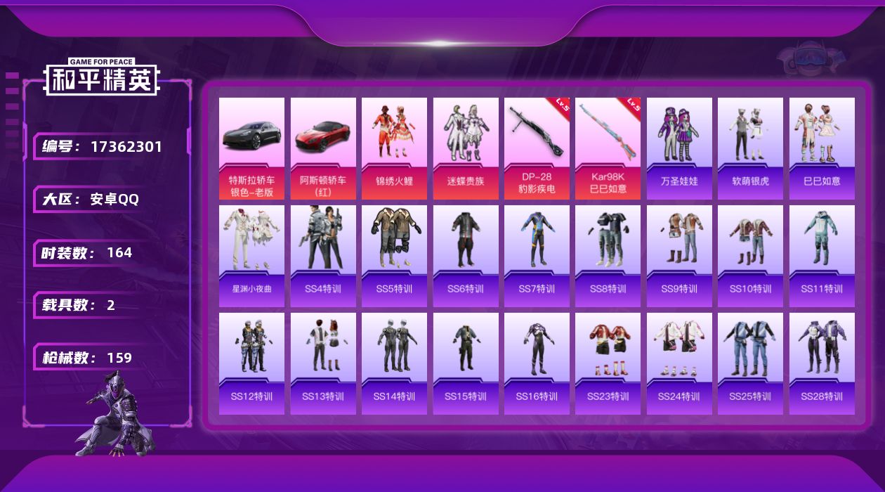 [17362301]【特价出售/店主推荐】安卓 手Q-2粉装-3特效枪-2载具-0粉色飞行器-49334热力值-5王牌印记-164套装-159枪皮【粉色套装】:粉装-锦绣火鲤,粉装-迷蝶贵族【粉色枪皮等级】:Kar98K-巳巳如意(五级),Mk14-福马献瑞(五级),DP-28-豹影疾电(五级)【粉色载具】:特斯拉Model 3(冷光银),阿斯顿马丁DBS(红)【粉色枪皮】:Kar98K-巳巳如意,Mk14-福马献瑞,DP-28-豹影疾电