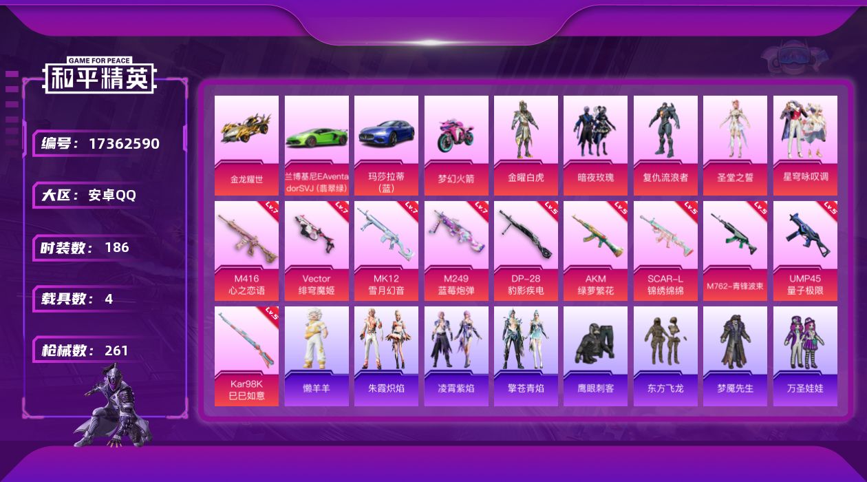 [17362590]【特价出售/店主推荐】安卓 手Q-5粉装-11特效枪-4载具-2粉色飞行器-87480热力值-9王牌印记-186套装-261枪皮