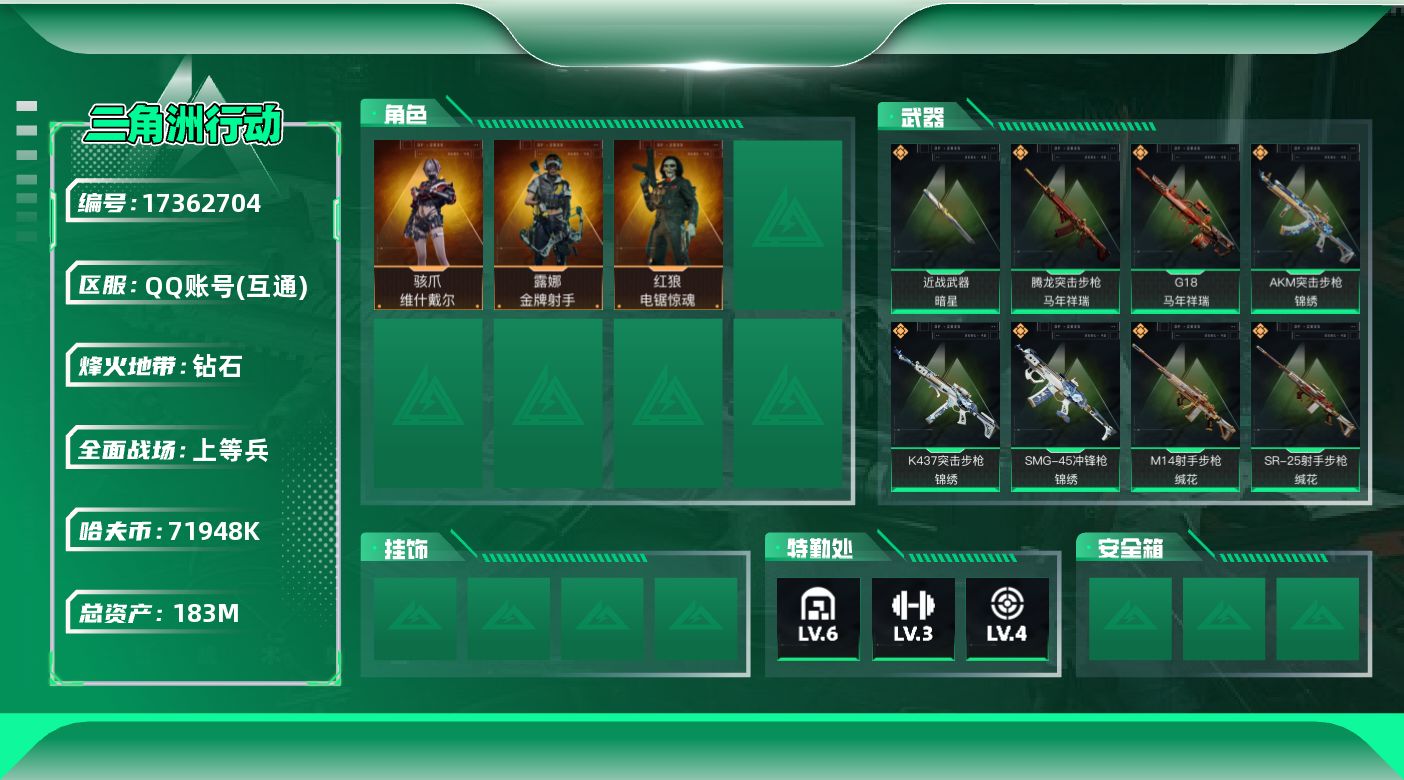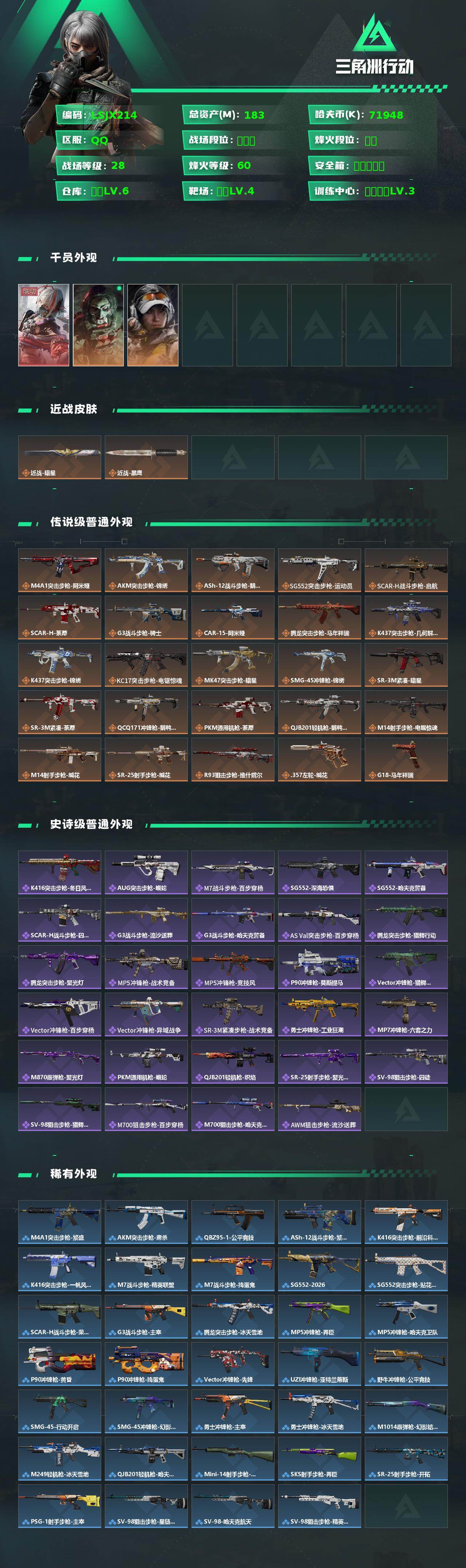 [17362704]【特价出售/店主推荐】183m总资产-71948k哈伏币-60烽火等级-钻石-28战场等级-上等兵 【干员外观】:骇爪-维什戴尔,红狼-电锯惊魂,露娜-金牌射手 【近战皮肤】:近战-暗星,近战-黑鹰 【传说外观】:M4A1突击步枪-阿米娅,AKM突击步枪-锦绣,ASh-12战斗步枪-鹅鸭杀,SG552突击步枪-运动员,SCAR-H战斗步枪-启航,SCAR-H战斗步枪-荼蘼,G3战斗步枪-骑士,CAR-15突击步枪-阿米娅,腾龙突击步枪-马年祥瑞,K437突击步枪-几何解构,K437突击步枪-锦绣,KC17突击步枪-电锯惊魂,MK47突击步枪-暗星,SMG-45冲锋枪-锦绣,SR-3M紧凑突击步枪-暗星,SR-3M紧凑突击步枪-荼蘼,QCQ171冲锋枪-鹅鸭杀,PKM通用机枪-荼蘼,QJB201轻机枪-鹅鸭杀,M14射手步枪-电锯惊魂,M14射手步枪-缄花,SR-25射手步枪-缄花,R93狙击步枪-维什戴尔,.357左轮-缄花,G18-马年祥瑞 【史诗外观】:K416突击步枪-冬日风情,AUG突击步枪-蝮蛇,M7战斗步枪-百步穿杨,SG552突击步枪-深海恐惧,SG552突击步枪-哈夫克警备,SCAR-H战斗步枪-囚徒,G3战斗步枪-流沙送葬,G3战斗步枪-哈夫克警备,AS Val突击步枪-百步穿杨,腾龙突击步枪-猎鳄行动,腾龙突击步枪-聚光灯,MP5冲锋枪-战术竞备,MP5冲锋枪-竞技风,P90冲锋枪-莫斯提马,Vector冲锋枪-猎鳄行动,Vector冲锋枪-百步穿杨,Vector冲锋枪-异域战争,SR-3M紧凑突击步枪-战术竞备,勇士冲锋枪-工业狂潮,MP7冲锋枪-六套之力,M870霰弹枪-聚光灯,PKM通用机枪-蝮蛇,QJB201轻机枪-炽焰,SR-25射手步枪-聚光灯,SV-98狙击步枪-囚徒,SV-98狙击步枪-猎鳄行动,M700狙击步枪-百步穿杨,M700狙击步枪-哈夫克警备,AWM狙击步枪-流沙送葬 【稀有外观】:M4A1突击步枪-繁盛,AKM突击步枪-肃杀,QBZ95-1突击步枪-公平竞技,ASh-12战斗步枪-繁盛,K416突击步枪-前沿科技,K416突击步枪-一帆风顺,M7战斗步枪-精英联盟,M7战斗步枪-捣蛋鬼,SG552突击步枪-2026,SG552突击步枪-贴花艺术,SCAR-H战斗步枪-荣耀列队,G3战斗步枪-主宰,腾龙突击步枪-冰天雪