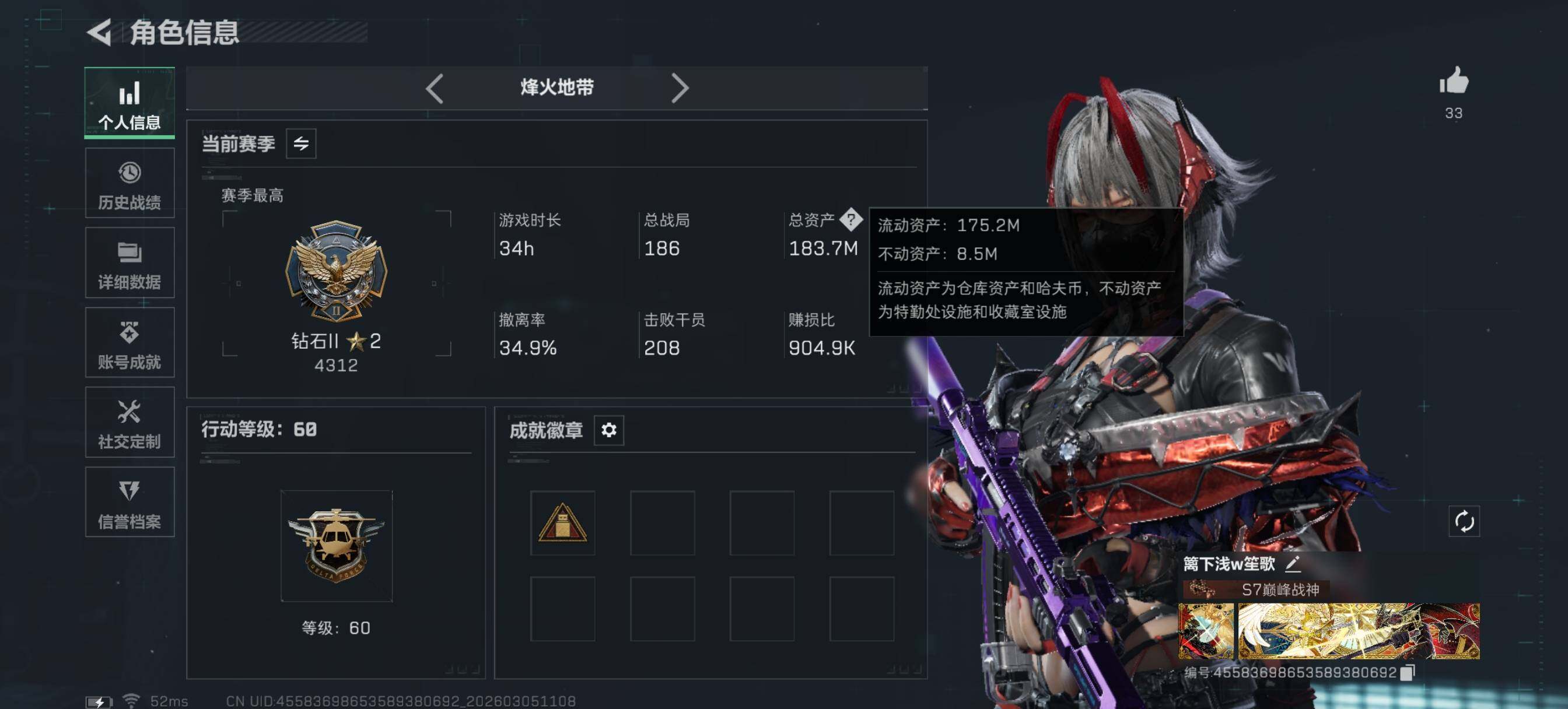 [17362704]【特价出售/店主推荐】183m总资产-71948k哈伏币-60烽火等级-钻石-28战场等级-上等兵