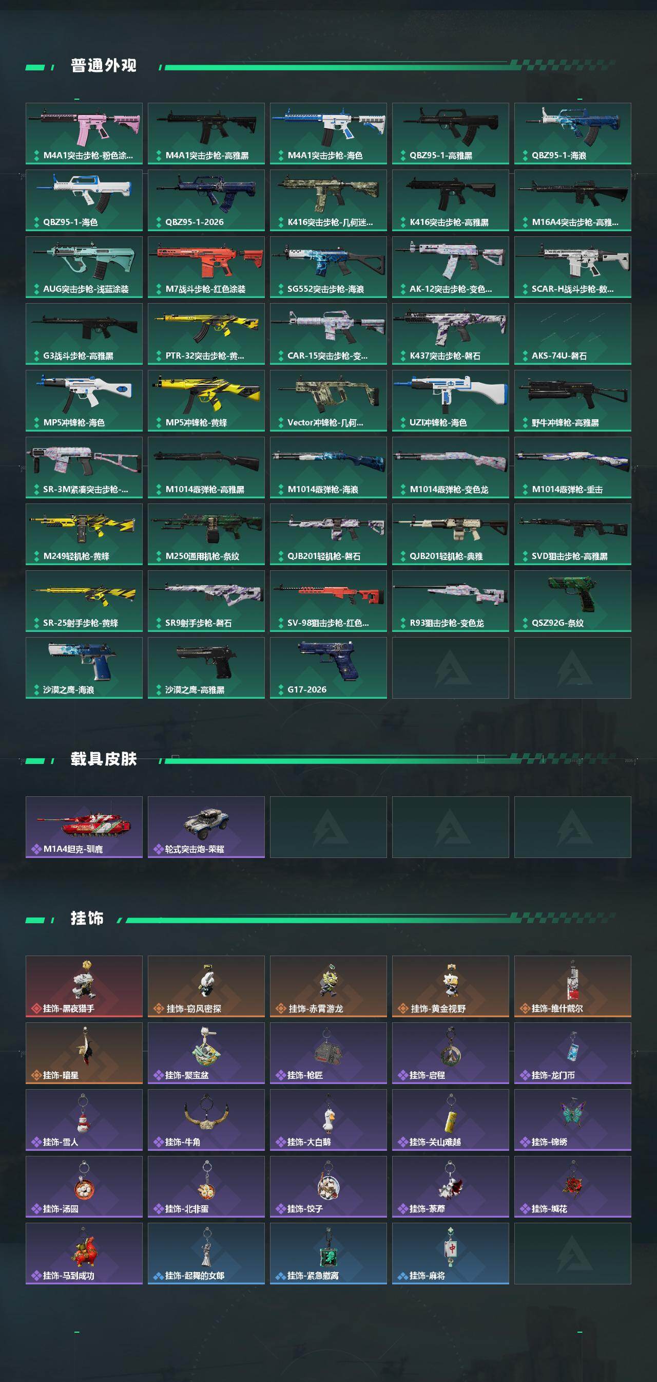 【稀有外观】:M4A1突击步枪-繁盛,AKM突击步枪-肃杀,QBZ95-1突击步枪-公平竞技,ASh-12战斗步枪-繁盛,K416突击步枪-前沿科技,K416突击步枪-一帆风顺,M7战斗步枪-精英联盟,M7战斗步枪-捣蛋鬼,SG552突击步枪-2026,SG552突击步枪-贴花艺术,SCAR-H战斗步枪-荣耀列队,G3战斗步枪-主宰,腾龙突击步枪-冰天雪