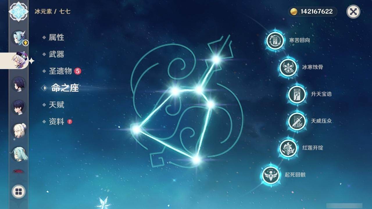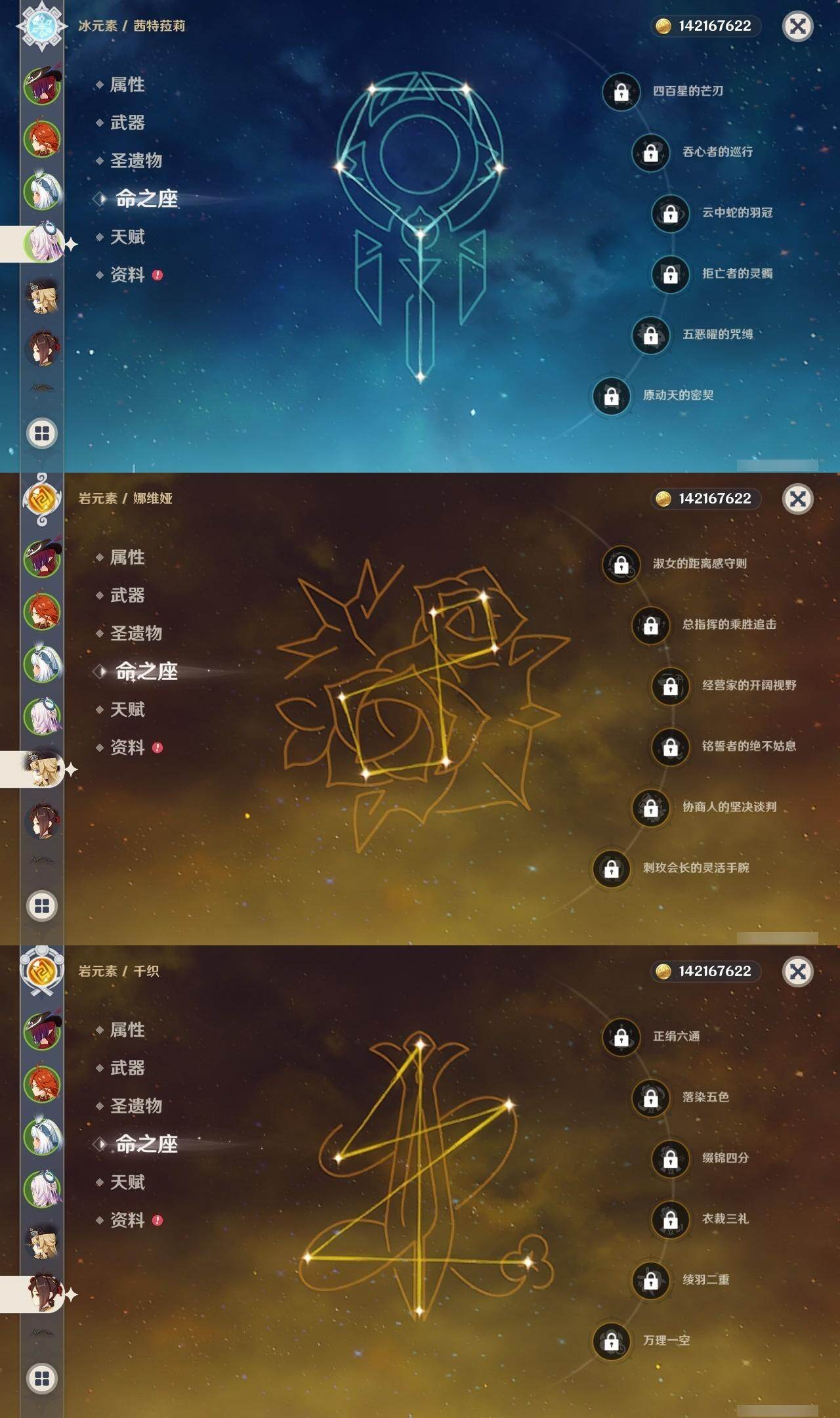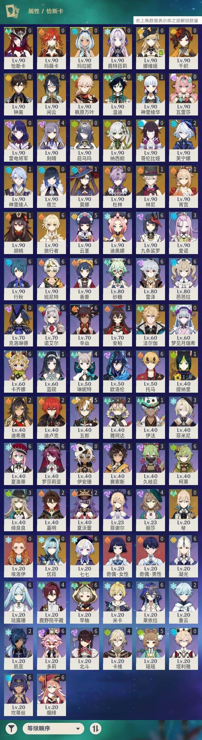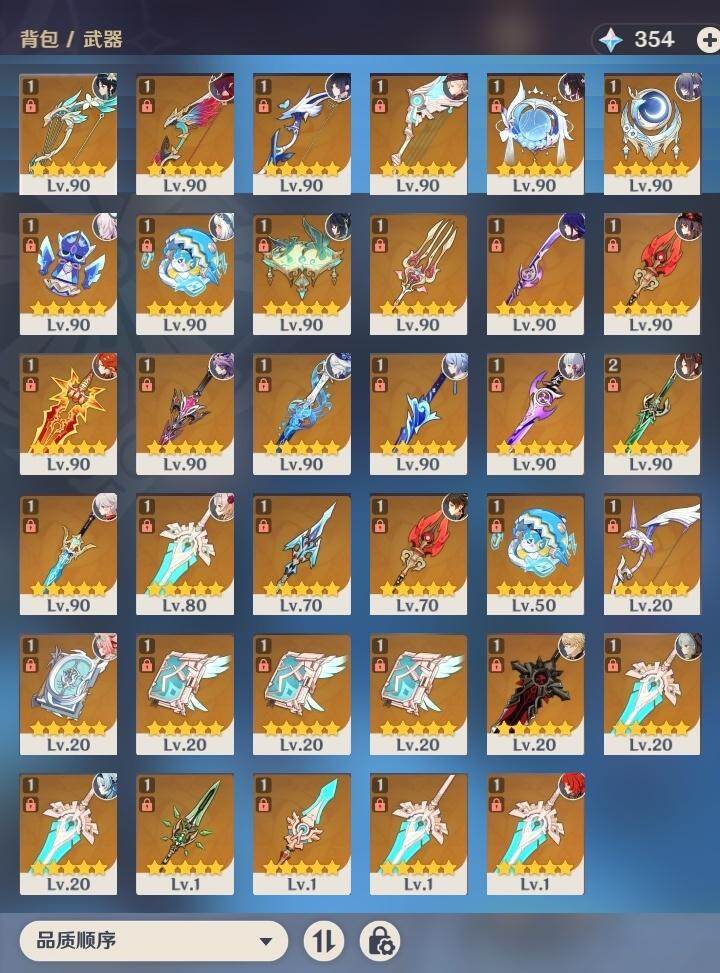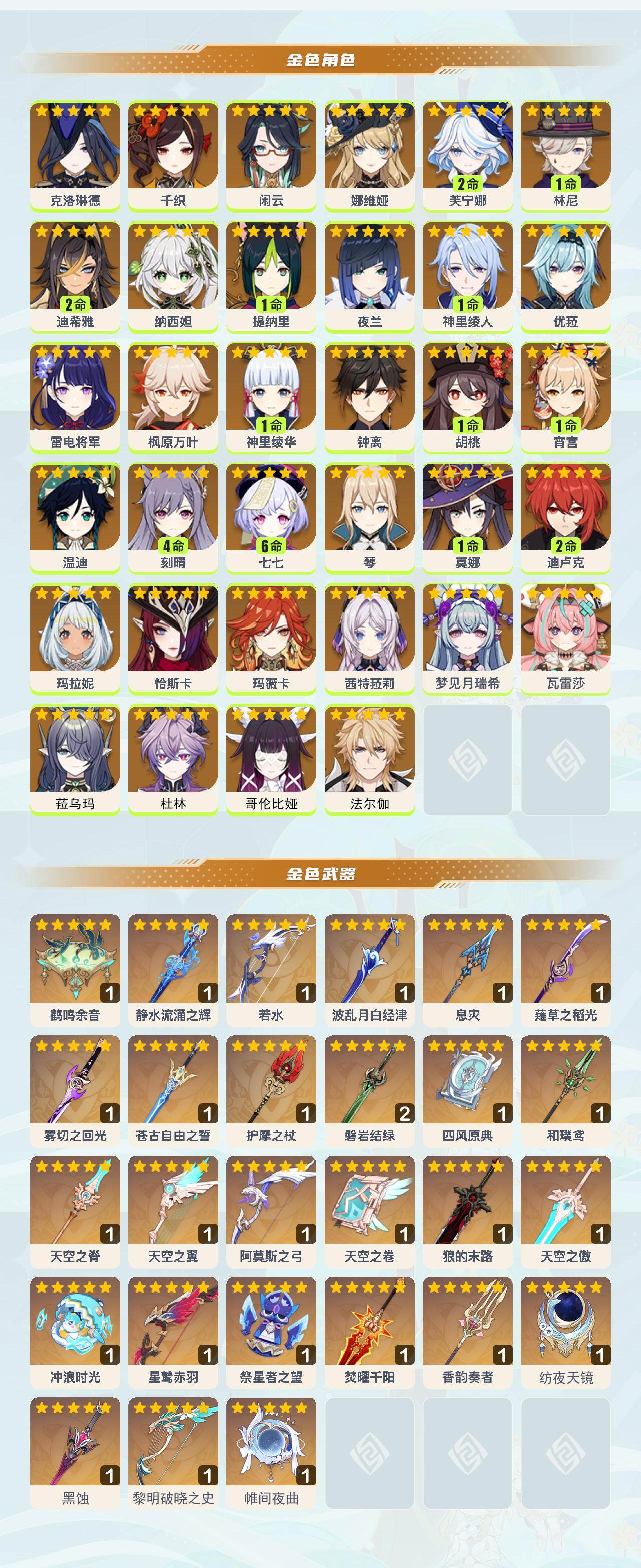 0命克洛琳德,0命千织,0命闲云,0命娜维娅,2命芙宁娜,1命林尼,2命迪希雅,0命纳西妲,1命提纳里,0命夜兰,1命神里绫人,0命优菈,0命雷电将军,0命枫原万叶,1命神里绫华,0命钟离,1命胡桃,1命宵宫,0命温迪,4命刻晴,满命七七,0命琴,1命莫娜,2命迪卢克,0命玛拉妮,0命恰斯卡,0命玛薇卡,0命茜特菈莉,0命梦见月瑞希,0命瓦雷莎,0命菈乌玛,0命杜林,0命哥伦比娅,0命法尔伽,精1鹤鸣余音,精1静水流涌之辉,精1若水,精1波乱月白经津,精1息灾,精1薙草之稻光,精1雾切之回光,精1苍古自由之誓,精1护摩之杖,精2磐岩结绿,精1四风原典,精1和璞鸢,精1天空之脊,精1天空之翼,精1阿莫斯之弓,精1天空之卷,精1狼的末路,精1天空之傲,精1冲浪时光,精1星鹫赤羽,精1祭星者之望,精1焚曜千阳,精1香韵奏者,精1纺夜天镜,精1黑蚀,精1黎明破晓之史,精1帷间夜曲