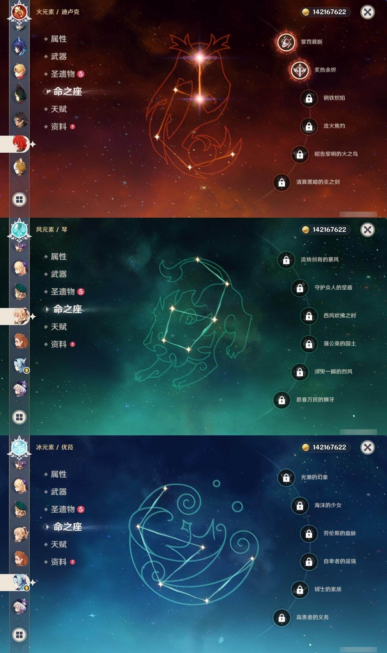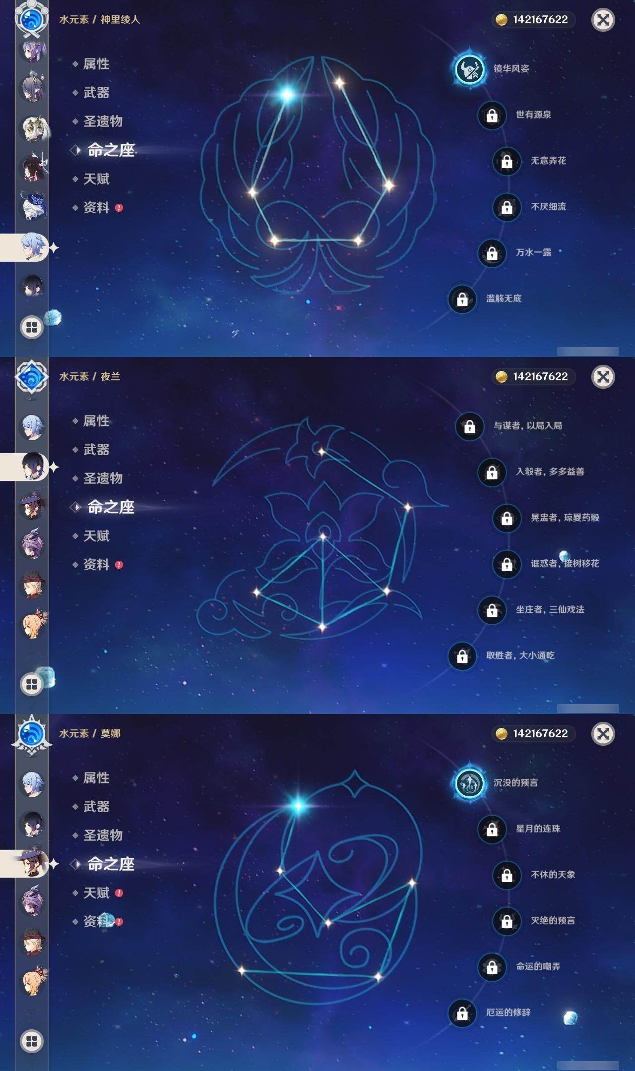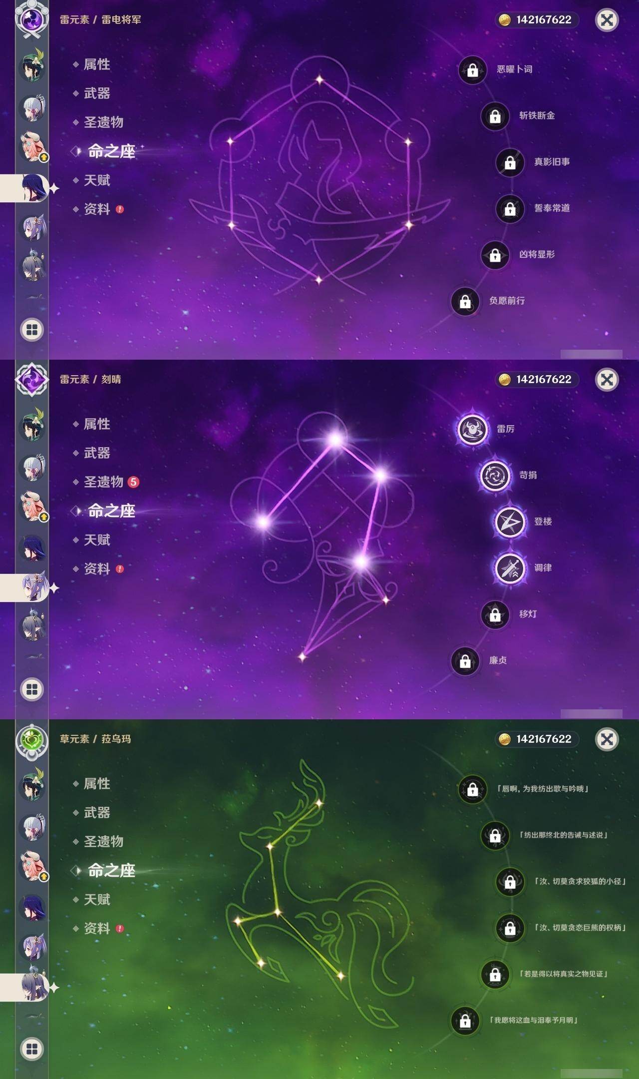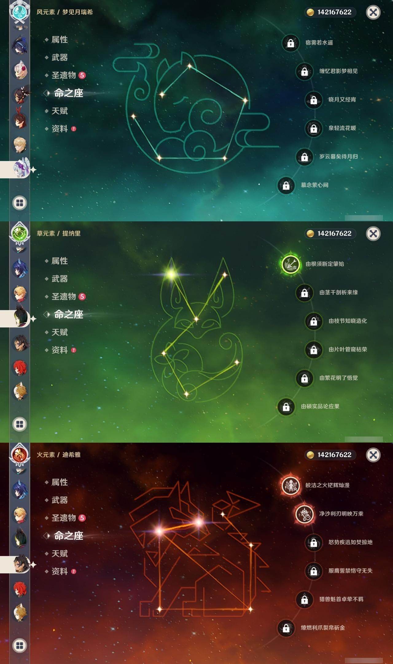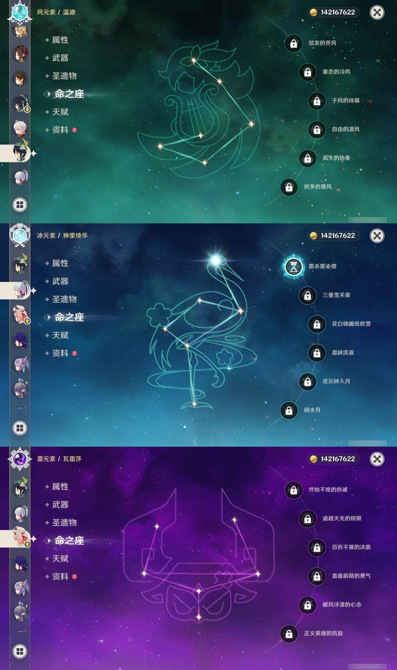 0命克洛琳德,0命千织,0命闲云,0命娜维娅,2命芙宁娜,1命林尼,2命迪希雅,0命纳西妲,1命提纳里,0命夜兰,1命神里绫人,0命优菈,0命雷电将军,0命枫原万叶,1命神里绫华,0命钟离,1命胡桃,1命宵宫,0命温迪,4命刻晴,满命七七,0命琴,1命莫娜,2命迪卢克,0命玛拉妮,0命恰斯卡,0命玛薇卡,0命茜特菈莉,0命梦见月瑞希,0命瓦雷莎,0命菈乌玛,0命杜林,0命哥伦比娅,0命法尔伽,精1鹤鸣余音,精1静水流涌之辉,精1若水,精1波乱月白经津,精1息灾,精1薙草之稻光,精1雾切之回光,精1苍古自由之誓,精1护摩之杖,精2磐岩结绿,精1四风原典,精1和璞鸢,精1天空之脊,精1天空之翼,精1阿莫斯之弓,精1天空之卷,精1狼的末路,精1天空之傲,精1冲浪时光,精1星鹫赤羽,精1祭星者之望,精1焚曜千阳,精1香韵奏者,精1纺夜天镜,精1黑蚀,精1黎明破晓之史,精1帷间夜曲