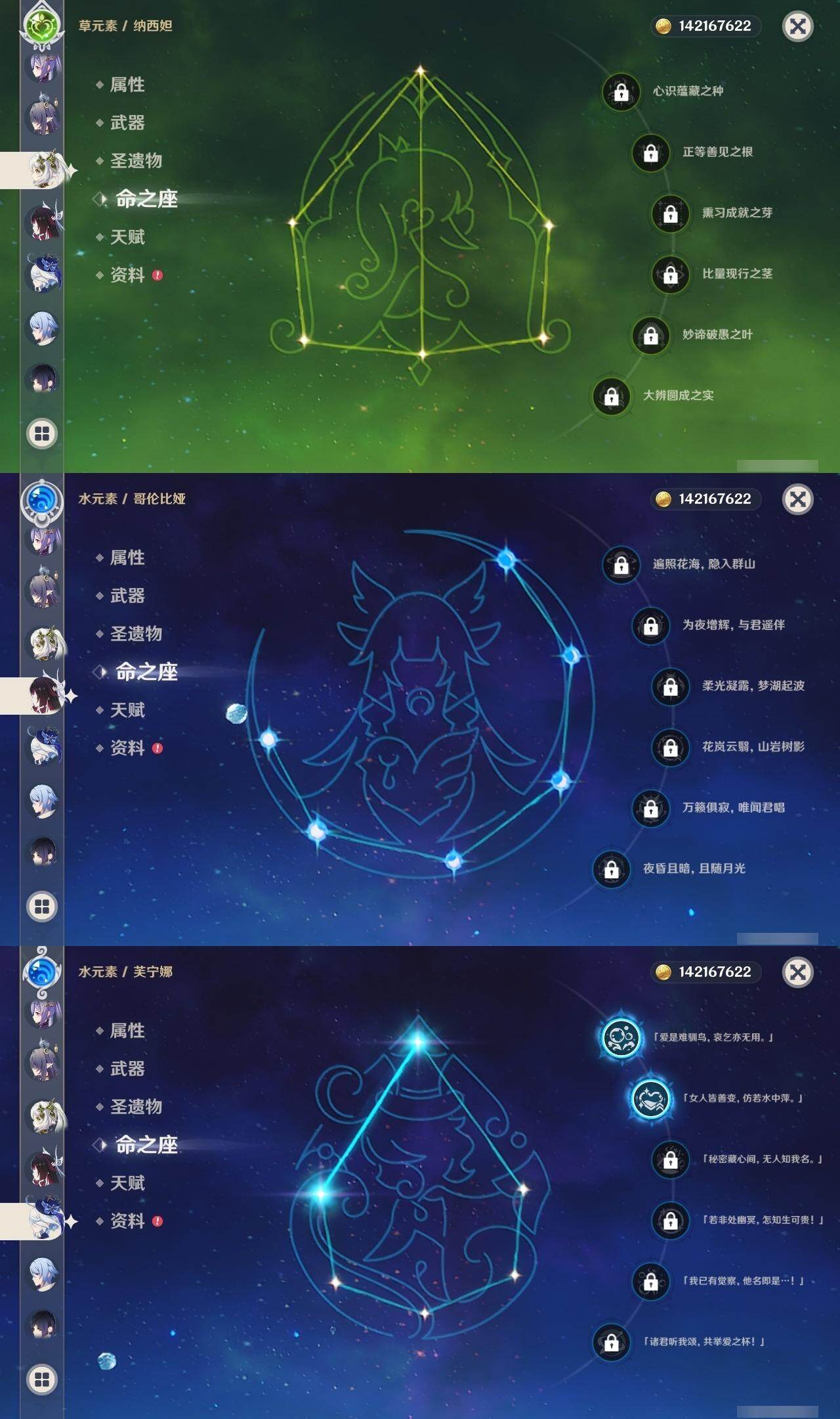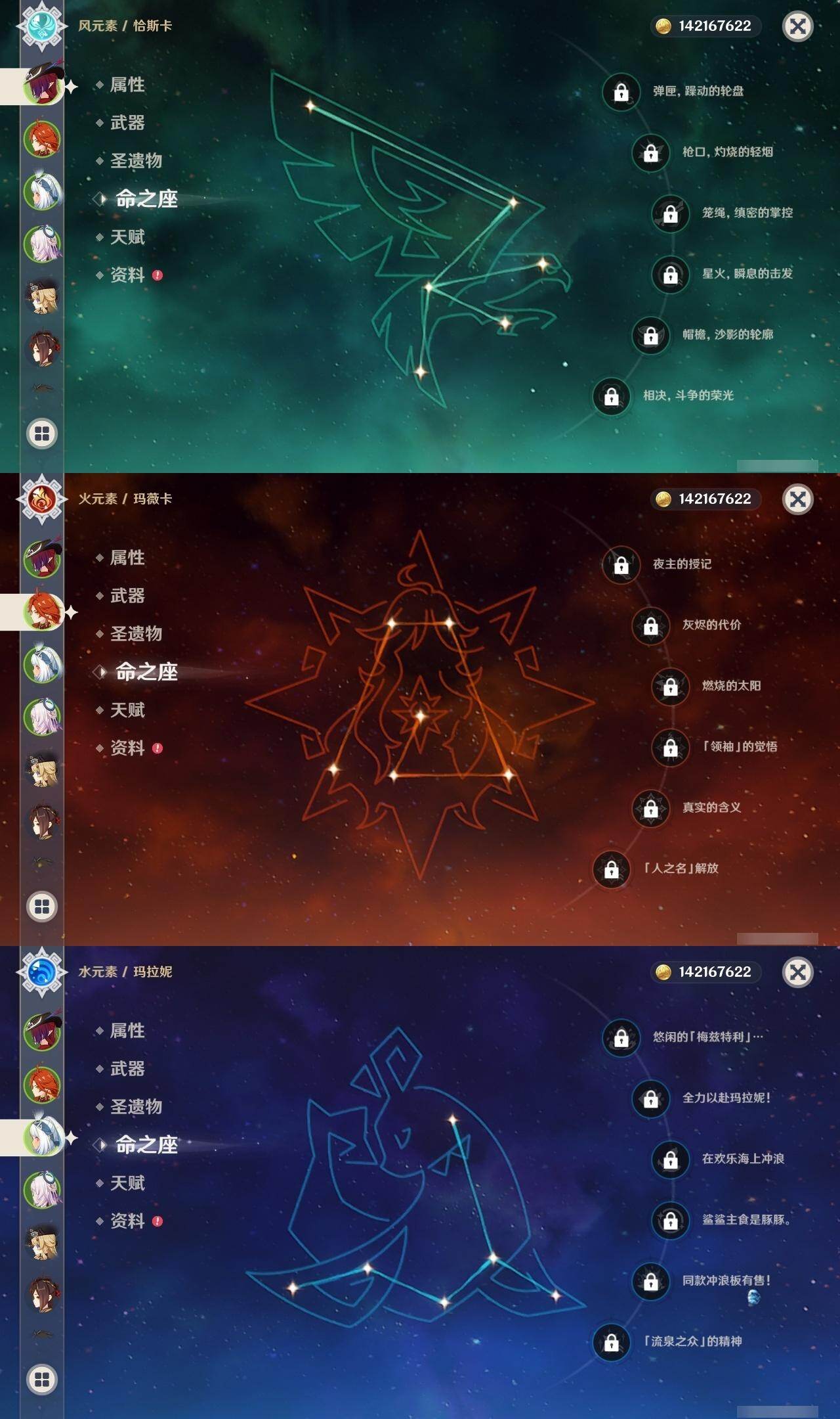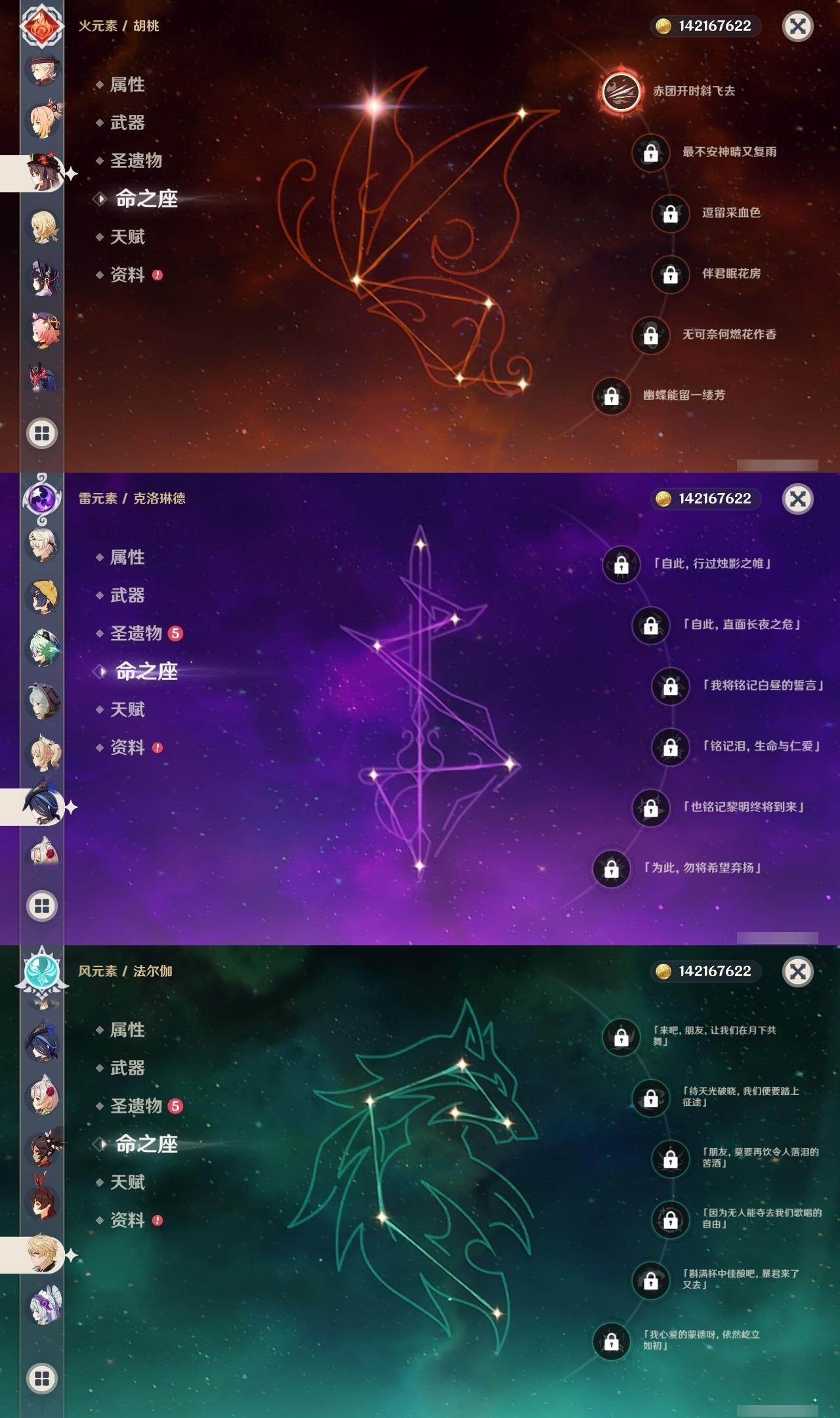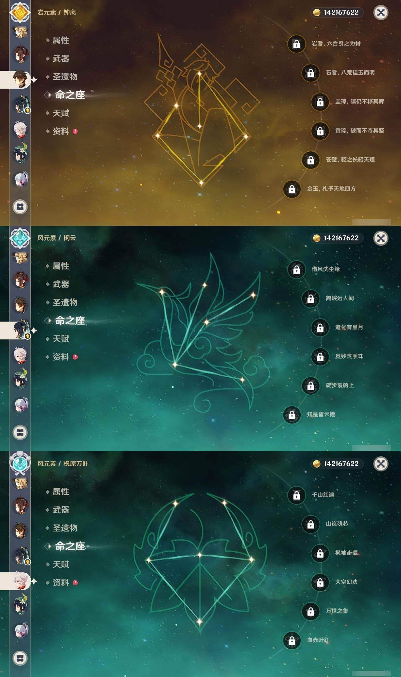 0命克洛琳德,0命千织,0命闲云,0命娜维娅,2命芙宁娜,1命林尼,2命迪希雅,0命纳西妲,1命提纳里,0命夜兰,1命神里绫人,0命优菈,0命雷电将军,0命枫原万叶,1命神里绫华,0命钟离,1命胡桃,1命宵宫,0命温迪,4命刻晴,满命七七,0命琴,1命莫娜,2命迪卢克,0命玛拉妮,0命恰斯卡,0命玛薇卡,0命茜特菈莉,0命梦见月瑞希,0命瓦雷莎,0命菈乌玛,0命杜林,0命哥伦比娅,0命法尔伽,精1鹤鸣余音,精1静水流涌之辉,精1若水,精1波乱月白经津,精1息灾,精1薙草之稻光,精1雾切之回光,精1苍古自由之誓,精1护摩之杖,精2磐岩结绿,精1四风原典,精1和璞鸢,精1天空之脊,精1天空之翼,精1阿莫斯之弓,精1天空之卷,精1狼的末路,精1天空之傲,精1冲浪时光,精1星鹫赤羽,精1祭星者之望,精1焚曜千阳,精1香韵奏者,精1纺夜天镜,精1黑蚀,精1黎明破晓之史,精1帷间夜曲