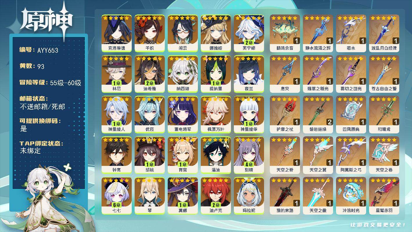 [17363170]60级/93黄/女主/34个五星角色/35个五星武器 0命克洛琳德,0命千织,0命闲云,0命娜维娅,2命芙宁娜,1命林尼,2命迪希雅,0命纳西妲,1命提纳里,0命夜兰,1命神里绫人,0命优菈,0命雷电将军,0命枫原万叶,1命神里绫华,0命钟离,1命胡桃,1命宵宫,0命温迪,4命刻晴,满命七七,0命琴,1命莫娜,2命迪卢克,0命玛拉妮,0命恰斯卡,0命玛薇卡,0命茜特菈莉,0命梦见月瑞希,0命瓦雷莎,0命菈乌玛,0命杜林,0命哥伦比娅,0命法尔伽,精1鹤鸣余音,精1静水流涌之辉,精1若水,精1波乱月白经津,精1息灾,精1薙草之稻光,精1雾切之回光,精1苍古自由之誓,精1护摩之杖,精2磐岩结绿,精1四风原典,精1和璞鸢,精1天空之脊,精1天空之翼,精1阿莫斯之弓,精1天空之卷,精1狼的末路,精1天空之傲,精1冲浪时光,精1星鹫赤羽,精1祭星者之望,精1焚曜千阳,精1香韵奏者,精1纺夜天镜,精1黑蚀,精1黎明破晓之史,精1帷间夜曲