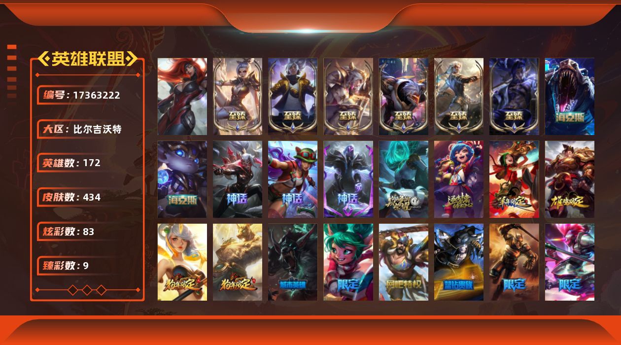 未定级段位-172英雄-434皮肤-83炫彩-1终极-14神话-52限定-45传说-108史诗