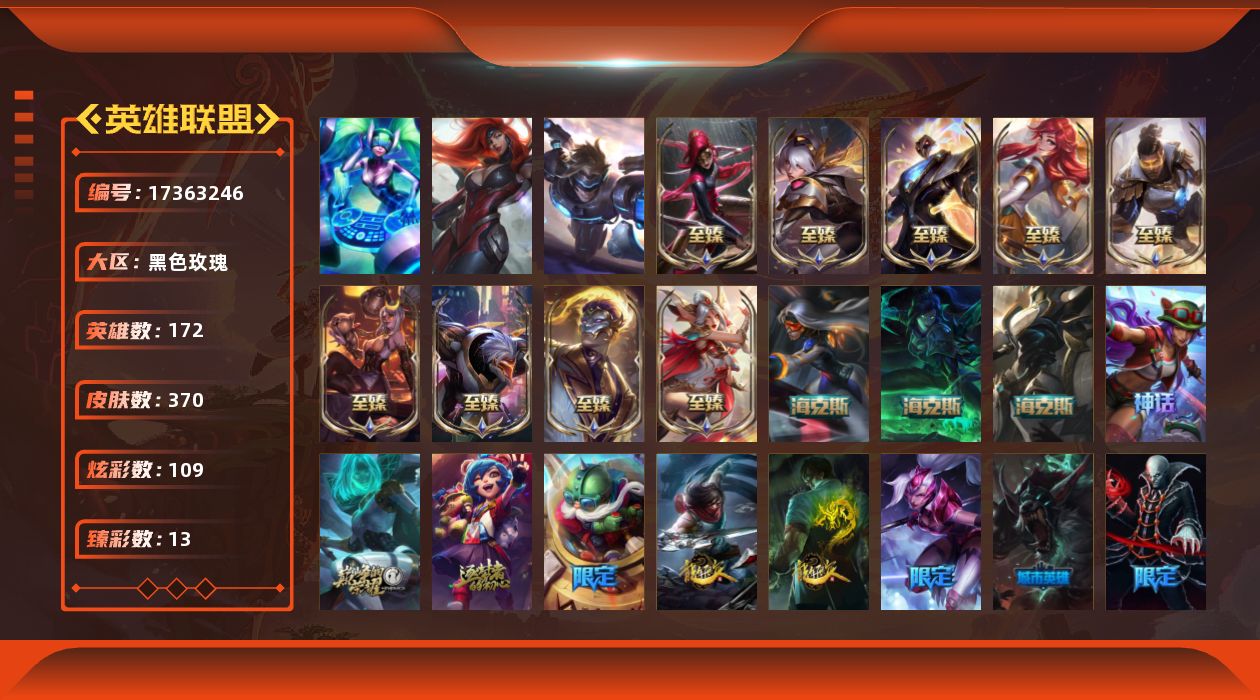 [17363246]铂金段位-172英雄-370皮肤-109炫彩-3终极-17神话-50限定-52传说-54史诗