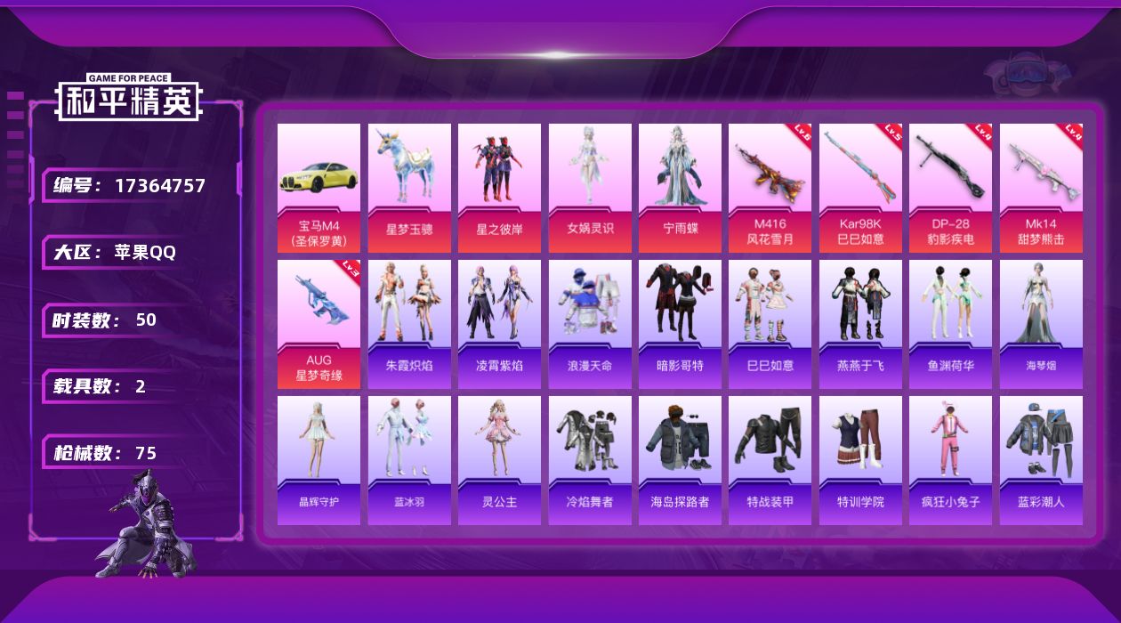 [17364757]苹果 手Q-3粉装-7特效枪-2载具-2粉色飞行器-26805热力值-2王牌印记-50套装-75枪皮