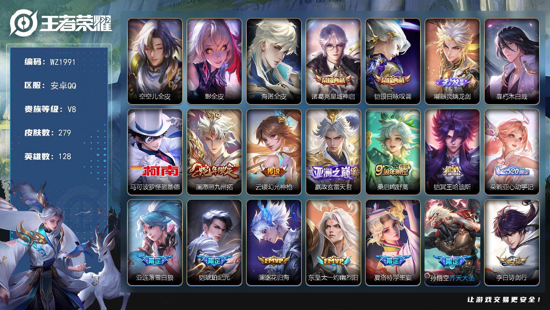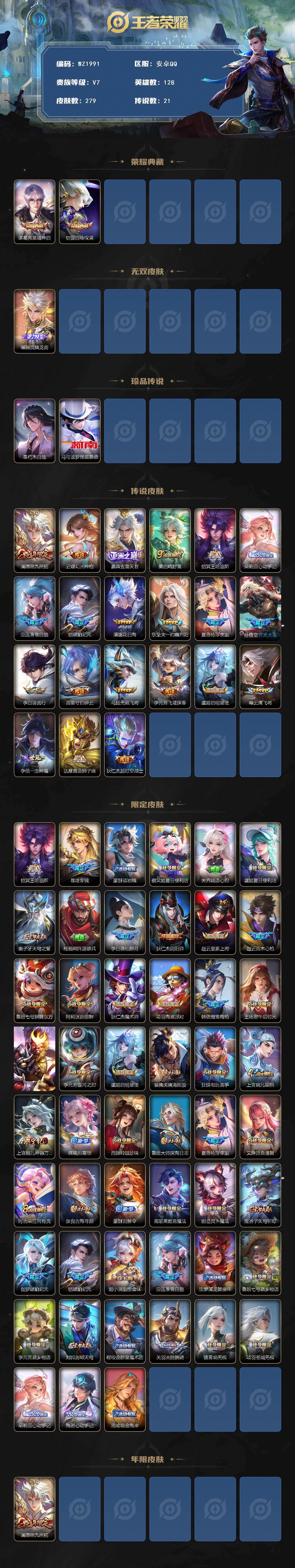 [17350271]安卓Q-V7-永恒钻石I段位-128英雄-279皮肤-2典藏皮肤-1无双-2珍品传说-21传说-87史诗