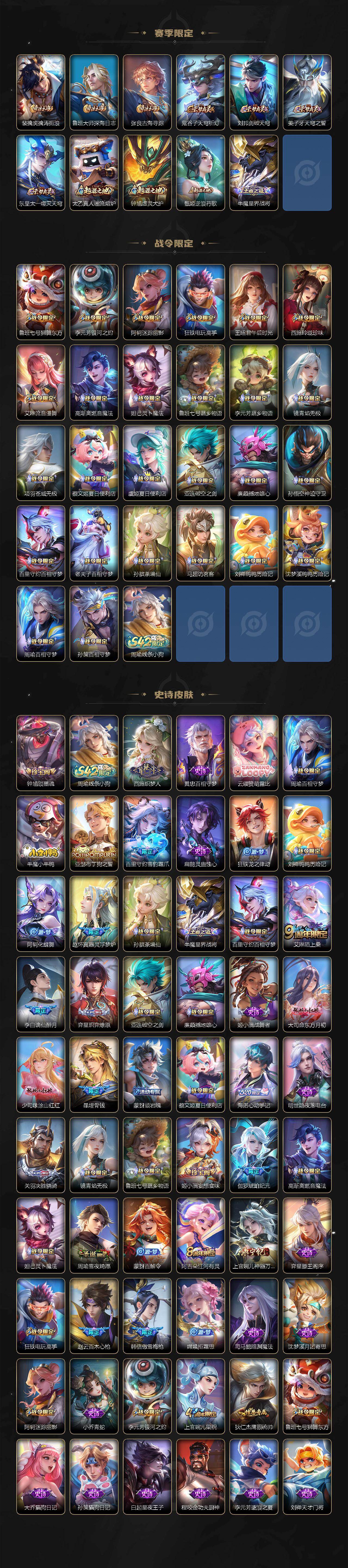 【战令限定】:鲁班七号狮舞东方,李元芳银河之约,阿轲迷踪丽影,狂铁电玩高手,王昭君午后时光,西施玲珑珍味,艾琳流音漫舞,高渐离燃音魔法,妲己灵卜魔法,鲁班七号蔬乡物语,李元芳蔬乡物语,镜青焰无极,项羽苍威无极,蔡文姬夏日便利店,虞姬夏日便利店,亚连破空之剑,廉颇撼地雄心,孙悟空神迹守卫,百里守约百相守梦,老夫子百相守梦,孙膑茶境仙,马超访茗客,刘禅鸭鸭历险记,沈梦溪鸭鸭历险记,周瑜百相守梦,孙策百相守梦,周瑜线条小狗