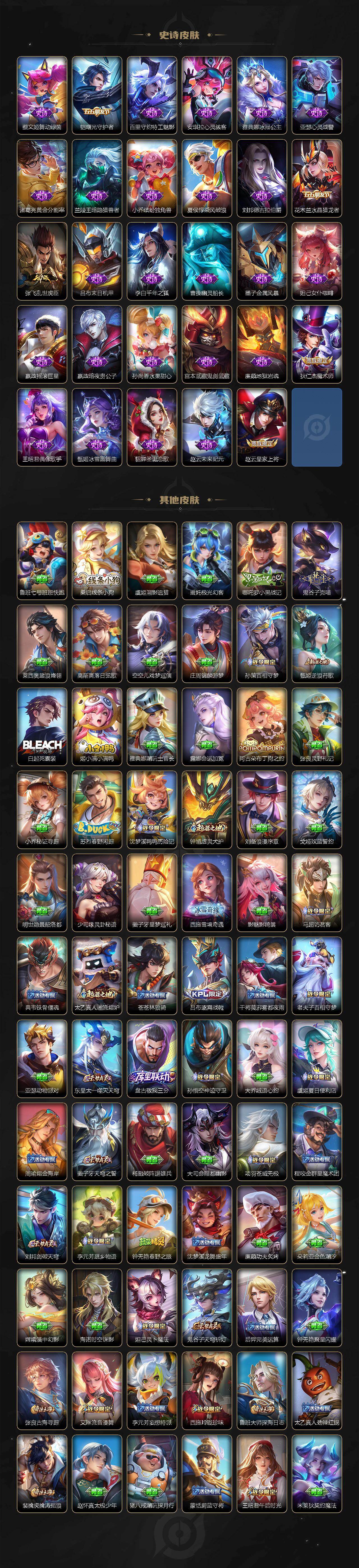 - [11606894]V10 4典藏 5无双 2珍品传说 63传说 125英雄 519皮肤 可修改实名 优质装备:天鹅之梦(小乔典藏),鸣剑·曳影,弑枪猎影(韩信典藏),青丘·九尾(妲己无双),碎月剑心(李白无双),韩信群星魔术团(韩信无双),花合斗,离恨烟(公孙离无双),最初的交响(伽罗典藏),怪盗基德,黄金狮子座,黄金射手座,云鹰飞将(小将军),绛天战甲(鸡嘴战神),黄金白羊座,猫影幻舞,久胜战神,炽阳神光,一念神魔,云霓雀翎,末日机甲-孙尚香(绿蚂蚱),地狱火,仲夏夜之梦(大飞蛾),音你心动-小乔,地狱之眼,飞鸢探春,音你心动-周瑜,胖达荣荣,乞巧织情,时之恋人-刘备(电焊工),游龙清影(小青龙),淬星耀世,遇见胡旋,末日机甲-孙策,无双飞将,碎云,天秀幻梦,神器·狴犴令,山海·炽霜斩(李信年限),炽翼辉光(娃娃菜牛角包),画中仙,浮生妄,青丘·九尾,灼幽烈阳,妄想实况,惊梅引,小动物乐团,霜月吟,澜逐花归海,艾琳觅芳踪,黄金天蝎座,云中君群星魔术团,朵莉亚心动手记,牧神诗旅,玄雷天君 珍品传说:兔狲·蓬尾 传说皮:铠冥王哈迪斯 珍宝阁皮:妄想食味,女武神,玩趣恶龙 限定皮:愿照·九州拓(澜年限),愿照·千秋盛(女娲年限),逐霄战戟,映山客,陌上桑,鸣野蒿,夏侯惇霜北刀,至尊宝,白虎志(电光耗子),凤求凰(白切鸡),凤凰于飞,太华(伽罗年限),异界灵契(白毛香),傲雪梅枪,补天,前尘镜,时之彼端,白鹤梁神女,魔法小厨娘,白晶晶,时雨天司(水龙头),神威(电光马子),玄嵩(庄周年限),瑞麟志(木兰年限),至美·乘鲤谣,遇见飞天,高山流水,诗剑行,齐天大圣,怒海麟威,五谷丰年,游园惊梦,梁祝,龙胆,岱宗(典韦年限),虎魄,奔雷神使(牛魔年限),祈雪灵祝(雪兔子),李小龙,玄武志(苏烈年限),朱雀志(守约年限),默契交锋-兰陵王,默契交锋-花木兰,孙行者,猪悟能,一生所爱,大圣娶亲,天魔缭乱,冰霜恋舞曲,云端筑梦师,女儿国国王,寅虎·心曲(虎婆),百木心枪,玉兔公主,唐三藏,匿光启智者,梦圆繁星,山海·玄木吟(马可年限) 史诗皮:鸭鸭历险记-刘禅,苍鳞隐世,器灵·浮梦炉,糖绘人间,化蝶舞,灵蛊蚀心,星界战将,谪仙醉月,龙之律动,小牛鸭,石田雨龙,茶境仙,怒海争锋,炽弈燎原,撼地雄心,破空之剑,战舞者,涂山红红,东方月初,蒙犽顽岩魄,埋骨钱,芈月浮光幕影,海诺心动手记,夜落电台,决胜骁