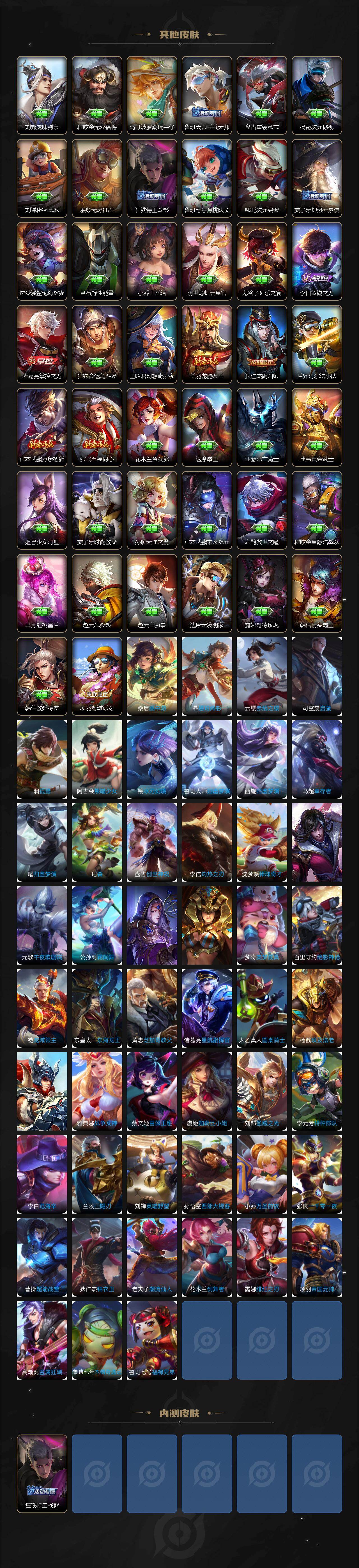 【限定皮肤】:铠冥王哈迪斯,暃埋骨钱,蒙犽顽岩魄,蔡文姬夏日便利店,大乔绒语心约,虞姬夏日便利店,姜子牙天穹之誓,杨戬破阵退雄兵,李白谪仙醉月,狄仁杰阴阳师,赵云皇家上将,赵云百木心枪,鲁班七号狮舞东方,阿轲迷踪丽影,狄仁杰魔术师,项羽海滩派对,韩信傲雪梅枪,王昭君午后时光,孙悟空齐天大圣,李元芳银河之约,虞姬启明星使,裴擒虎擒涛扼浪,狂铁电玩高手,上官婉儿梁祝,上官婉儿神器万象笔,嫦娥拒霜思,西施玲珑珍味,鲁班大师探海日志,夏洛特浮生妄,艾琳流音漫舞,阿古朵江河有灵,张良古海寻踪,蒙犽百解令,高渐离燃音魔法,妲己灵卜魔法,鬼谷子天穹祈灯,伽罗琥珀纪元,铠琥珀纪元,姬小满妄想食味,亚连落雪白狼,沈梦溪龙舞盛年,鲁班七号蔬乡物语,李元芳蔬乡物语,刘邦剑破天穹,程咬金群星魔术团,关羽决胜骁骑,镜青焰无极,项羽苍威无极,朵莉亚心动手记,海诺心动手记,周瑜熔金海岸