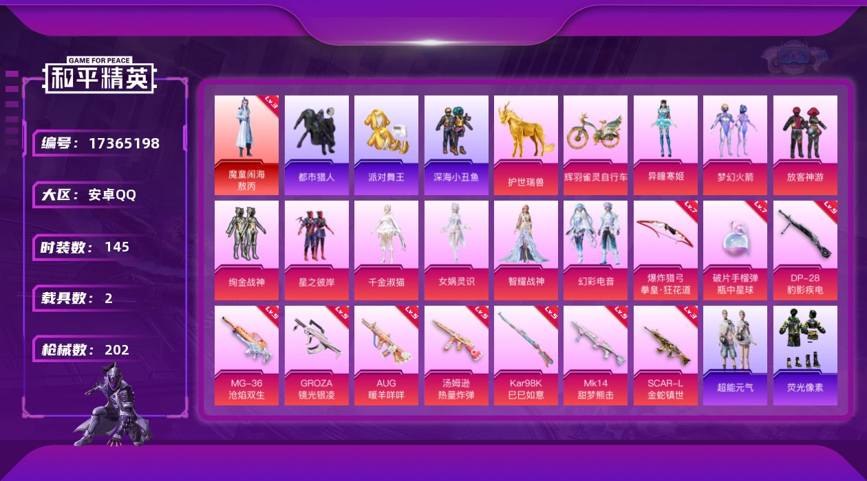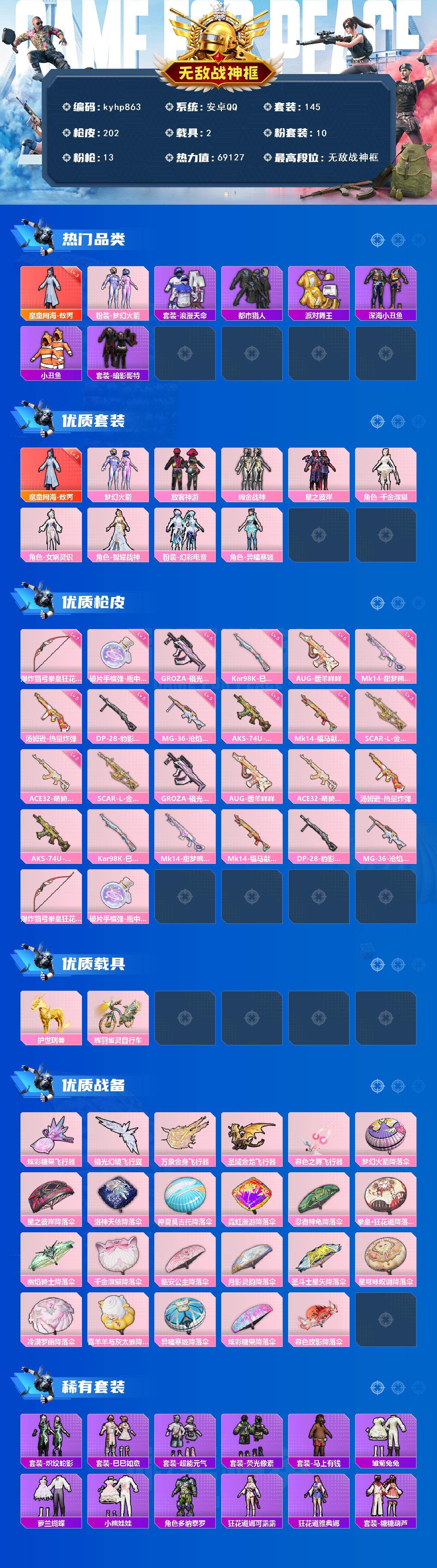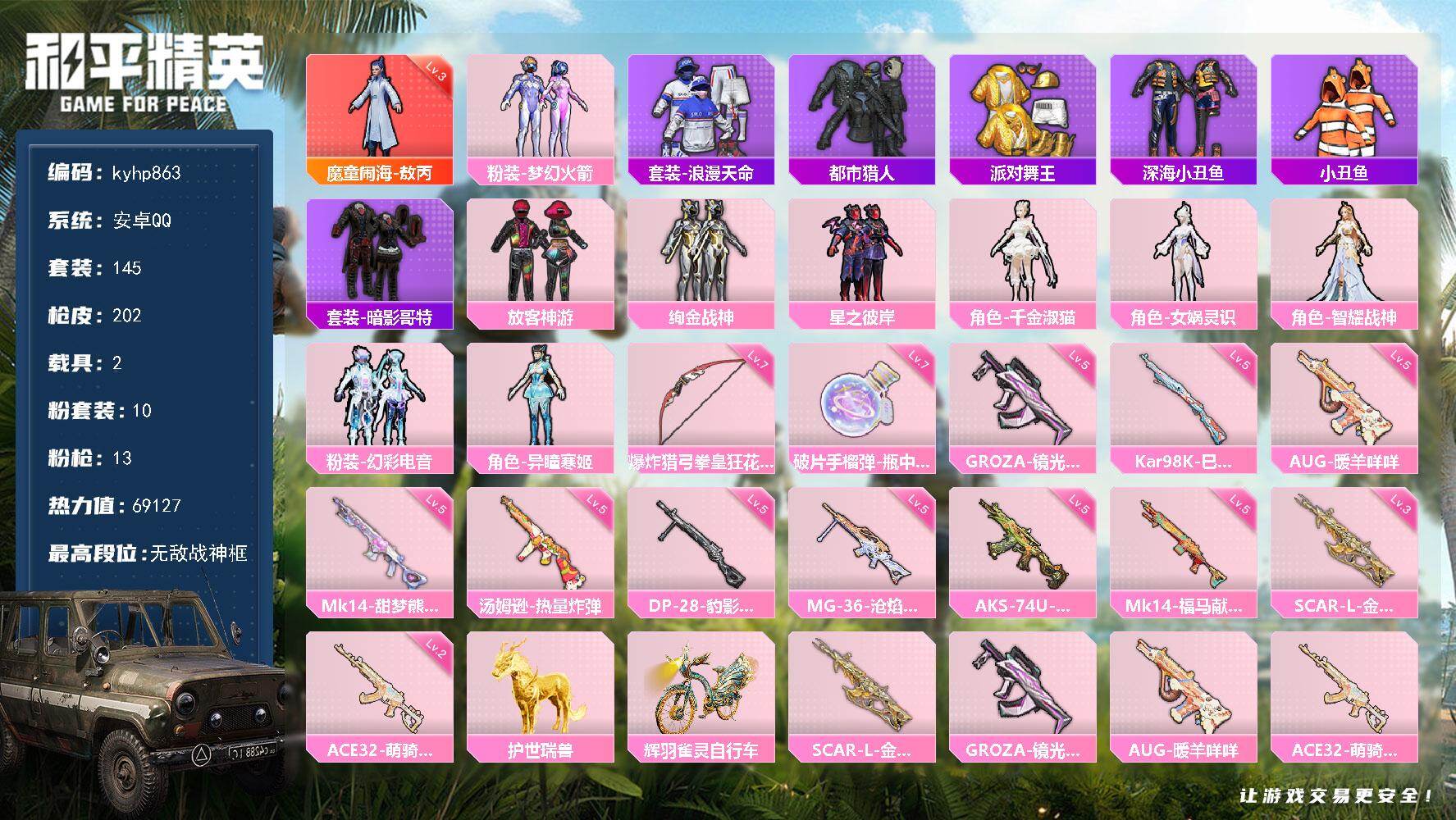 [17365198]安卓 手Q-无敌战神框-1神装-10粉装-13特效枪-2载具-6粉色飞行器-69127热力值-12王牌印记-145套装-202枪皮