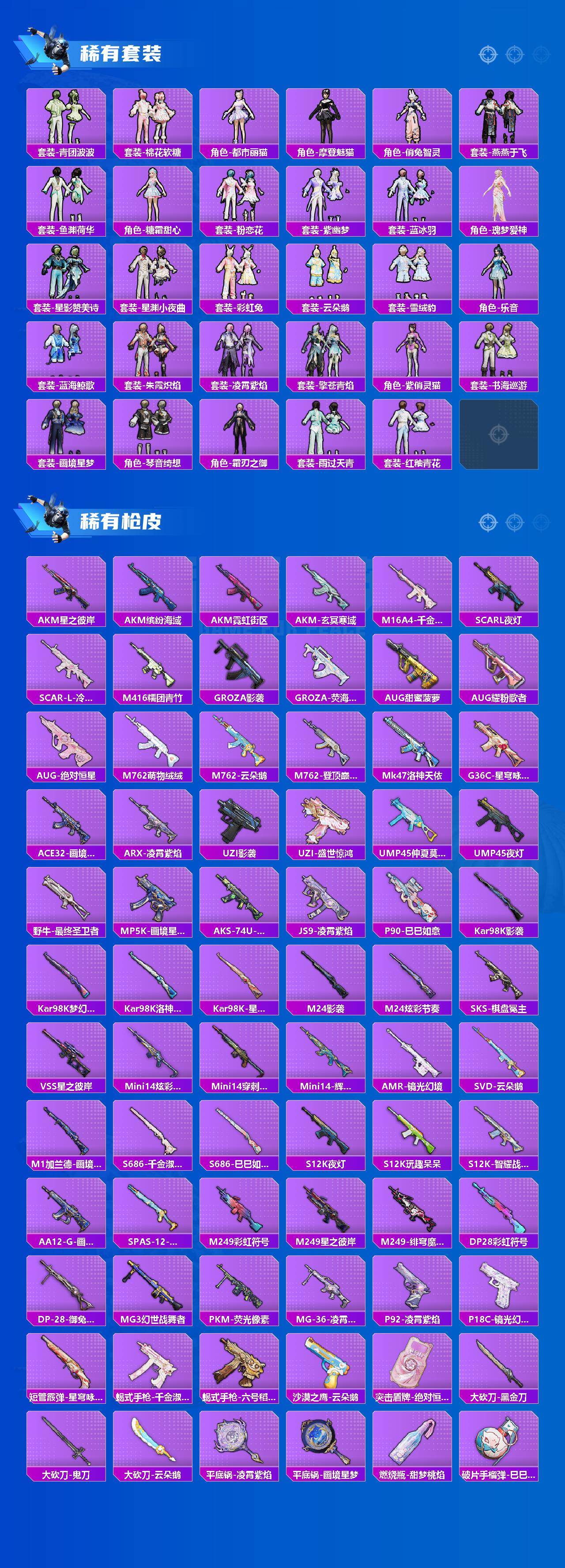 【粉色枪皮】:SCAR-L-金蛇镇世,GROZA-镜光银凌,AUG-暖羊咩咩,ACE32-萌骑漫游,汤姆逊-热量炸弹,AKS-74U-森灵之息,Kar98K-巳巳如意,Mk14-甜梦熊击,Mk14-福马献瑞,DP-28-豹影疾电,MG-36-沧焰双生,爆炸猎弓-拳皇·狂花道,破片手榴弹-瓶中星球