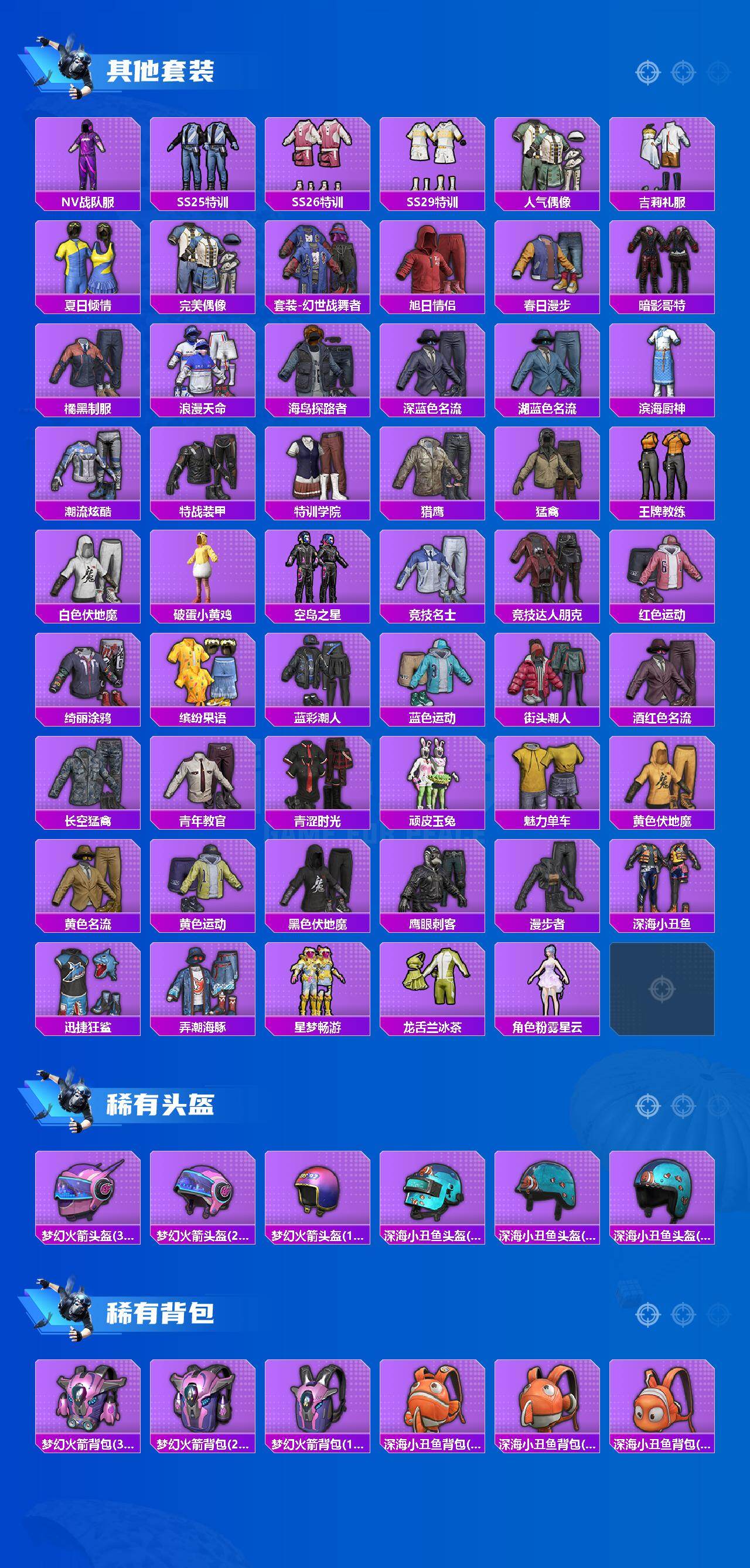 套装-梦幻火箭,套装-都市猎人,套装-派对舞王,套装-深海小丑鱼,套装-放客神游,套装-绚金战神,套装-星之彼岸,角色-千金淑猫,角色-女娲灵识,套装-鹰眼刺客,套装-迅捷狂鲨