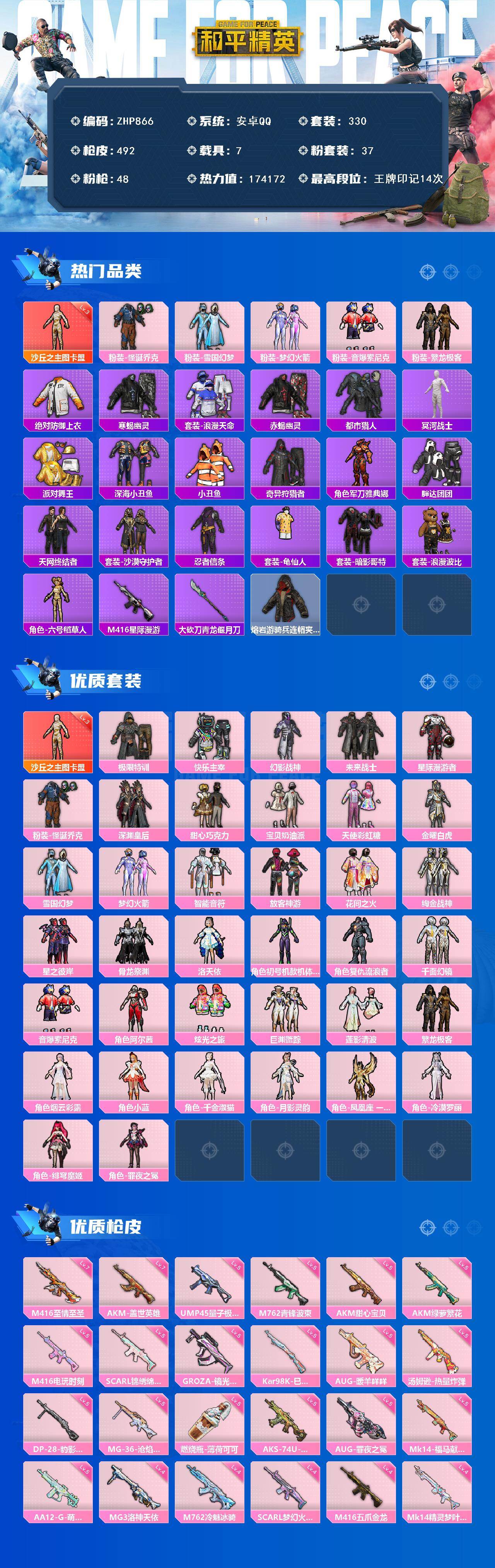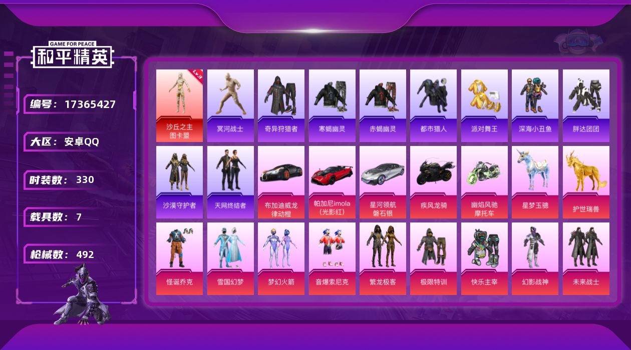 [17365427]极品素材号!连体号!和平连体王者3级图卡盟-3级星梦-雪国-怪诞乔克-三姐妹-赤蝎-派对舞王-都市猎人-暗影哥特-寒蝎-木乃伊-天网-黑丝-童趣头盔-酷熊背包-百万伏特--安卓 手Q-1神装-37粉装-48特效枪-7载具-17粉色飞行器-174172热力值-14王牌印记-330套装-492枪皮-王者-V8-270皮1典藏-2珍品-32传说-1星传