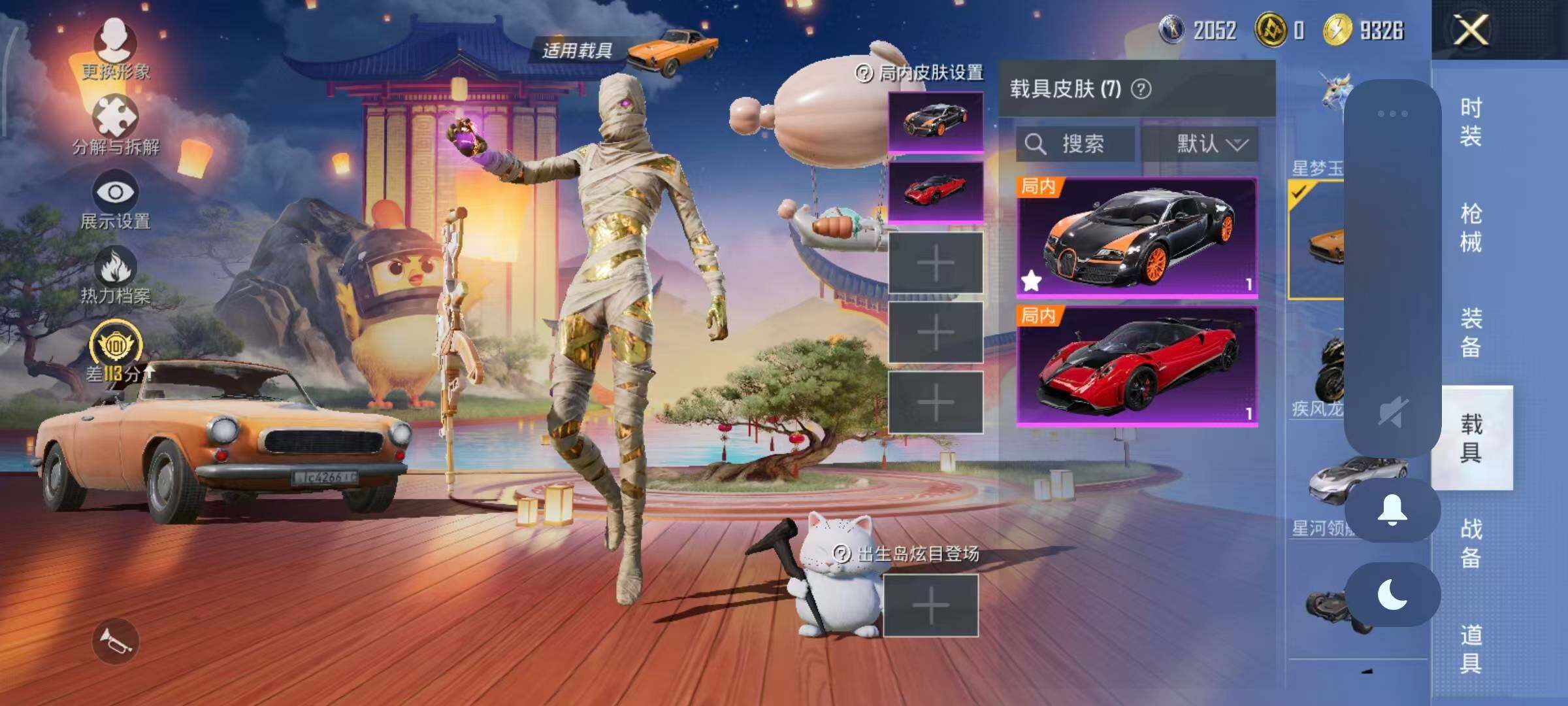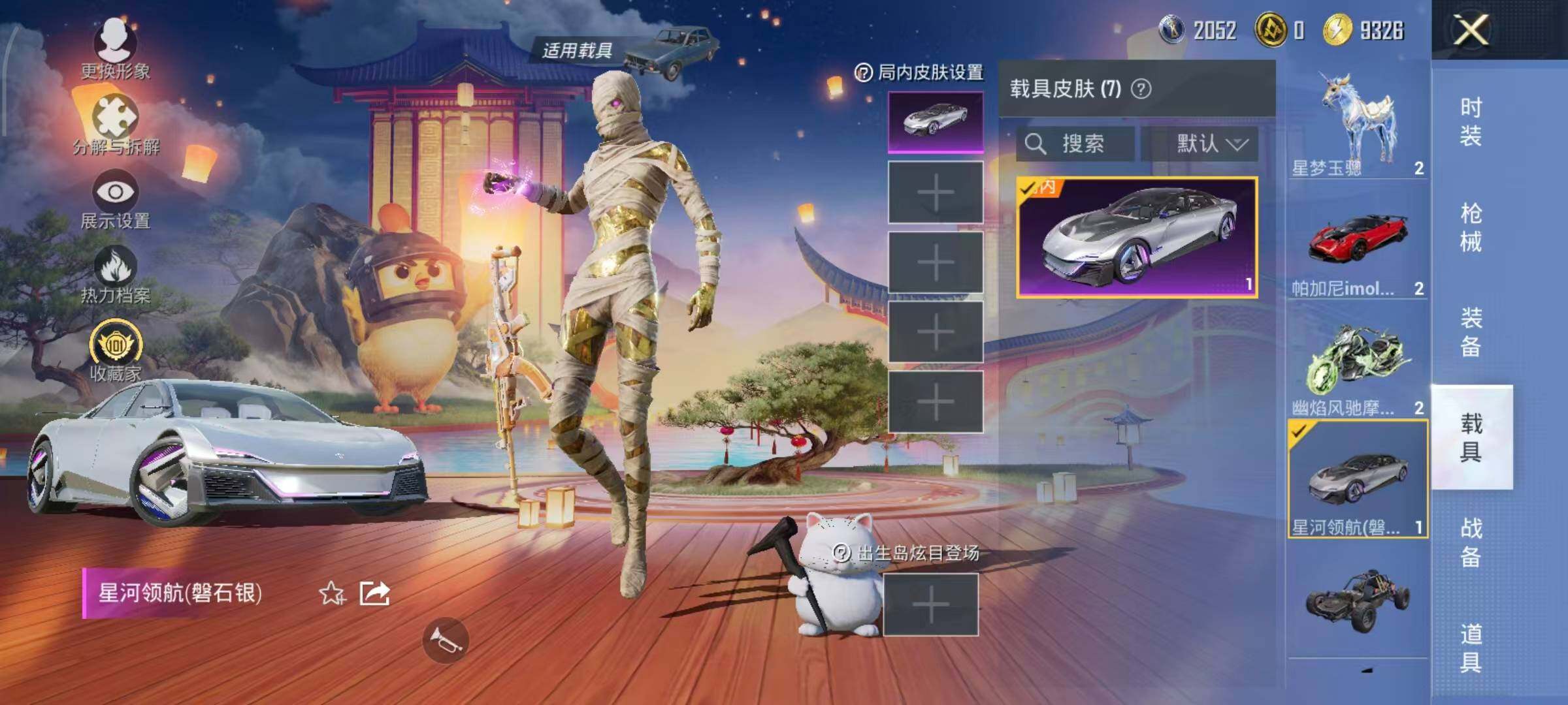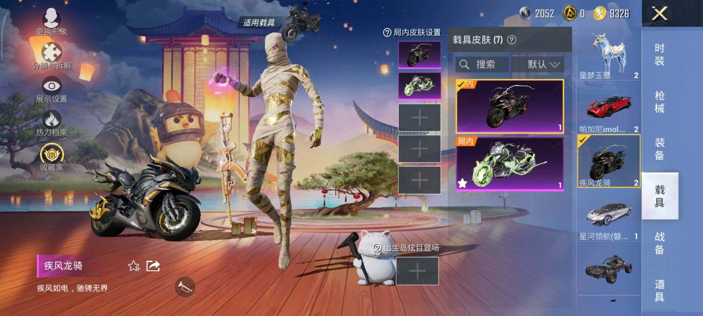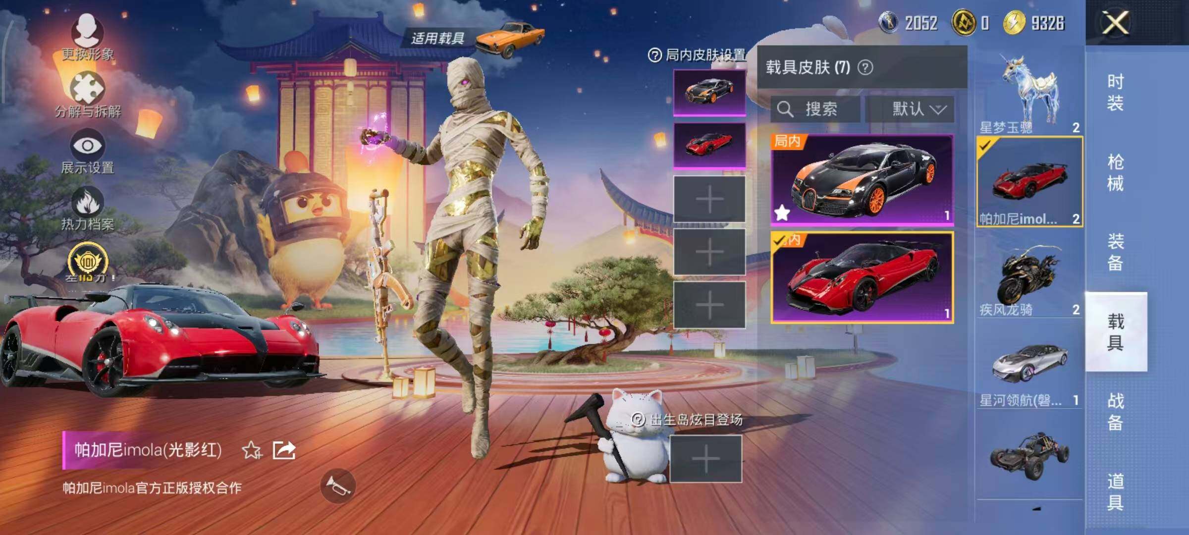 布加迪威龙(律动橙),帕加尼imola(光影红),星河领航(磐石银),疾风龙骑,幽焰风驰摩托车,僚机-萌兔起飞,僚机-圣域龙宝,星梦玉骢,护世瑞兽