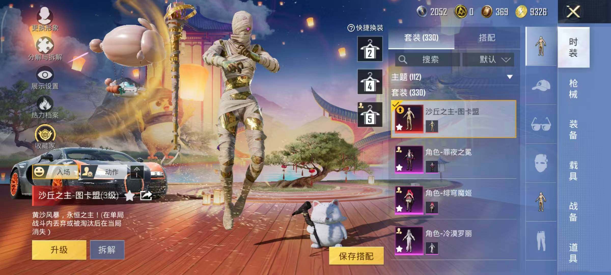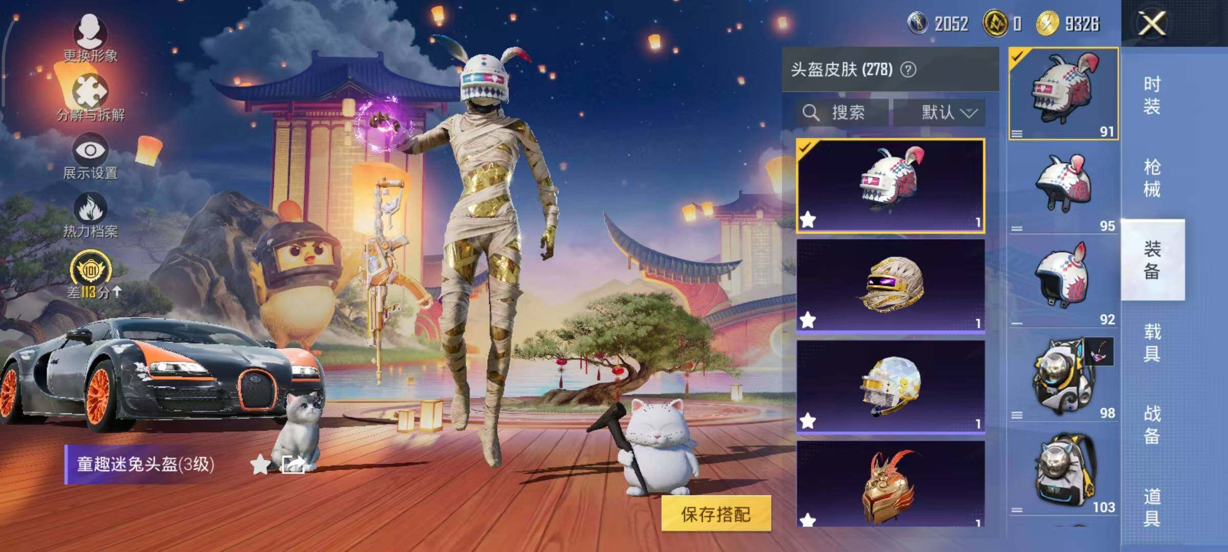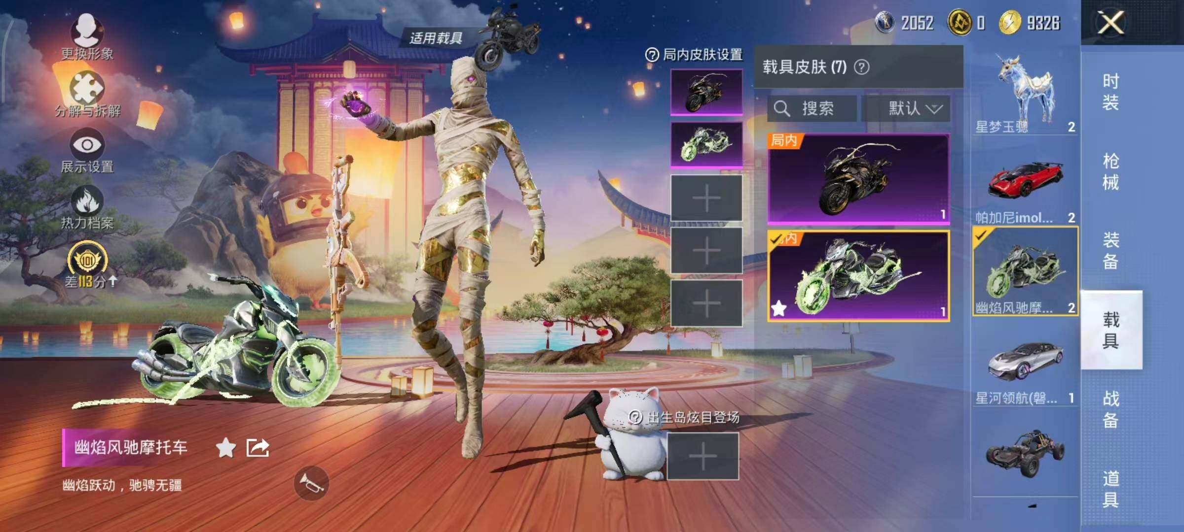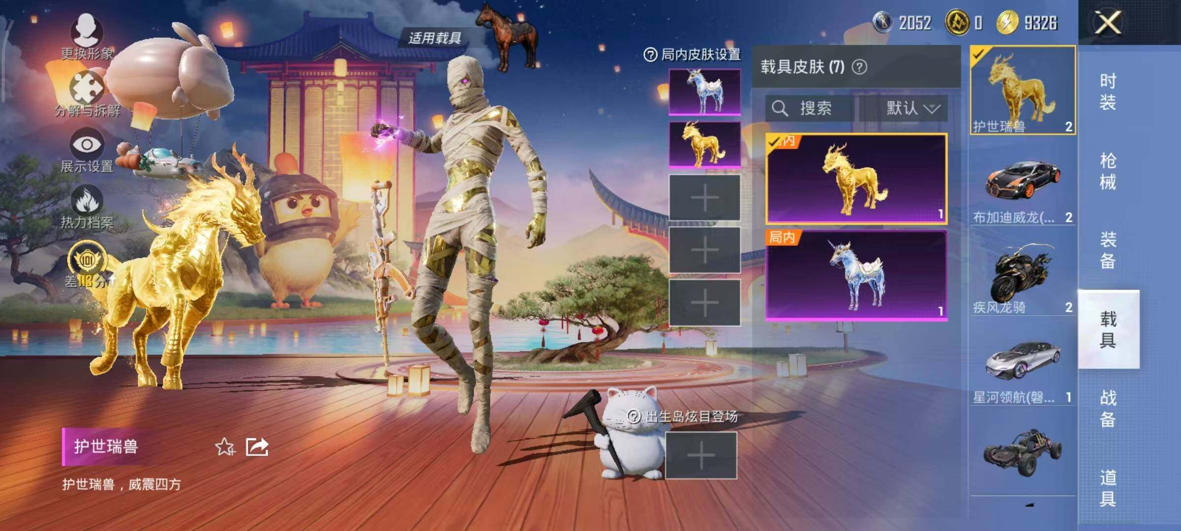 布加迪威龙(律动橙),帕加尼imola(光影红),星河领航(磐石银),疾风龙骑,幽焰风驰摩托车,僚机-萌兔起飞,僚机-圣域龙宝,星梦玉骢,护世瑞兽