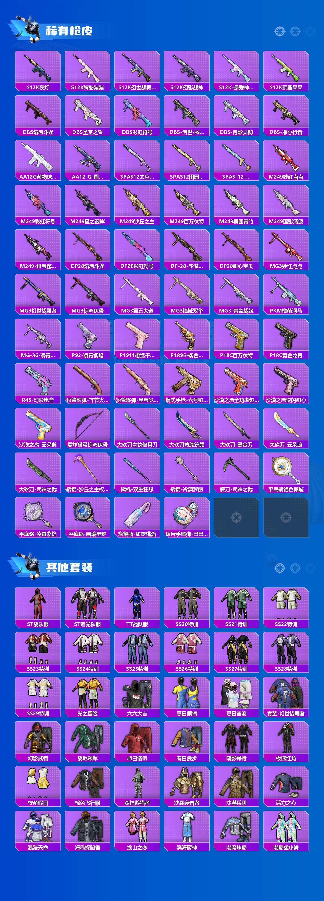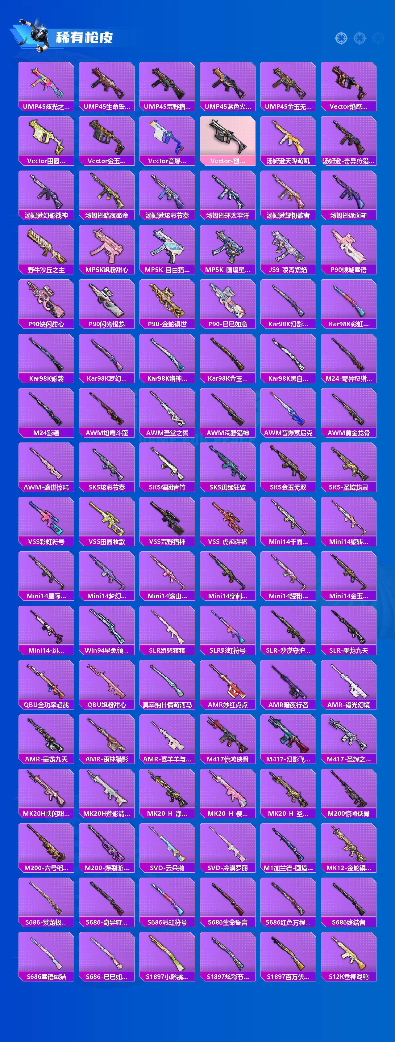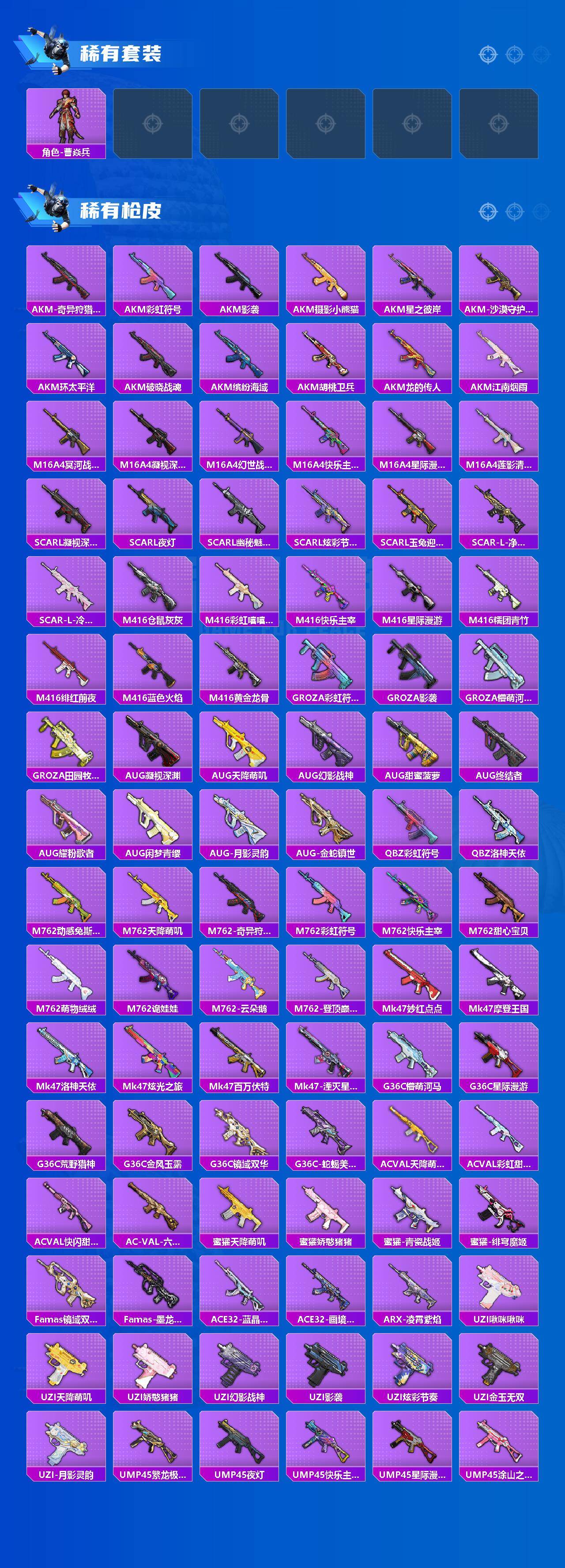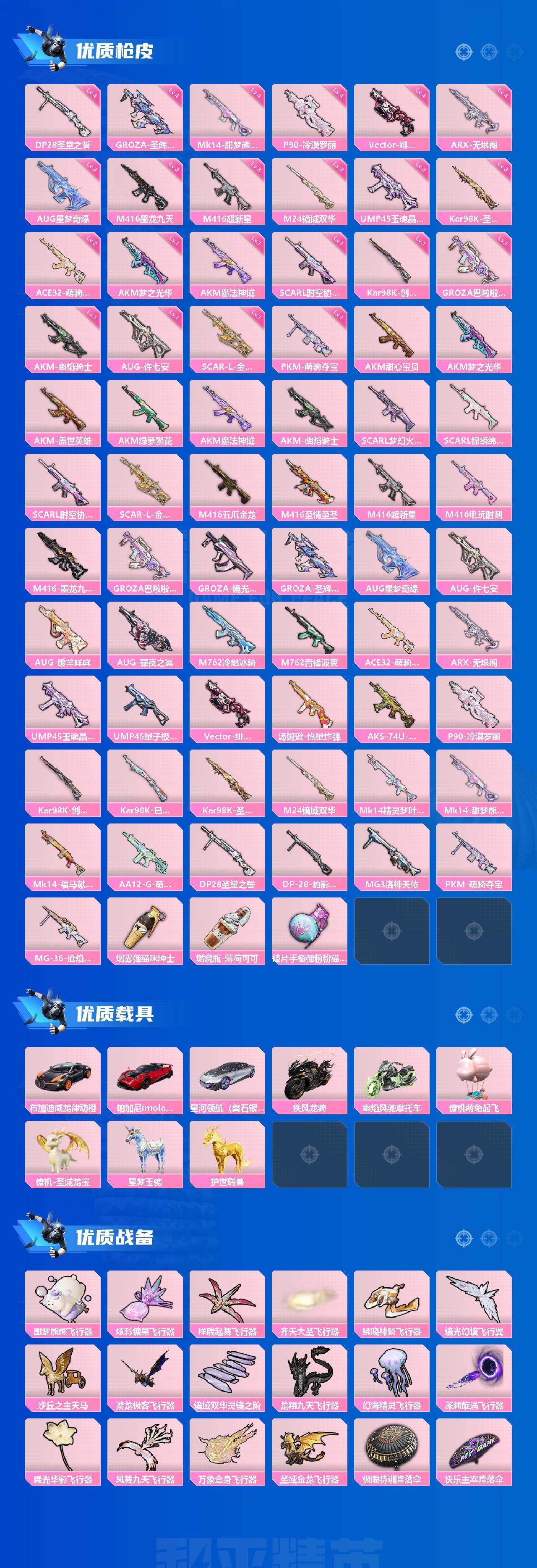 AKM-甜心宝贝,AKM-梦之光华,AKM-盖世英雄,AKM-绿萝繁花,AKM-魔法神域,AKM-幽焰骑士,SCAR-L-梦幻火箭,SCAR-L-锦绣绵绵,SCAR-L-时空协奏,SCAR-L-金蛇镇世,M416-五爪金龙,M416-至情至圣,M416-超新星,M416-电玩时刻,M416-墨龙九天,GROZA-巴啦啦小魔仙,GROZA-镜光银凌,GROZA-圣辉之星,AUG-星梦奇缘,AUG-许七安,AUG-暖羊咩咩,M762-冷魅冰骑,M762-青锋波束,UMP45-玉魂晶魄,UMP45-量子极限,Kar98K-创世·救赎,Kar98K-巳巳如意,Kar98K-圣域龙灵,M24-镜域双华,Mk14-精灵梦叶罗丽,DP-28-圣堂之誓,MG3-洛神天依,烟雾弹-猫咪绅士,破片手榴弹-粉粉猫爪