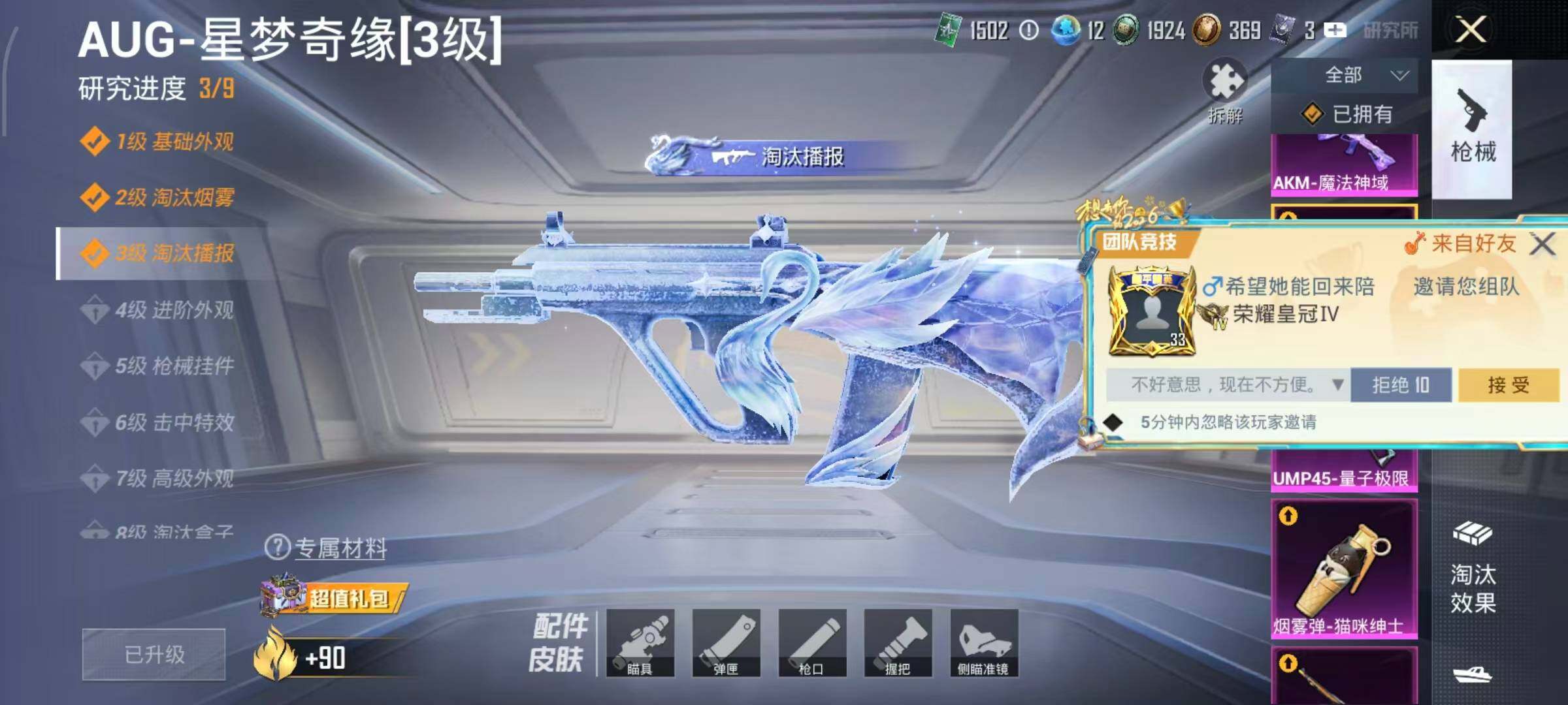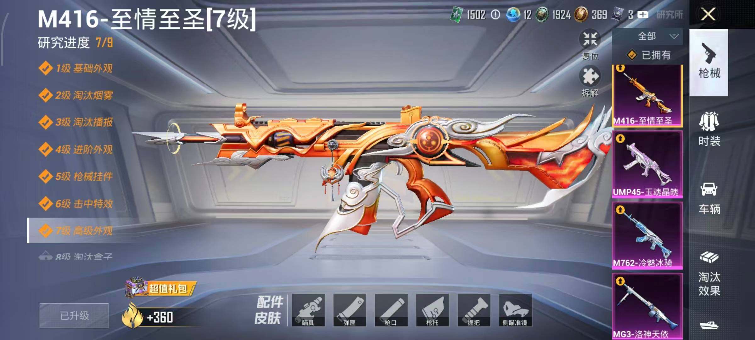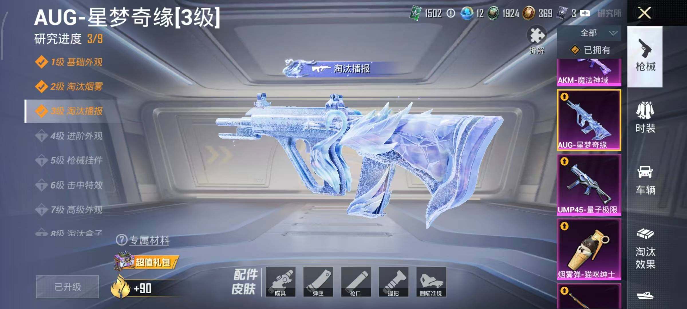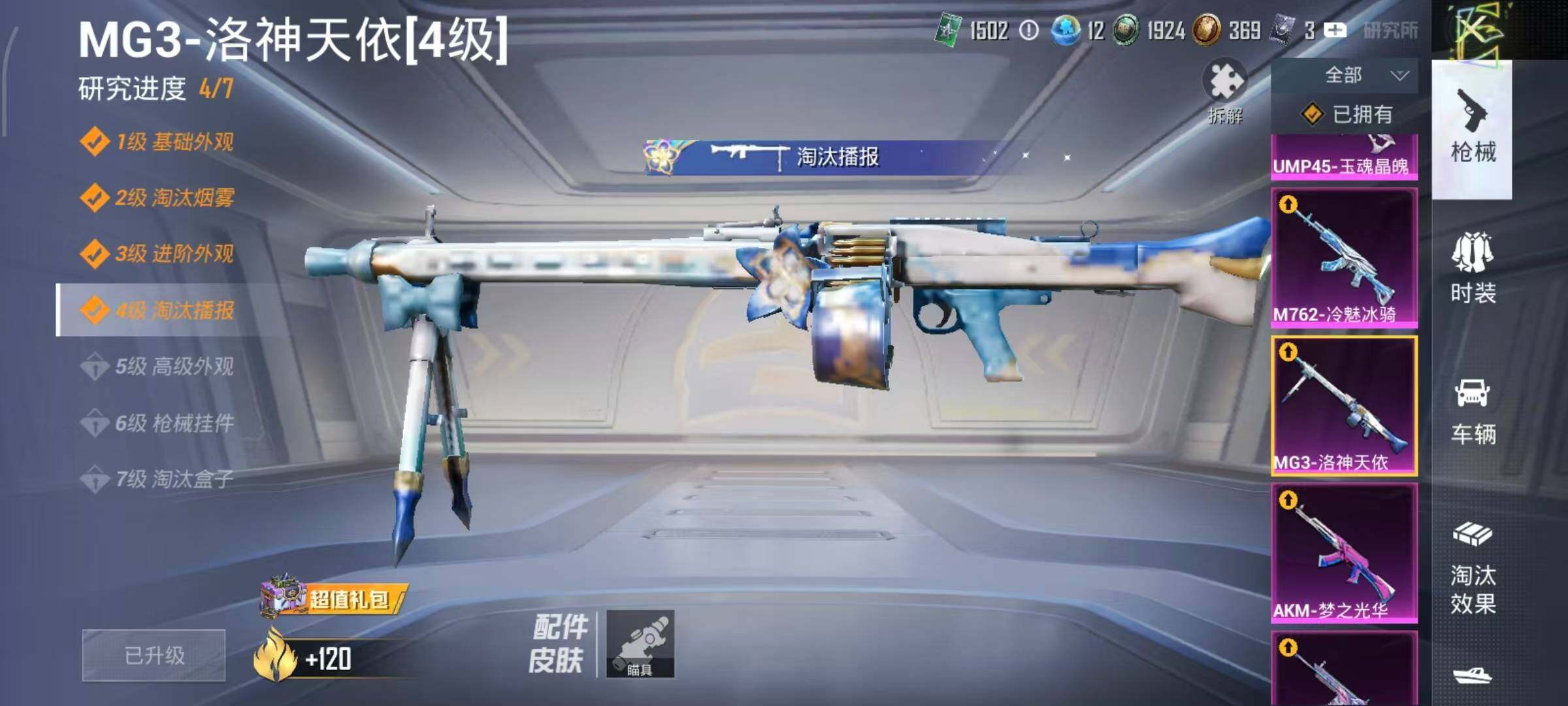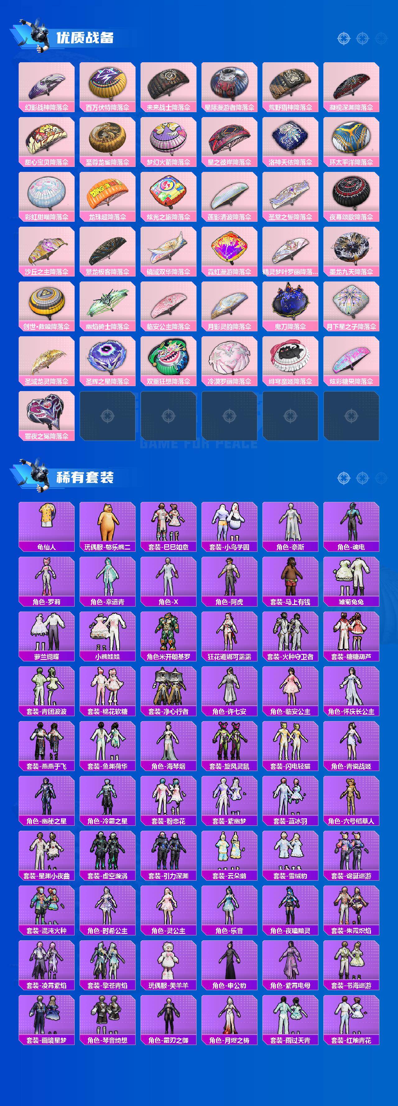 AKM-甜心宝贝,AKM-梦之光华,AKM-盖世英雄,AKM-绿萝繁花,AKM-魔法神域,AKM-幽焰骑士,SCAR-L-梦幻火箭,SCAR-L-锦绣绵绵,SCAR-L-时空协奏,SCAR-L-金蛇镇世,M416-五爪金龙,M416-至情至圣,M416-超新星,M416-电玩时刻,M416-墨龙九天,GROZA-巴啦啦小魔仙,GROZA-镜光银凌,GROZA-圣辉之星,AUG-星梦奇缘,AUG-许七安,AUG-暖羊咩咩,M762-冷魅冰骑,M762-青锋波束,UMP45-玉魂晶魄,UMP45-量子极限,Kar98K-创世·救赎,Kar98K-巳巳如意,Kar98K-圣域龙灵,M24-镜域双华,Mk14-精灵梦叶罗丽,DP-28-圣堂之誓,MG3-洛神天依,烟雾弹-猫咪绅士,破片手榴弹-粉粉猫爪