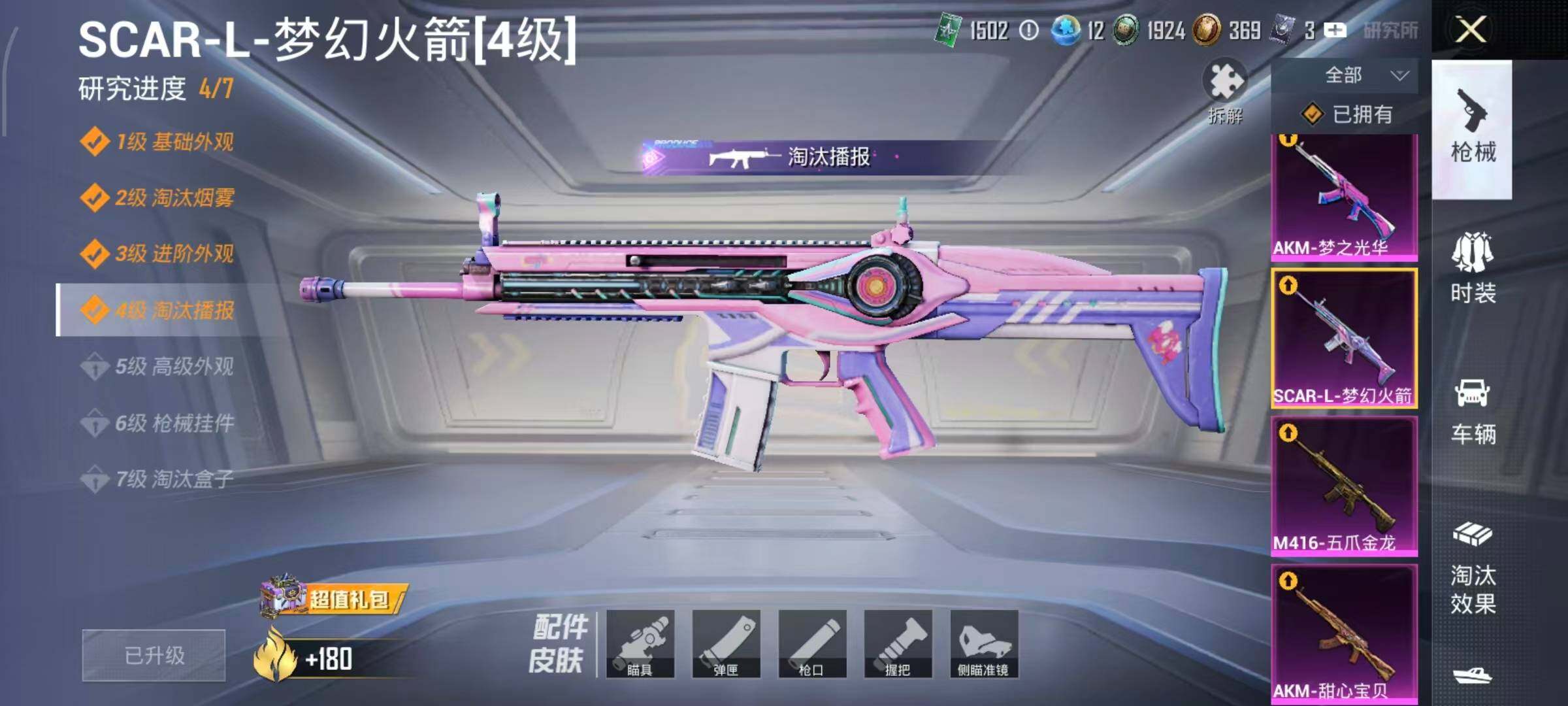 【粉色枪皮等级】:AKM-甜心宝贝(五级),AKM-梦之光华(一级),AKM-盖世英雄(七级),AKM-绿萝繁花(五级),AKM-魔法神域(一级),AKM-幽焰骑士(一级),SCAR-L-梦幻火箭(四级),SCAR-L-锦绣绵绵(五级),SCAR-L-时空协奏(一级),SCAR-L-金蛇镇世(一级),M416-五爪金龙(四级),M416-至情至圣(七级),M416-超新星(三级),M416-电玩时刻(五级),M416-墨龙九天(三级),GROZA-巴啦啦小魔仙(一级),GROZ