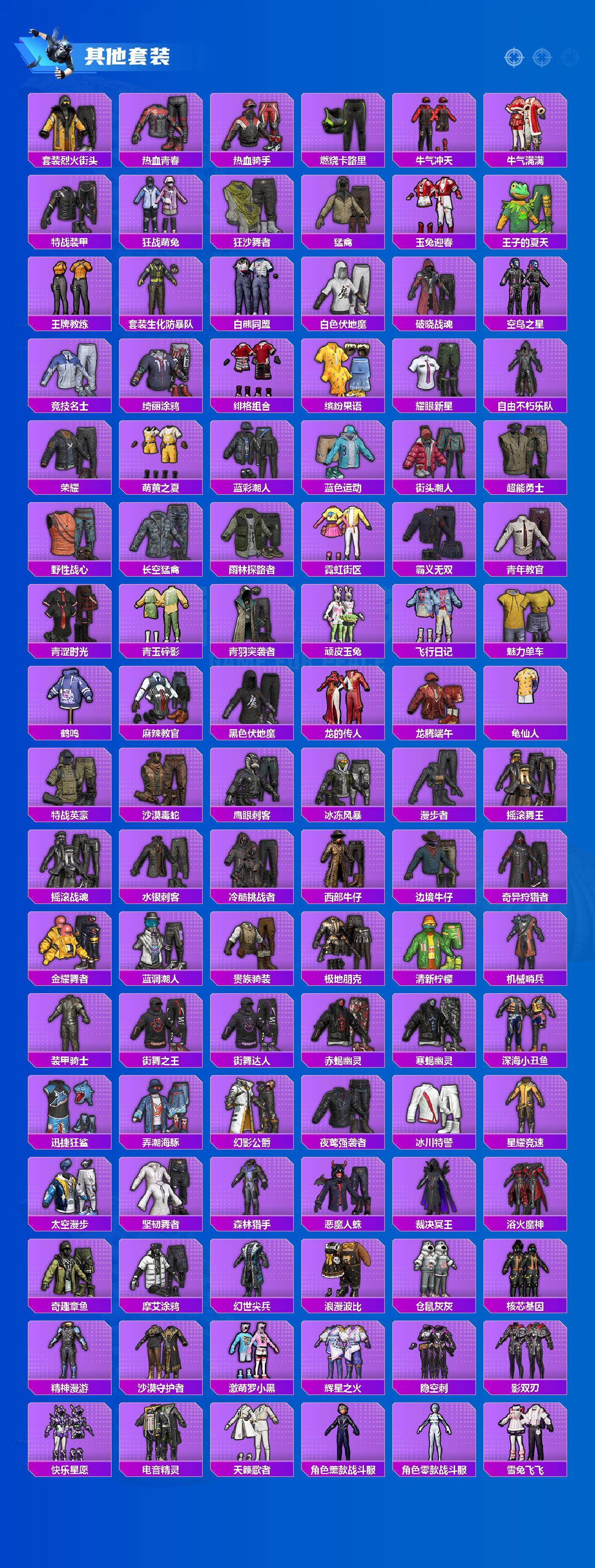 【粉色套装】:粉装-极限特训,粉装-快乐主宰,粉装-幻影战神,粉装-未来战士,粉装-星际漫游者,粉装-怪诞乔克,粉装-深渊皇后,粉装-甜心巧克力,粉装-宝贝奶油派,粉装-天使彩虹糖,粉装-金曜白虎,粉装-雪国幻梦,粉装-梦幻火箭,粉装-智能音符,粉装-放客神游,粉装-花间之火,粉装-绚金战神,粉装-星之彼岸,粉装-骨龙祭渊,角色-洛天依,角色-初号机款机体服,角色-复仇流浪者,粉装-千面幻镜,粉装-音爆索尼克,角色-阿尔茜,粉装-炫光之旅,粉装-巨渊蟹踪,粉装-莲影清波,粉装-繁龙极客,角色-烟云彩露,角色-小蓝,角色-千金淑猫,角色-月影灵韵,角色-凤凰座 一辉,角色-冷漠罗丽,角色-绯穹魔姬,角色-罪夜之冕