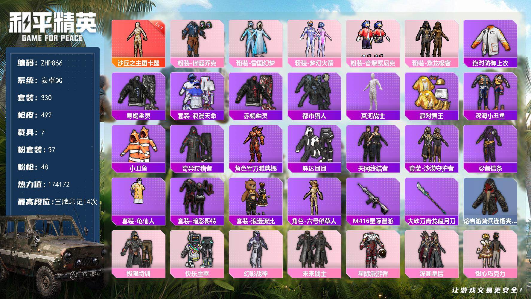 - [15707909]【特价出售/店主推荐】苹果 手Q-4粉装-1特效枪-2载具-1粉色飞行器-46095热力值-1王牌印记-90套装-149枪皮【热门品类】:套装-龟仙人【粉色套装】:粉装-冰霜白皇,粉装-橘柚倾心,粉装-紫电风暴,角色-冷漠罗丽【粉色枪皮等级】:M416-风花雪月(六级)【粉色载具】:兰博基尼Aventador SVJ(翡翠绿),路特斯ELETRE(冰川蓝)【粉色枪皮】:M416-风花雪月【粉色飞行器】:星夜魔法师飞行翼