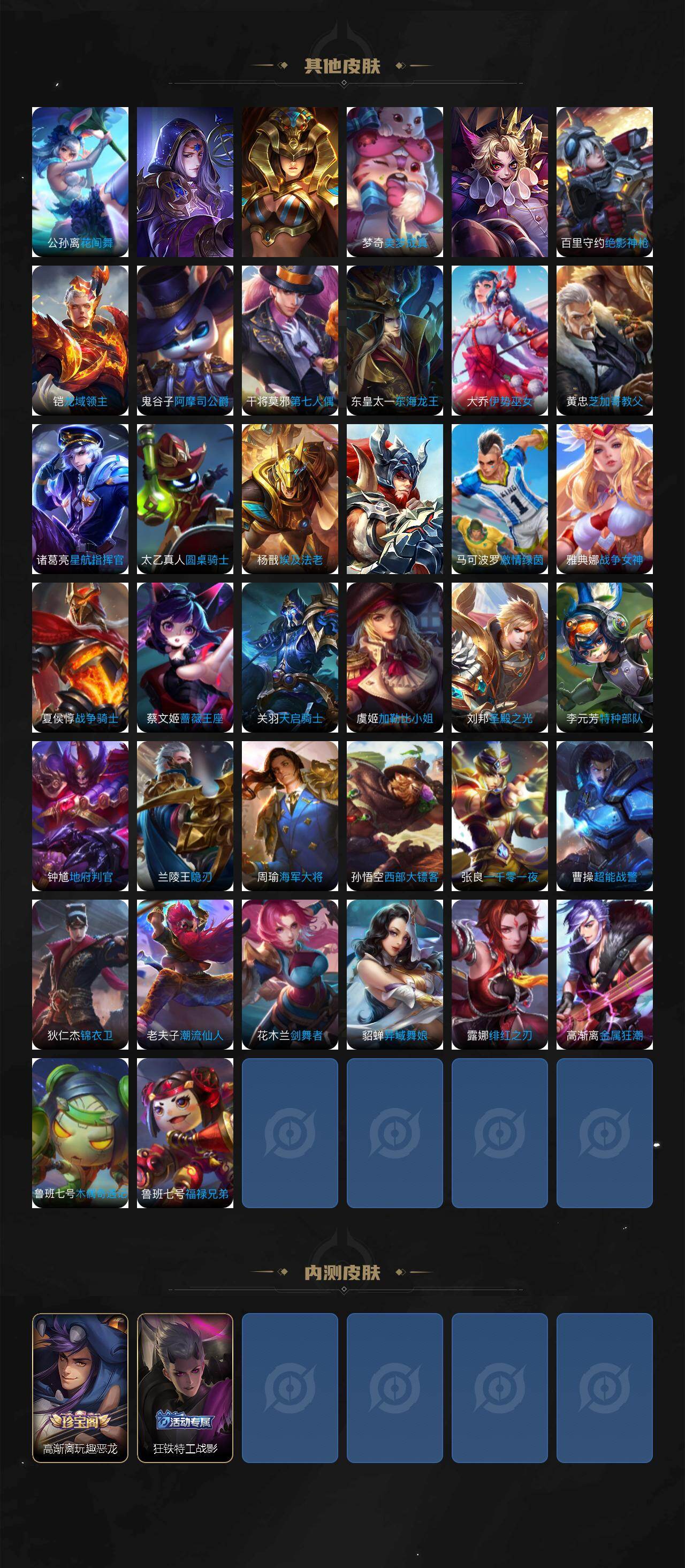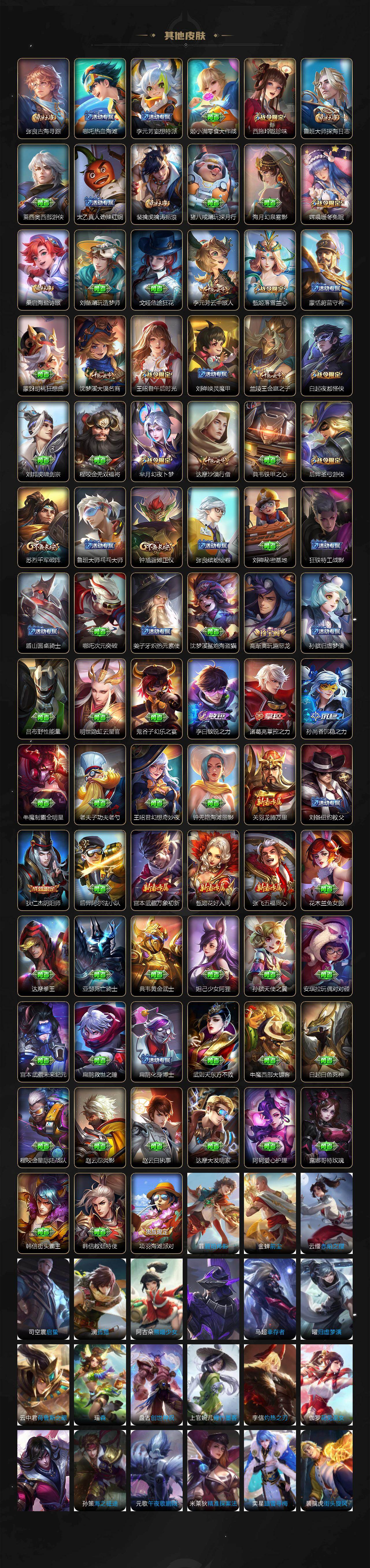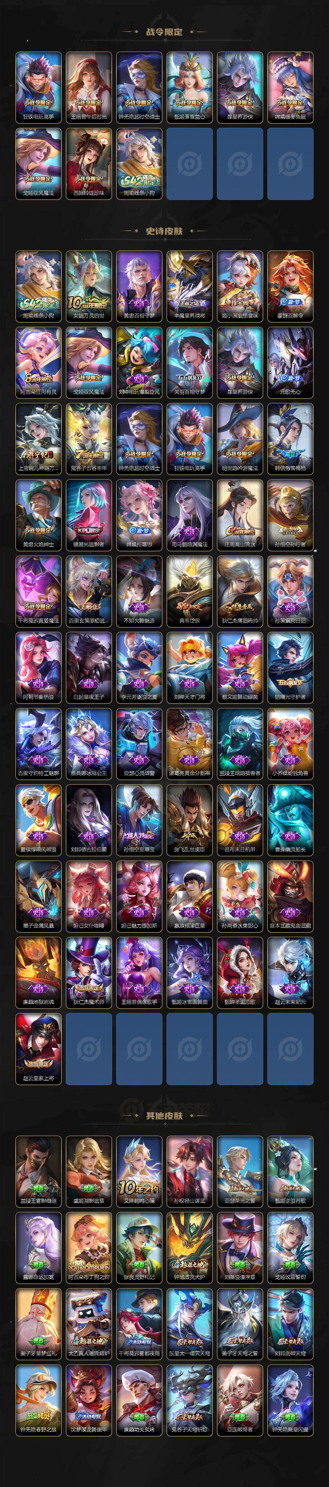【限定皮肤】:姜子牙天穹之誓,狄仁杰阴阳师,赵云皇家上将,鲁班七号寅虎瑞焰,庄周高山流水,高渐离玩趣恶龙,钟无艳超时空战士,白起夜都怪侠,芈月幻夜卜梦,元歌无心,甄姬落雪兰心,典韦岱宗,狄仁杰魔术师,达摩沙漠行僧,项羽海滩派对,关羽百相守梦,韩信傲雪梅枪,王昭君午后时光,兰陵王金庭之子,孙悟空至尊宝,孙悟空零号赤焰,孙悟空孙行者,后羿圣弓游侠,李元芳云中旅人,钟馗驱傩正仪,干将莫邪真爱魔法,鬼谷子五谷丰年,诸葛亮武陵仙君,黄忠火炮绅士,苏烈千军破阵,百里玄策原初追逐者,沈梦溪大漠名商,明世隐吟游魔法,裴擒虎擒涛扼浪,狂铁电玩高手,上官婉儿神器万象笔,嫦娥拒霜思,嫦娥暖冬兔眠,西施玲珑珍味,鲁班大师探海日志,镜匿光追影者,桑启海盐诗旅,暃星界游侠,戈娅驭风魔法,阿古朵江河有灵,张良古海寻踪,蒙犽百解令,鬼谷子天穹祈灯,姬小满妄想食味,沈梦溪龙舞盛年,刘邦剑破天穹
