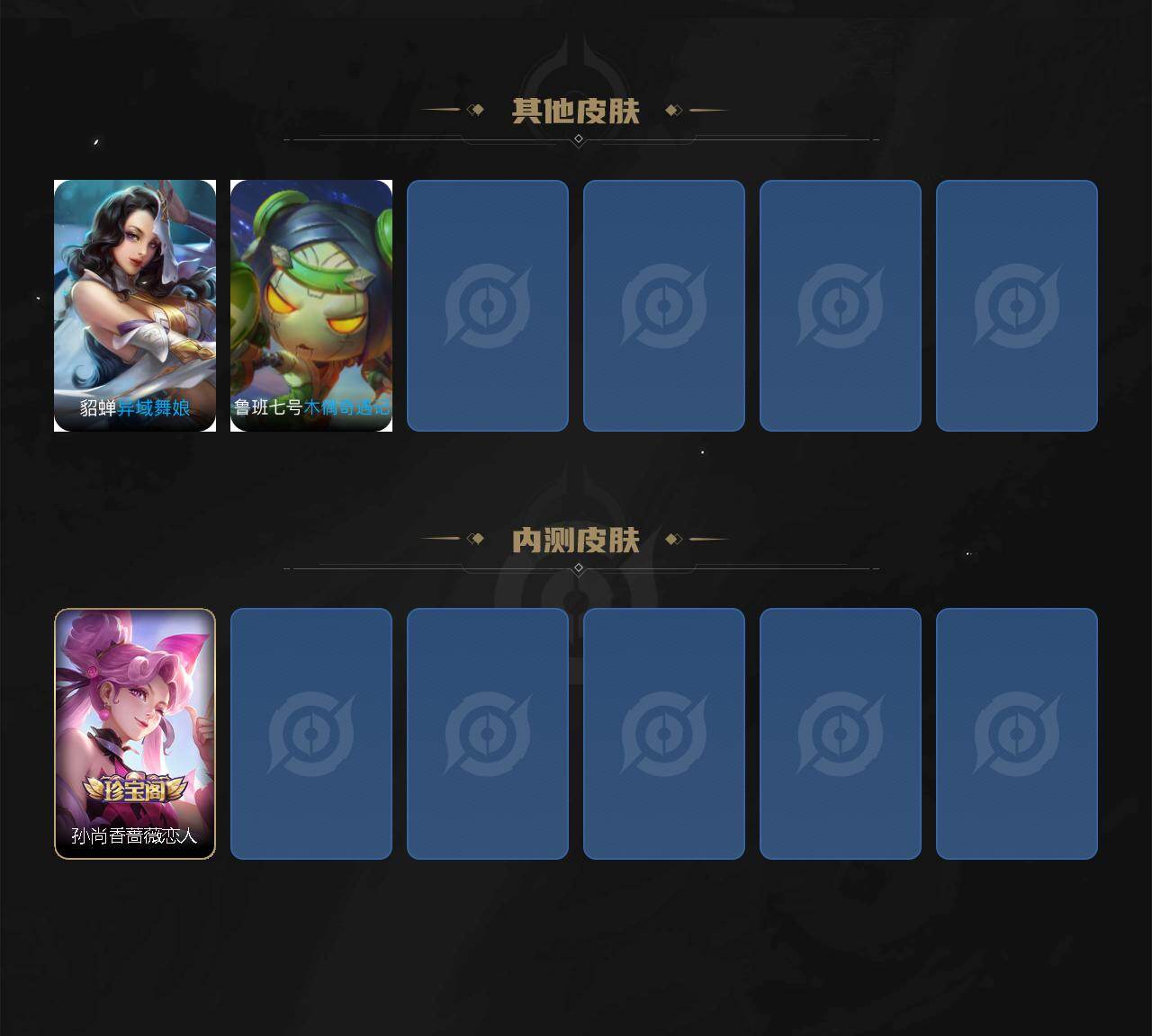【其他皮肤】:鲁班七号班班快跑,艾琳鹤鸣心笺,莱西奥踏浪烽翎,空空儿戏梦巡演,庄周锦麟游梦,白起死霸装,姬小满小满鸭,阿古朵布丁狗之约,张良灵野札记,苏烈春野闲踪,刘备浪漫序章,戈娅玫蓝誓约,明世隐景韶洛都,少司缘灵卦秘语,干将莫邪雾都夜雨,东皇太一噬灭天穹,刘邦剑破天穹,后羿完美运算,鲁班大师探海日志,太乙真人劲辣红锅,裴擒虎擒涛扼浪,桑启海盐诗旅,李元芳云中旅人,刘禅唤灵魔甲,兰陵王金庭之子,达摩沙漠行僧,鲁班大师乓乓大师,苏烈坚韧之力,诸葛亮掌控之力,关羽龙腾万里,刘备汉昭烈帝,张飞五福同心,达摩拳王,妲己少女阿狸,宫本武藏未来纪元,扁鹊化身博士,武则天东方不败,芈月红桃皇后,赵云白执事,露娜哥特玫瑰,澜孤猎,阿古朵熊喵少女,瑶森,猪八戒年年有余,李信灼热之刃,米莱狄精准探案法,裴擒虎街头旋风,杨玉环霓裳曲,公孙离花间舞,蔡文姬蔷薇王座,兰陵王隐刃,刘禅英喵野望,孙悟空西部大镖客,王昭君精灵公主,貂蝉异域舞娘,鲁班七号木偶奇遇记