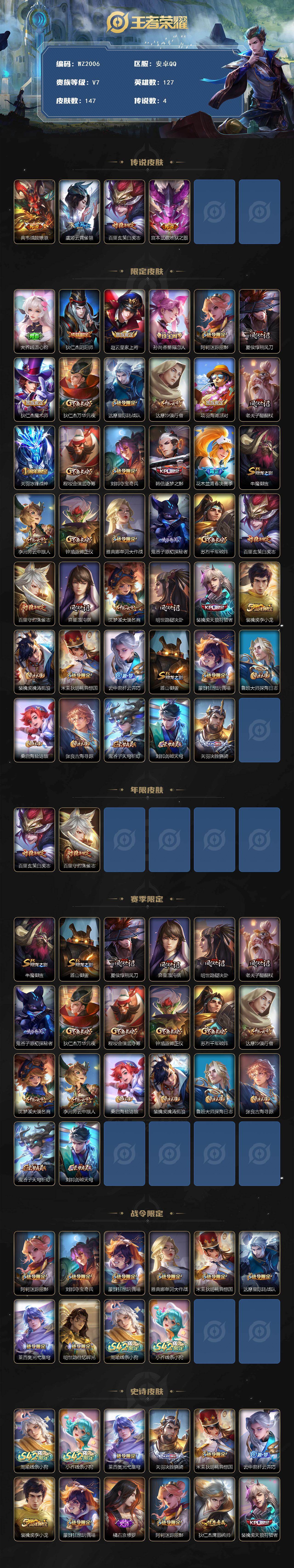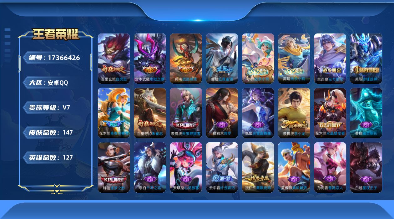 - PX_2093861-贵族等级: V4 英雄数: 53 皮肤数: 17 传说皮: 澜逐花归海 限定皮: 逐霄战戟