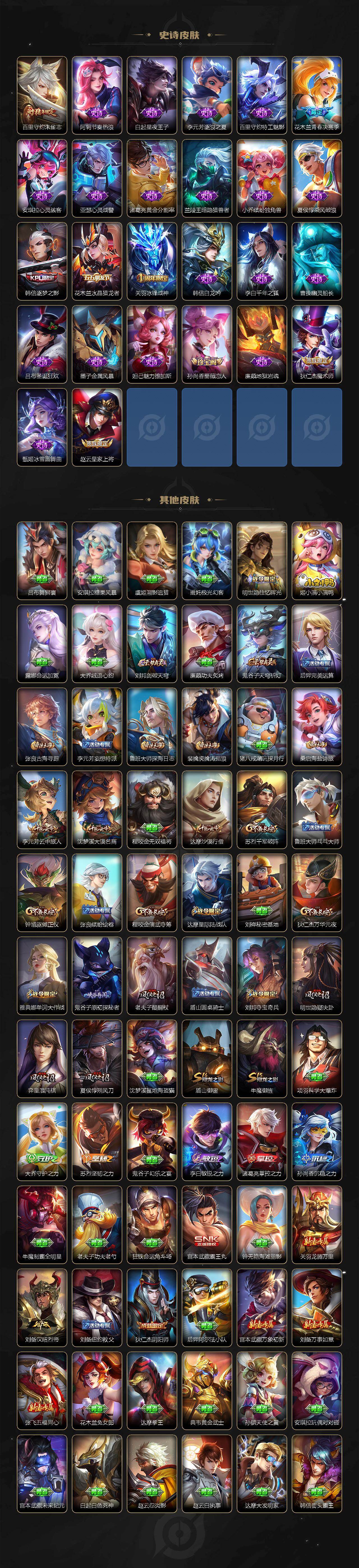 【史诗皮肤】:周瑜线条小狗,小乔线条小狗,莱西奥光弋星穹,关羽决胜骁骑,米莱狄胡桃异想国,云中君纤云弄巧,裴擒虎李小龙,蒙犽狂想玩偶喵,橘右京修罗,阿轲迷踪丽影,狄仁杰鹰眼统帅,裴擒虎天狼狩猎者,百里守约朱雀志,阿轲节奏热浪,白起星夜王子,李元芳逐浪之夏,百里守约特工魅影,花木兰青春决赛季,安琪拉心灵骇客,亚瑟心灵战警,诸葛亮黄金分割率,兰陵王暗隐猎兽者,小乔缤纷独角兽,夏侯惇乘风破浪,韩信逐梦之影,花木兰水晶猎龙者,关羽冰锋战神,韩信白龙吟,李白千年之狐,曹操幽灵船长,吕布圣诞狂欢,墨子金属风暴,妲己魅力维加斯,孙尚香蔷薇恋人,廉颇地狱岩魂,狄仁杰魔术师,甄姬冰雪圆舞曲,赵云皇家上将