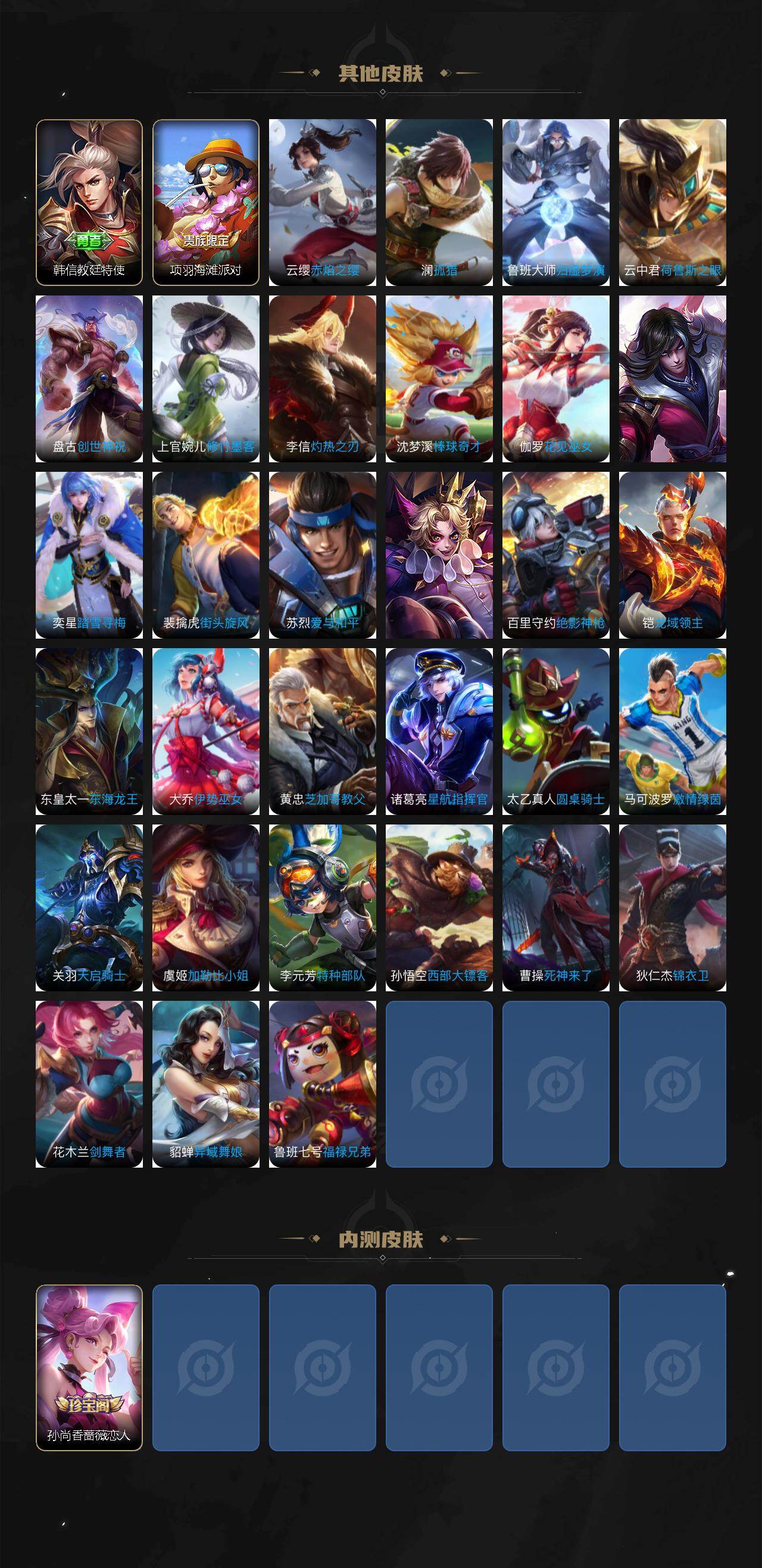 【赛季限定】:牛魔御旌,盾山御銮,夏侯惇朔风刀,弈星混沌棋,明世隐疑决卦,老夫子醍醐杖,鬼谷子原初探秘者,狄仁杰万华元夜,程咬金演武夺筹,钟馗驱傩正仪,苏烈千军破阵,达摩沙漠行僧,沈梦溪大漠名商,李元芳云中旅人,桑启海盐诗旅,裴擒虎擒涛扼浪,鲁班大师探海日志,张良古海寻踪,鬼谷子天穹祈灯,刘邦剑破天穹