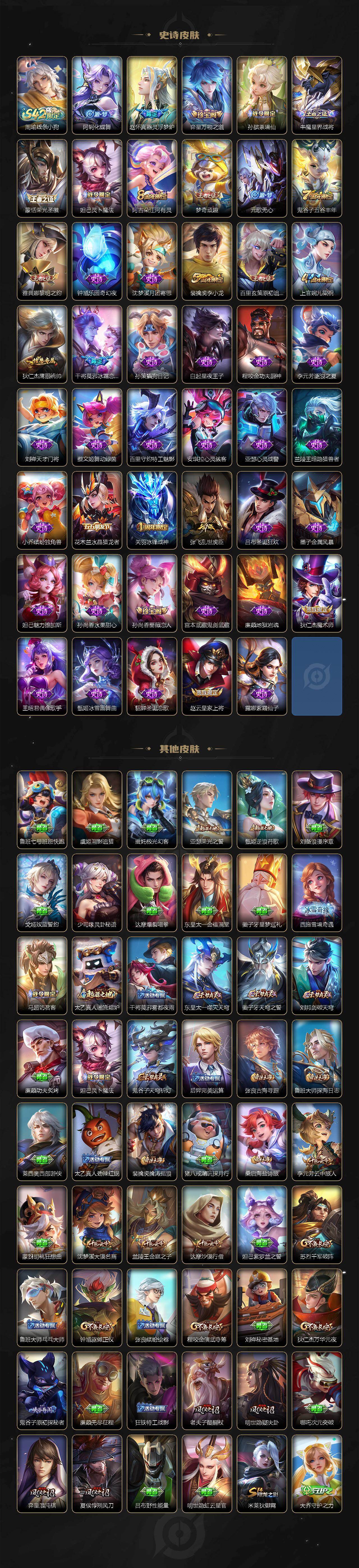 【史诗皮肤】:周瑜线条小狗,阿轲化蝶舞,赵怀真器灵浮梦炉,弈星万物之道,孙膑茶境仙,牛魔星界战将,蒙恬荣光圣徽,妲己灵卜魔法,阿古朵江河有灵,梦奇顽趣,元歌无心,鬼谷子五谷丰年,雅典娜黎明之约,钟馗乐园奇幻夜,沈梦溪月团寄思,裴擒虎李小龙,百里玄策原初追逐者,上官婉儿梁祝,狄仁杰鹰眼统帅,干将莫邪冰霜恋舞曲,孙策猫狗日记,白起星夜王子,程咬金功夫厨神,李元芳逐浪之夏,刘禅天才门将,蔡文姬舞动绿茵,百里守约特工魅影,安琪拉心灵骇客,亚瑟心灵战警,兰陵王暗隐猎兽者,小乔缤纷独角兽,花木兰水晶猎龙者,关羽冰锋战神,张飞乱世虎臣,吕布圣诞狂欢,墨子金属风暴,妲己魅力维加斯,孙尚香水果甜心,孙尚香蔷薇恋人,宫本武藏鬼剑武藏,廉颇地狱岩魂,狄仁