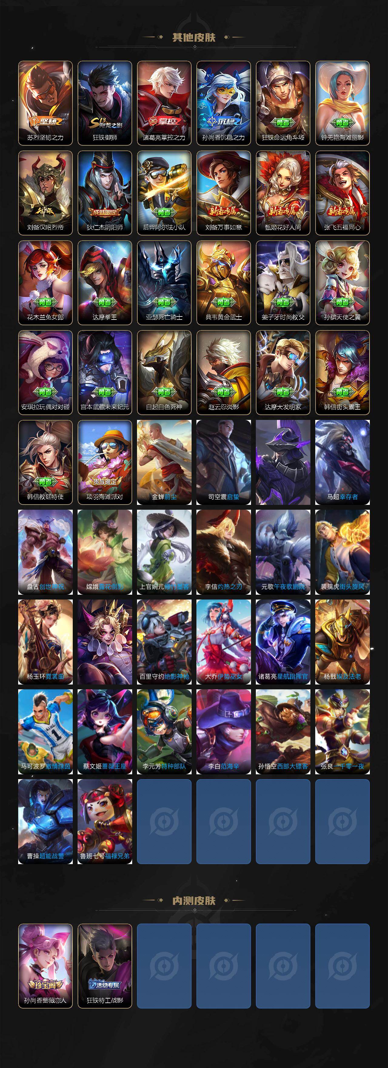【赛季限定】:狂铁御狮,米莱狄御霄,夏侯惇朔风刀,弈星混沌棋,明世隐疑决卦,老夫子醍醐杖,鬼谷子原初探秘者,狄仁杰万华元夜,程咬金演武夺筹,钟馗驱傩正仪,苏烈千军破阵,达摩沙漠行僧,兰陵王金庭之子,沈梦溪大漠名商,李元芳云中旅人,桑启海盐诗旅,裴擒虎擒涛扼浪,鲁班大师探海日志,张良古海寻踪,鬼谷子天穹祈灯,刘邦剑破天穹,姜子牙天穹之誓,东皇太一噬灭天穹,太乙真人谧流熔炉,甄姬逆浪荇歌,亚瑟荣光之誓,百里玄策原初追逐者,雅典娜黎明之约,梦奇顽趣,蒙恬荣光圣徽,牛魔星界战将