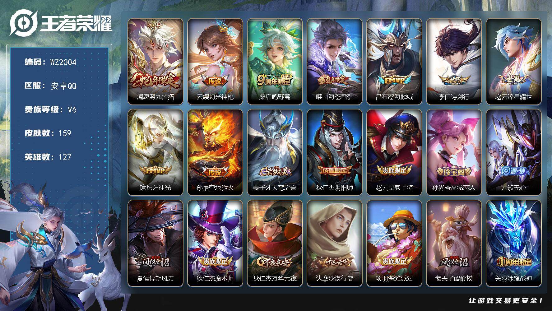 - [12256670]V8 2典藏 1珍品传说 10传说 125英雄 317皮肤 可修改实名 优质装备:弑枪猎影(韩信典藏),神鉴启示录,器灵·落星盏,黄金射手座,末日机甲-孙尚香(绿蚂蚱),超时空战士-狄仁杰,无双飞将,妄想实况,涂山容容 传说皮:幻光神枪 珍宝阁皮:妄想食味,蔷薇恋人 限定皮:愿照·九州拓(澜年限),愿照·山河定(司空震年限),逐霄战戟,鸣野蒿,至尊宝,傲雪梅枪,魔法小厨娘,白晶晶,玄嵩(庄周年限),匿光决锋者,五谷丰年,天狼狩猎者,奔雷神使(牛魔年限),孙行者,引擎之心,寅虎·御盾(廉颇年限),匿光启智者,山海·玄木吟(马可年限) 史诗皮:器灵·浮梦炉,糖绘人间,化蝶舞,龙之律动,琥珀纪元伽罗,星界战将,百相守梦-周瑜,茶境仙,埋骨钱,谪仙醉月,破空之剑,战舞者,紫霞仙子,电玩小子(小书包),特工魅影,冰冠公主,江河有灵,百解令(蒙犽),高渐离燃音魔法,蒙恬荣光圣徽,电玩·爆裂旋风,无限星赏官,晚萤,匿光破解者,百相守梦(刘备),龙骑士(小龙虾),末日机甲-吕布,猫狗日记-孙策,猫狗日记-大乔,时之恋人-孙尚香,节奏热浪,修罗,女仆咖啡,摇滚巨星,水果甜心,天才门将,星夜王子,心灵骇客,功夫厨神,暗隐猎兽者,鬼剑武藏,地狱岩魂,纤云弄巧,拒霜思,乘风破浪,逐浪之夏,月团寄思,水晶猎龙者,曙光守护者,唤灵魅影,金属风暴,原初追逐者,圣诞狂欢,鹰眼统帅,魅力维加斯,赏金猎手,寅虎·御盾,无心