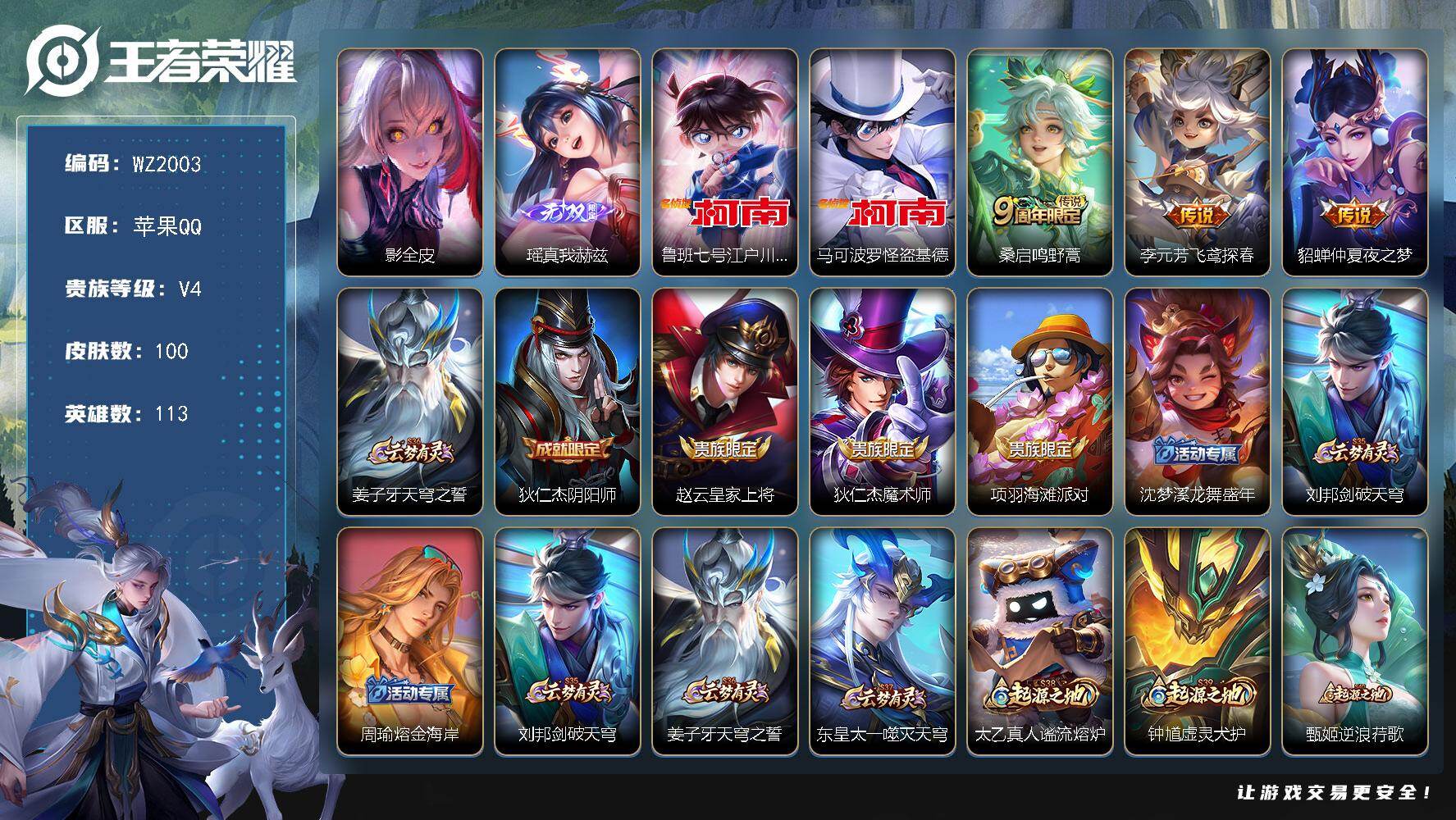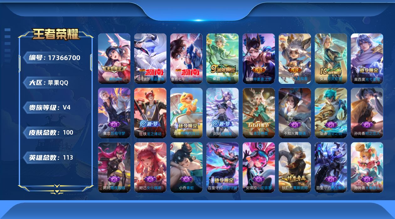 [17366700]苹果Q-100皮肤-1无双-2珍品传说-3传说-33史诗 【英雄全皮】:影全皮 【无双皮肤】:瑶真我赫兹 【珍品传说】:鲁班七号江户川柯南,马可波罗怪盗基德 【传说皮肤】:桑启鸣野蒿,李元芳飞鸢探春,貂蝉仲夏夜之梦 【限定皮肤】:姜子牙天穹之誓,狄仁杰阴阳师,赵云皇家上将,狄仁杰魔术师,项羽海滩派对,沈梦溪龙舞盛年,刘邦剑破天穹,周瑜熔金海岸 【赛季限定】:刘邦剑破天穹,姜子牙天穹之誓,东皇太一噬灭天穹,太乙真人谧流熔炉,钟馗虚灵犬护,甄姬逆浪荇歌,亚瑟荣光之誓 【战令限定】:亚连破空之剑,孙悟空神迹守卫,百里守约百相守梦,老夫子百相守梦,刘禅鸭鸭历险记,沈梦溪鸭鸭历险记,莱西奥光弋星穹,明世隐往忆晖光 【史诗皮肤】:女娲万灵启世,莱西奥光弋星穹,黄忠百相守梦,狂铁龙之律动,刘禅鸭鸭历险记,阿轲化蝶舞,百里守约百相守梦,亚连破空之剑,貂蝉唤灵魅影,钟馗乐园奇幻夜,孙尚香时之恋人,瑶遇见神鹿,不知火舞魅语,小乔青蛇,狄仁杰鹰眼统帅,伽罗箭羽风息,孙策猫狗日记,程咬金功夫厨神,刘禅天才门将,蔡文姬舞动绿茵,百里守约特工魅影,安琪拉心灵骇客,小乔缤纷独角兽,张飞乱世虎臣,妲己女仆咖啡,妲己魅力维加斯,孙尚香水果甜心,宫本武藏鬼剑武藏,廉颇地狱岩魂,狄仁杰魔术师,貂蝉圣诞恋歌,赵云皇家上将,阿轲暗夜猫娘 【其他皮肤】:鲁班七号班班快跑,曹操逐霄之志,艾琳鹤鸣心笺,明世隐往忆晖光,亚瑟荣光之誓,莱西奥踏浪烽翎,甄姬逆浪荇歌,露娜命运加冕,张良灵野札记,小乔秘证寻踪,苏烈春野闲踪,沈梦溪鸭鸭历险记,钟馗虚灵犬护,戈娅玫蓝誓约,少司缘灵卦秘语,达摩爆裂喵拳,东皇太一金福满堂,姜子牙星梦巡礼,影魅影绮裳,典韦铁骨偃魂,太乙真人谧流熔炉,苍苍林狼骑,干将莫邪雾都夜雨,米莱狄怪诞之夜,老夫子百相守梦,亚瑟动物派对,东皇太一噬灭天穹,盘古敬我三分,孙悟空神迹守卫,周瑜熔金海岸,姜子牙天穹之誓,貂蝉长夏之忆,刘邦剑破天穹,沈梦溪龙舞盛年,鲁班七号黑桃队长,关羽龙腾万里,狄仁杰阴阳师,甄姬花好人间,花木兰兔女郎,达摩拳王,亚瑟死亡骑士,典韦黄金武士,牛魔西部大镖客,芈月红桃皇后,阿轲爱心护理,韩信街头霸王,项羽海滩派对,云缨赤焰之缨,阿古朵熊喵少女,蒙犽归虚梦演,瑶森,上官婉儿修竹墨客,公孙离花间舞,大乔伊势巫女,诸葛亮星航指挥官,太乙真人圆桌骑士,虞姬加勒比小姐,刘禅英喵野望,后羿精灵王