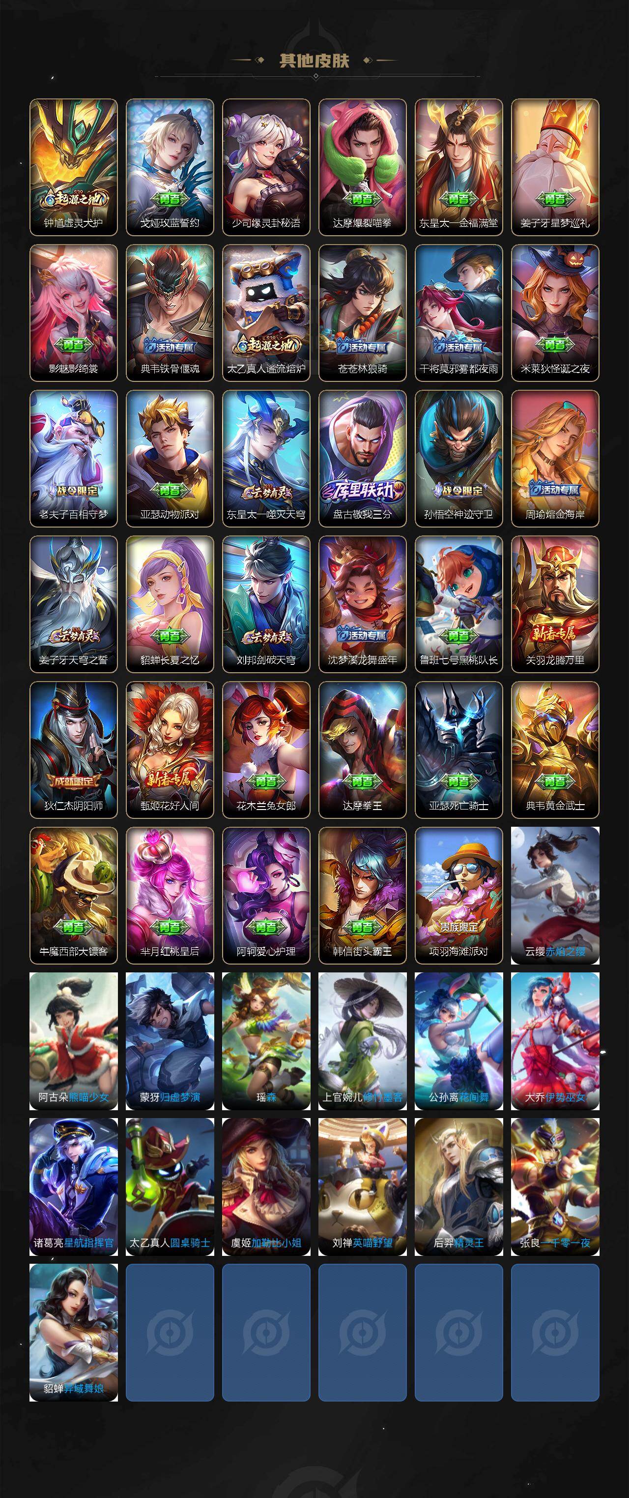 【其他皮肤】:鲁班七号班班快跑,曹操逐霄之志,艾琳鹤鸣心笺,明世隐往忆晖光,亚瑟荣光之誓,莱西奥踏浪烽翎,甄姬逆浪荇歌,露娜命运加冕,张良灵野札记,小乔秘证寻踪,苏烈春野闲踪,沈梦溪鸭鸭历险记,钟馗虚灵犬护,戈娅玫蓝誓约,少司缘灵卦秘语,达摩爆裂喵拳,东皇太一金福满堂,姜子牙星梦巡礼,影魅影绮裳,典韦铁骨偃魂,太乙真人谧流熔炉,苍苍林狼骑,干将莫邪雾都夜雨,米莱狄怪诞之夜,老夫子百相守梦,亚瑟动物派对,东皇太一噬灭天穹,盘古敬我三分,孙悟空神迹守卫,周瑜熔金海岸,姜子牙天穹之誓,貂蝉长夏之忆,刘邦剑破天穹,沈梦溪龙舞盛年,鲁班七号黑桃队长,关羽龙腾万里,狄仁杰阴阳师,甄姬花好人间,花木兰兔女郎,达摩拳王,亚瑟死亡骑士,典韦黄金武士,牛魔西部大镖客,芈月红桃皇后,阿轲爱心护理,韩信街头霸王,项羽海滩派对,云缨赤焰之缨,阿古朵熊喵少女,蒙犽归虚梦演,瑶森,上官婉儿修竹墨客,公孙离花间舞,大乔伊势巫女,诸葛亮星航指挥官,太乙真人圆桌骑士,虞姬加勒比小姐,刘禅英喵野望,后羿精灵王