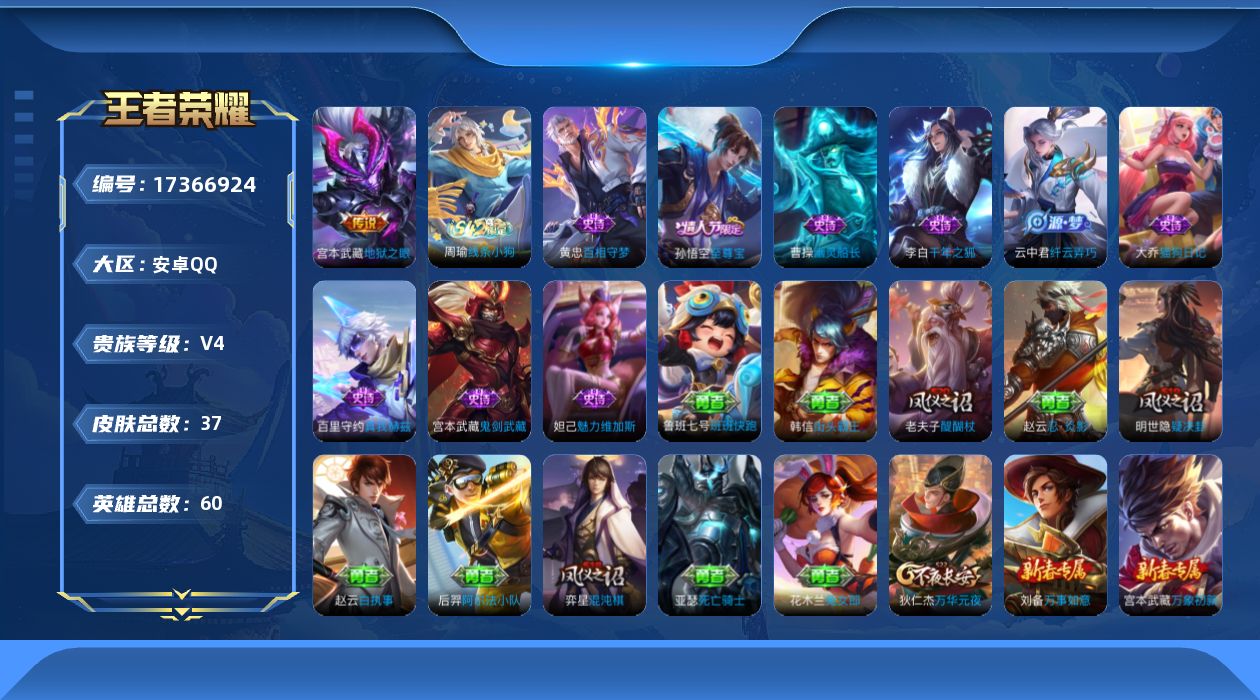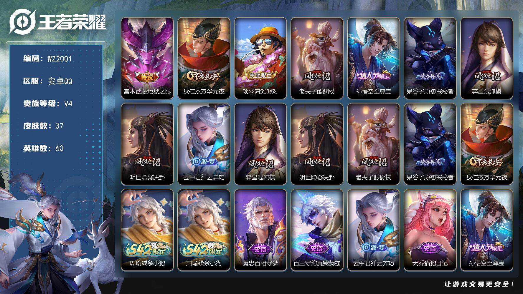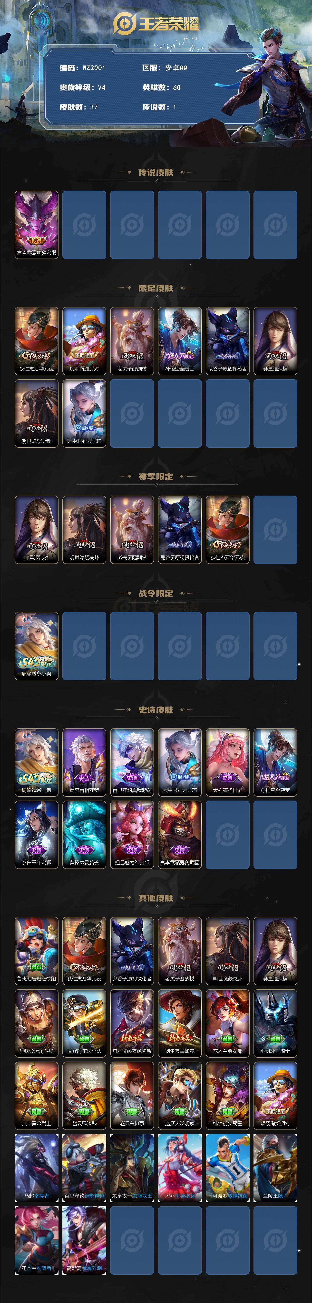 - [16996722]安卓Q-V7-至尊星耀IV段位-126英雄-210皮肤-1典藏皮肤-10传说-56史诗 【荣耀典藏】:孙尚香杀手不太冷 【传说皮肤】:马超神骥逐星野,典韦战鼓燎原,虞姬无限倾心,西施游龙清影,曜李逍遥 ,诸葛亮时雨天司,李信一念神魔,貂蝉仲夏夜之梦,孙尚香末日机甲,孙悟空地狱火 【限定皮肤】:狄仁杰阴阳师,赵云皇家上将,赵云龙胆,墨子神迹守卫,嬴政白昼王子,鲁班七号乒乒小将,高渐离玩趣恶龙,吕布猎兽之王,周瑜赤莲之焰,元歌云间偶戏,夏侯惇朔风刀,马可波罗暗影游猎,狄仁杰魔术师,狄仁杰万华元夜,达摩星际陆战队,达摩沙漠行僧,项羽海滩派对,老夫子醍醐杖,老夫子航海奇遇记,程咬金演武夺筹,韩信逐梦之影,兰陵王驯魔猎人,兰陵王金庭之子,花木兰青春决赛季,亚瑟潮玩骑士王,孙悟空至尊宝,牛魔御旌,李元芳云中旅人,虞姬霸王别姬,虞姬无限倾心,钟馗驱傩正仪,干将莫邪冰霜恋舞曲,雅典娜黎明之约,蔡文姬繁星吟游,鬼谷子原初探秘者,鬼谷子五谷丰年,诸葛亮时雨天司,大乔白鹤梁神女,苏烈千军破阵,百里玄策原初追逐者,弈星混沌棋,沈梦溪大漠名商,明世隐疑决卦,裴擒虎李小龙,裴擒虎擒涛扼浪,米莱狄御霄,米莱狄胡桃异想国,云中君纤云弄巧,伽罗天狼溯光者,盾山御銮,猪八戒西部大镖客,上官婉儿梁祝,曜李逍遥 ,鲁班大师探海日志,镜匿光追影者,桑启海盐诗旅,艾琳女武神,阿古朵江河有灵,张良古海寻踪,鬼谷子天穹祈灯,沈梦溪龙舞盛年 【年限皮肤】:诸葛亮时雨天司 【赛季限定】:米莱狄御霄,牛魔御旌,盾山御銮,夏侯惇朔风刀,弈星混沌棋,明世隐疑决卦,老夫子醍醐杖,鬼谷子原初探秘者,狄仁杰万华元夜,程咬金演武夺筹,钟馗驱傩正仪,苏烈千军破阵,达摩沙漠行僧,兰陵王金庭之子,沈梦溪大漠名商,李元芳云中旅人,桑启海盐诗旅,裴擒虎擒涛扼浪,鲁班大师探海日志,张良古海寻踪,鬼谷子天穹祈灯,百里玄策原初追逐者,雅典娜黎明之约 【战令限定】:嬴政白昼王子,吕布猎兽之王,兰陵王驯魔猎人,周瑜赤莲之焰,马可波罗暗影游猎,猪八戒西部大镖客,元歌云间偶戏,亚瑟潮玩骑士王,米莱狄胡桃异想国,达摩星际陆战队,老夫子航海奇遇记,墨子神迹守卫,周瑜线条小狗 【史诗皮肤】:鲁班七号电玩小子,赵云皇家上将,赵云未来纪元,甄姬冰雪圆舞曲,狄仁杰魔术师,廉颇地狱岩魂,宫本武藏鬼剑武藏,孙尚香水果甜心,妲己魅力维加斯,妲己女仆咖啡,墨子金属风暴,吕