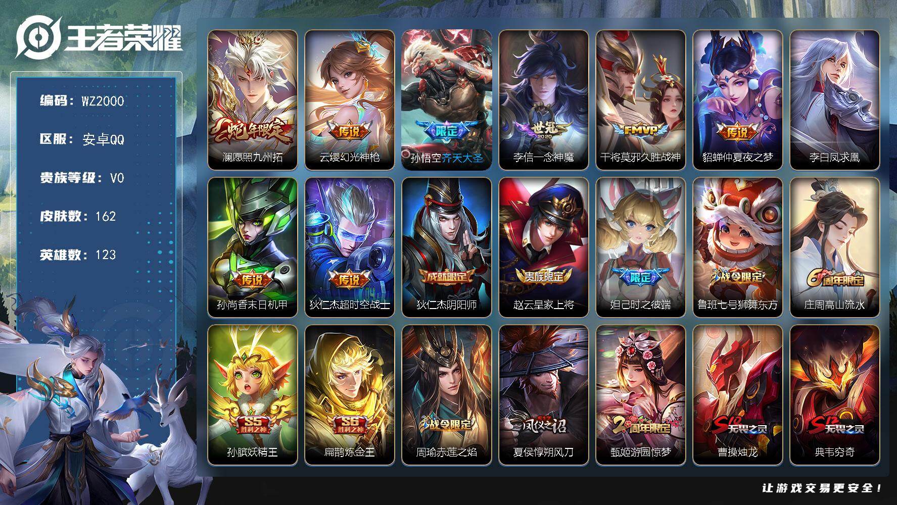 - [13131981]安卓Q-V5-最强王者段位-126英雄-120皮肤-1典藏-2传说-27史诗 【英雄全皮】:孙权全皮 【荣耀典藏】:虞姬神鉴启示录 【传说皮肤】:澜愿照九州拓,桑启鸣野蒿 【限定皮肤】:蒙犽顽岩魄,蔡文姬夏日便利店,大乔绒语心约,虞姬夏日便利店,姜子牙天穹之誓,狄仁杰阴阳师,赵云皇家上将,马可波罗暗影游猎,项羽海滩派对,干将莫邪胡桃夹子,裴擒虎擒涛扼浪,云中君纤云弄巧,鲁班大师探海日志,张良古海寻踪,鬼谷子天穹祈灯,沈梦溪龙舞盛年,鲁班七号蔬乡物语,李元芳蔬乡物语,刘邦剑破天穹,程咬金群星魔术团,镜青焰无极,项羽苍威无极,刘备异域游侠,周瑜熔金海岸 【赛季限定】:张良古海寻踪,裴擒虎擒涛扼浪,鲁班大师探海日志,鬼谷子天穹祈灯,刘邦剑破天穹,姜子牙天穹之誓 【战令限定】:蔡文姬夏日便利店,虞姬夏日便利店,马可波罗暗影游猎,鲁班七号蔬乡物语,李元芳蔬乡物语,镜青焰无极,项羽苍威无极 【史诗皮肤】:赵云皇家上将,甄姬冰雪圆舞曲,王昭君偶像歌手,宫本武藏鬼剑武藏,孙尚香水果甜心,妲己魅力维加斯,吕布圣诞狂欢,曹操幽灵船长,李白千年之狐,张飞乱世虎臣,花木兰水晶猎龙者,兰陵王暗隐猎兽者,诸葛亮黄金分割率,亚瑟心灵战警,雅典娜冰冠公主,阿轲节奏热浪,狄仁杰鹰眼统帅,马可波罗暗影游猎,云中君纤云弄巧,鲁班七号蔬乡物语,镜青焰无极,黄忠怒海争锋,蔡文姬夏日便利店,蒙犽顽岩魄,孙膑茶境仙,阿轲化蝶舞,狂铁龙之律动 【其他皮肤】:项羽海滩派对,韩信街头霸王,露娜哥特玫瑰,白起白色死神,牛魔西部大镖客,宫本武藏未来纪元,孙膑天使之翼,妲己少女阿狸,典韦黄金武士,亚瑟死亡骑士,达摩拳王,花木兰兔女郎,张飞五福同心,刘备万事如意,宫本武藏万象初新,狄仁杰阴阳师,刘备汉昭烈帝,老夫子功夫老勺,李白敏锐之力,大乔守护之力,吕布野性能量,狂铁特工战影,刘禅秘密基地,鲁班大师乓乓大师,干将莫邪胡桃夹子,马可波罗潮玩牛仔,蒙犽胡桃狂想曲,蒙恬蔚蓝守将,刘备潮玩造梦师,猪八戒潮玩探月行,赵怀真太极少年,裴擒虎擒涛扼浪,莱西奥西部游侠,鲁班大师探海日志,张良古海寻踪,亚连破局者,后羿完美运算,鬼谷子天穹祈灯,海诺时空谍影,沈梦溪龙舞盛年,钟无艳春野之旅,李元芳蔬乡物语,刘邦剑破天穹,盘古经纬探寻者,程咬金群星魔术团,项羽苍威无极,大司命暗都幽影,刘备异域游侠,貂蝉长夏之忆,姜子牙天穹之誓,周瑜熔金海岸,