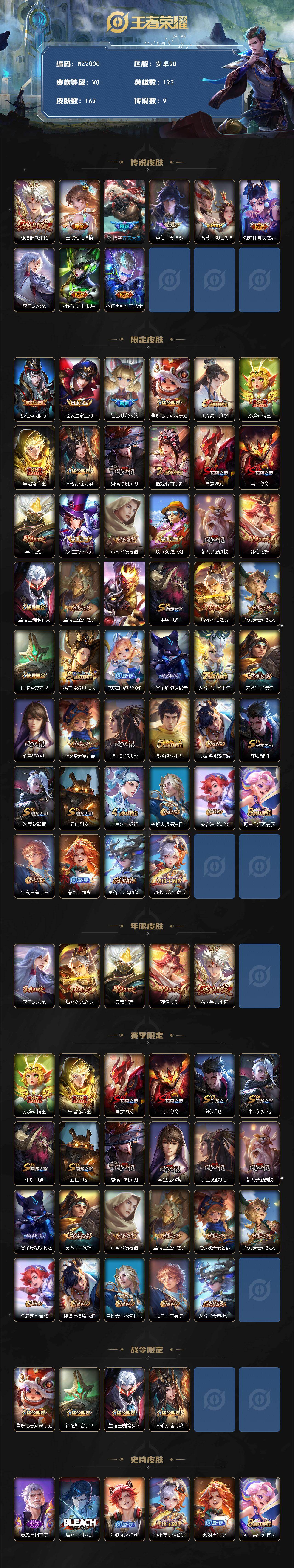 - [12701970]苹果Q-V5-永恒钻石II段位-123英雄-247皮肤-1典藏-0珍品无双-0无双-0珍品传说-18传说-71史诗 【英雄全皮】:空空儿全皮 【荣耀典藏】:李白鸣剑曳影 【传说皮肤】:桑启鸣野蒿,孙尚香乘龙问璇玑,澜逐花归海,吕布遇见神鼓,宫本武藏惊梅引,马可波罗妄想实况,曜山海苍雷引,李白诗剑行,马超无双飞将,赵云淬星耀世,镜炽阳神光,百里玄策白虎志,后羿黄金射手座,李白凤求凰,孙尚香末日机甲,宫本武藏地狱之眼,孙悟空地狱火,狄仁杰超时空战士 【限定皮肤】:姜子牙天穹之誓,狄仁杰阴阳师,赵云皇家上将,嬴政白昼王子,孙尚香蔷薇恋人,鲁班七号狮舞东方,鲁班七号乒乒小将,钟无艳王者之锤,芈月重明,吕布猎兽之王,吕布遇见神鼓,周瑜赤莲之焰,夏侯惇朔风刀,曹操烛龙,典韦穷奇,马可波罗暗影游猎,马可波罗妄想实况,狄仁杰魔术师,狄仁杰万华元夜,项羽海滩派对,老夫子醍醐杖,程咬金演武夺筹,韩信飞衡,兰陵王驯魔猎人,孙悟空至尊宝,孙悟空大圣娶亲,牛魔御旌,李元芳银河之约,李元芳云中旅人,钟馗神迹守卫,钟馗驱傩正仪,干将莫邪冰霜恋舞曲,干将莫邪胡桃夹子,鬼谷子原初探秘者,鬼谷子五谷丰年,铠青龙志,苏烈千军破阵,百里玄策白虎志,百里玄策原初追逐者,弈星混沌棋,梦奇顽趣,公孙离蜜橘之夏,沈梦溪星空之诺,沈梦溪大漠名商,明世隐疑决卦,裴擒虎李小龙,裴擒虎擒涛扼浪,狂铁御狮,米莱狄御霄,云中君纤云弄巧,盾山御銮,猪八戒西部大镖客,上官婉儿梁祝,曜山海苍雷引,西施玲珑珍味,鲁班大师探海日志,桑启海盐诗旅,戈娅驭风魔法,艾琳流音漫舞,赵怀真鹤归松栖,司空震地狱燃心,阿古朵江河有灵,张良古海寻踪,蒙恬荣光圣徽,鬼谷子天穹祈灯,孙尚香乘龙问璇玑,沈梦溪龙舞盛年,刘邦剑破天穹,程咬金群星魔术团,周瑜熔金海岸 【年限皮肤】:百里玄策白虎志,铠青龙志,李白凤求凰,韩信飞衡,曜山海苍雷引,孙尚香乘龙问璇玑 【赛季限定】:芈月重明,夏侯惇朔风刀,曹操烛龙,典韦穷奇,狄仁杰万华元夜,老夫子醍醐杖,程咬金演武夺筹,张良古海寻踪,牛魔御旌,李元芳云中旅人,钟馗驱傩正仪,鬼谷子原初探秘者,苏烈千军破阵,百里玄策原初追逐者,弈星混沌棋,梦奇顽趣,沈梦溪大漠名商,明世隐疑决卦,裴擒虎擒涛扼浪,狂铁御狮,米莱狄御霄,盾山御銮,鲁班大师探海日志,桑启海盐诗旅,鬼谷子天穹祈灯,蒙恬荣光圣徽,刘邦剑破天穹,姜子牙天穹之誓 【战