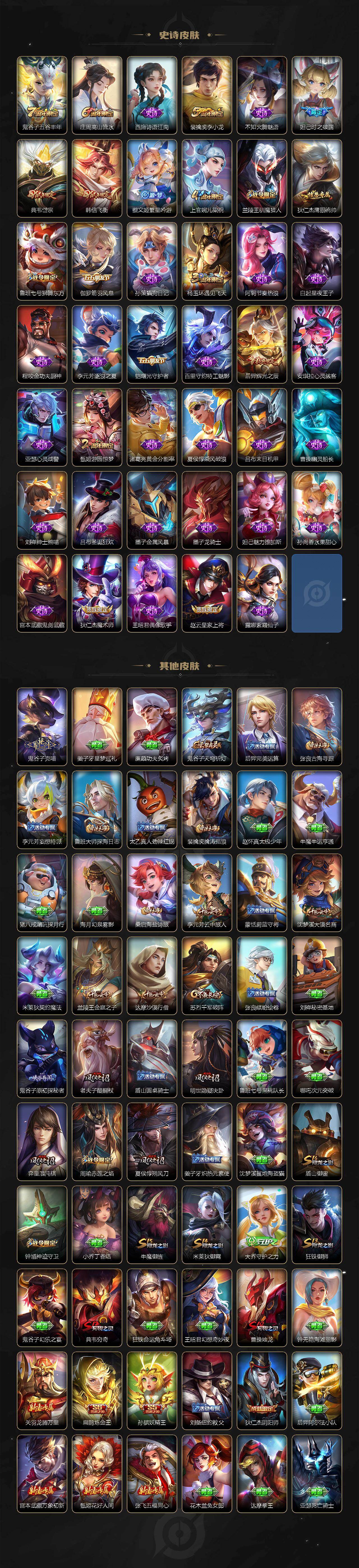 【史诗皮肤】:黄忠百相守梦,后羿石田雨龙,狂铁龙之律动,姬小满妄想食味,蒙犽百解令,阿古朵江河有灵,鬼谷子五谷丰年,庄周高山流水,西施诗语江南,裴擒虎李小龙,不知火舞魅语,妲己时之彼端,典韦岱宗,韩信飞衡,蔡文姬繁星吟游,上官婉儿梁祝,兰陵王驯魔猎人,狄仁杰鹰眼统帅,鲁班七号狮舞东方,伽罗箭羽风息,孙策猫狗日记,杨玉环遇见飞天,阿轲节奏热浪,白起星夜王子,程咬金功夫厨神,李元芳逐浪之夏,铠曙光守护者,百里守约特工魅影,后羿辉光之辰,安琪拉心灵骇客,亚瑟心灵战警,甄姬游园惊梦,诸葛亮黄金分割率,夏侯惇乘风破浪,吕布末日机甲,曹操幽灵船长,刘禅绅士熊喵,吕布圣诞狂欢,墨子金属风暴,墨子龙骑士,妲己魅力维加斯,孙尚香水果甜心,宫本武藏鬼剑武藏,狄仁杰魔术师,王昭君偶像歌手,