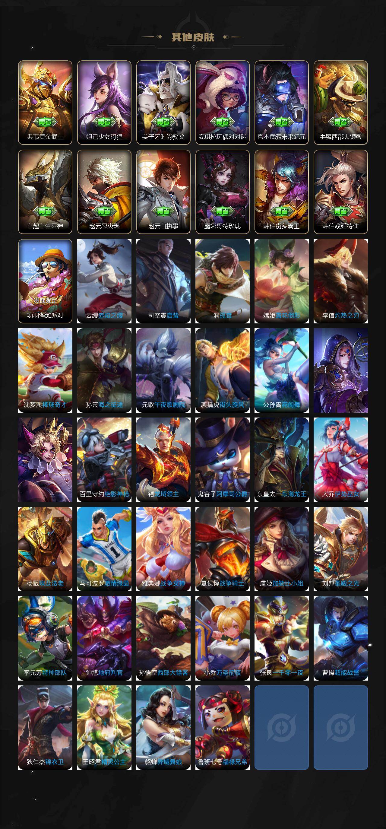 【限定皮肤】:狄仁杰阴阳师,赵云皇家上将,妲己时之彼端,鲁班七号狮舞东方,庄周高山流水,孙膑妖精王,扁鹊炼金王,周瑜赤莲之焰,夏侯惇朔风刀,甄姬游园惊梦,曹操烛龙,典韦穷奇,典韦岱宗,狄仁杰魔术师,达摩沙漠行僧,项羽海滩派对,老夫子醍醐杖,韩信飞衡,兰陵王驯魔猎人,兰陵王金庭之子,孙悟空齐天大圣,牛魔御旌,后羿辉光之辰,李元芳云中旅人,钟馗神迹守卫,杨玉环遇见飞天,蔡文姬繁星吟游,鬼谷子原初探秘者,鬼谷子五谷丰年,苏烈千军破阵,弈星混沌棋,沈梦溪大漠名商,明世隐疑决卦,裴擒虎李小龙,裴擒虎擒涛扼浪,狂铁御狮,米莱狄御霄,盾山御銮,上官婉儿梁祝,鲁班大师探海日志,桑启海盐诗旅,阿古朵江河有灵,张良古海寻踪,蒙犽百解令,鬼谷子天穹祈灯,姬小满妄想食味
