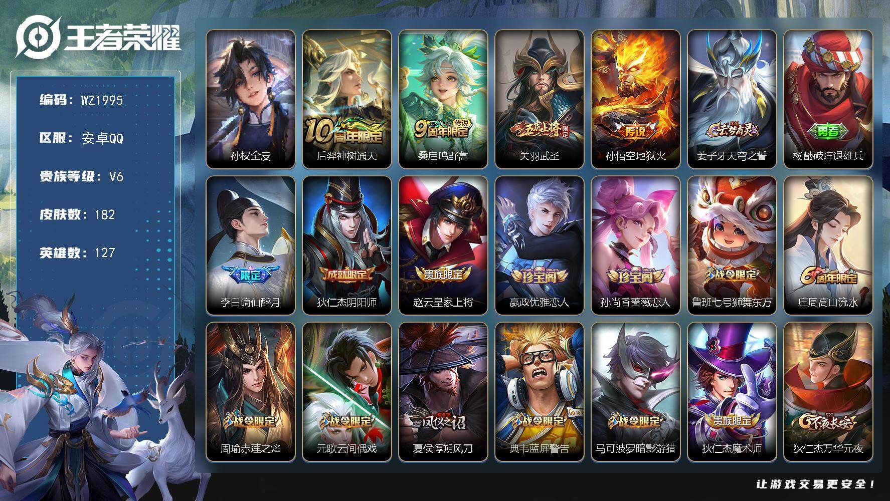 - [11470966]V9 5典藏 16传说 126英雄 336皮肤 典藏英雄武则天 可修改实名 优质装备:倪克斯神谕(宇宙婆娘),杀手不太冷,大秦宣太后,鸣剑·曳影,赤影疾锋,黄金白羊座,地狱火,李逍遥,超时空战士-狄仁杰,末日机甲-孙策,妄想实况 珍宝阁皮:优雅恋人,女武神,玩趣恶龙 限定皮:愿照·九州拓(澜年限),愿照·千秋盛(女娲年限),白虎志(电光耗子),凤求凰(白切鸡),凤凰于飞,飞衡(韩信年限),遇见飞天,高山流水,怒海麟威,五谷丰年,冰锋战神,武圣,游园惊梦,梁祝,天狼狩猎者,逐梦之星,李小龙,永曜之星,圣诞老人,奇迹圣诞,一生所爱,大圣娶亲,引擎之心,冰霜恋舞曲,蜜橘之夏,寅虎·瑞焰(虎皮蛋子),寅虎·赤拳(老虎年限),时之祈愿-云中君,山海·玄木吟(马可年限) 史诗皮:器灵·浮梦炉,化蝶舞,灵蛊蚀心,星界战将,百相守梦-黄忠,紫霞仙子,苍穹之光,白龙吟,黄金分割率,特工魅影,千年之狐,永昼,江河有灵,魅语,百解令(蒙犽),蒙恬荣光圣徽,无限星赏官,冰冠公主,偶像歌手,晚萤,暗夜猫娘,龙骑士(小龙虾),末日机甲-吕布,猫狗日记-孙策,猫狗日记-大乔,乱世虎臣,节奏热浪,修罗,女仆咖啡,摇滚巨星,水果甜心,绅士熊喵,天才门将,星夜王子,心灵骇客,功夫厨神,德古拉伯爵,暗隐猎兽者,幽灵船长,鬼剑武藏,暗渊魔法,心灵战警,天秀·启明,舞动绿茵,地狱岩魂,纤云弄巧,缤纷独角兽,乘风破浪,逐浪之夏,月团寄思,水晶猎龙者,曙光守护者,热力回旋,箭羽风息,金属风暴,原初追逐者,圣诞狂欢,圣诞恋歌,鹰眼统帅,暗夜贵公子,魅力维加斯,无心,未来纪元-赵云