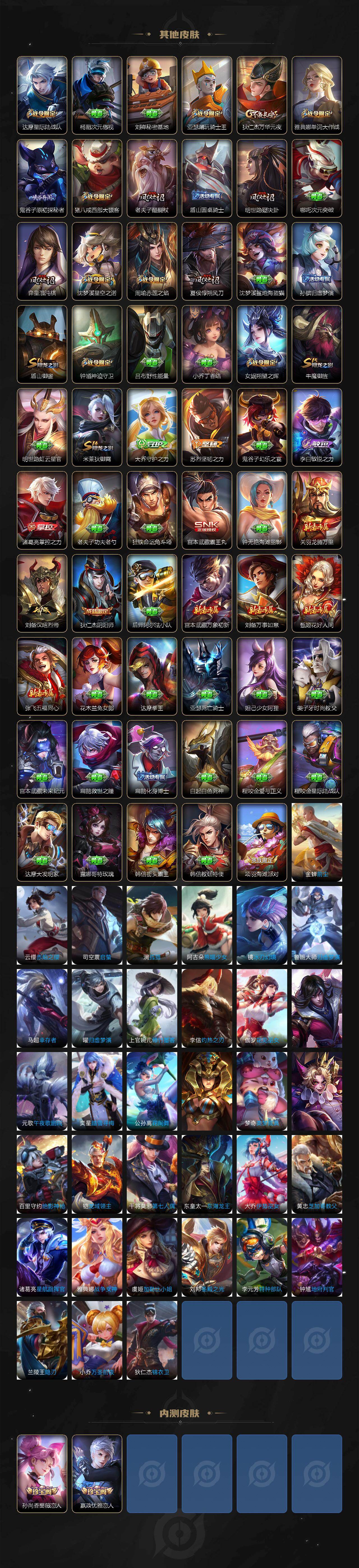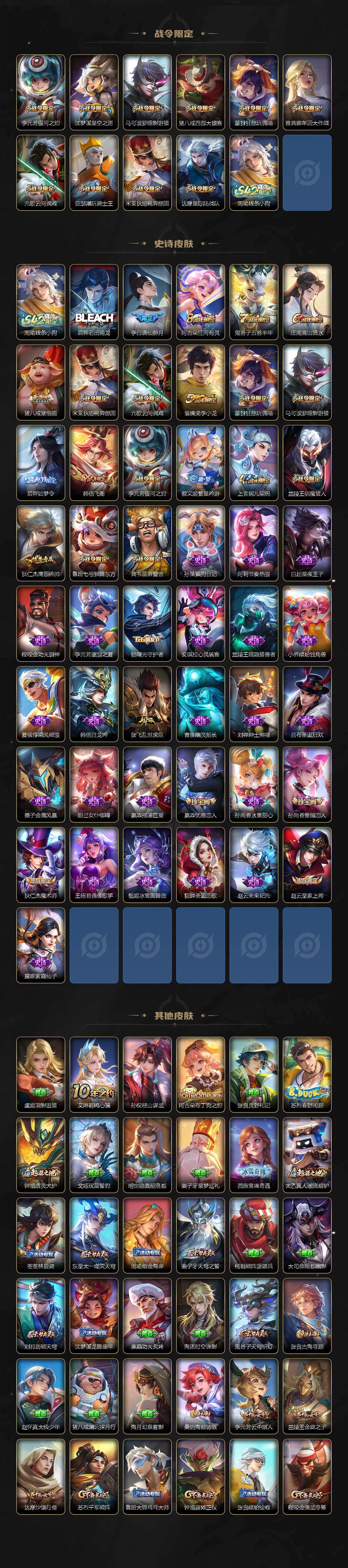【限定皮肤】:姜子牙天穹之誓,杨戬破阵退雄兵,李白谪仙醉月,狄仁杰阴阳师,赵云皇家上将,嬴政优雅恋人,孙尚香蔷薇恋人,鲁班七号狮舞东方,庄周高山流水,周瑜赤莲之焰,元歌云间偶戏,夏侯惇朔风刀,典韦蓝屏警告,马可波罗暗影游猎,狄仁杰魔术师,狄仁杰万华元夜,达摩星际陆战队,达摩沙漠行僧,项羽海滩派对,老夫子醍醐杖,关羽武圣,程咬金演武夺筹,韩信飞衡,兰陵王驯魔猎人,兰陵王金庭之子,亚瑟潮玩骑士王,牛魔御旌,后羿如梦令,李元芳银河之约,李元芳云中旅人,钟馗神迹守卫,钟馗驱傩正仪,女娲朔望之晖,雅典娜单词大作战,蔡文姬繁星吟游,鬼谷子原初探秘者,鬼谷子五谷丰年,苏烈千军破阵,弈星混沌棋,沈梦溪星空之诺,明世隐疑决卦,裴擒虎李小龙,米莱狄御霄,米莱狄胡桃异想国,盾山御銮,猪八戒西部大镖客,猪八戒猪悟能,上官婉儿梁祝,蒙犽狂想玩偶喵,桑启海盐诗旅,阿古朵江河有灵,张良古海寻踪,鬼谷子天穹祈灯,沈梦溪龙舞盛年,刘邦剑破天穹,周瑜熔金海岸