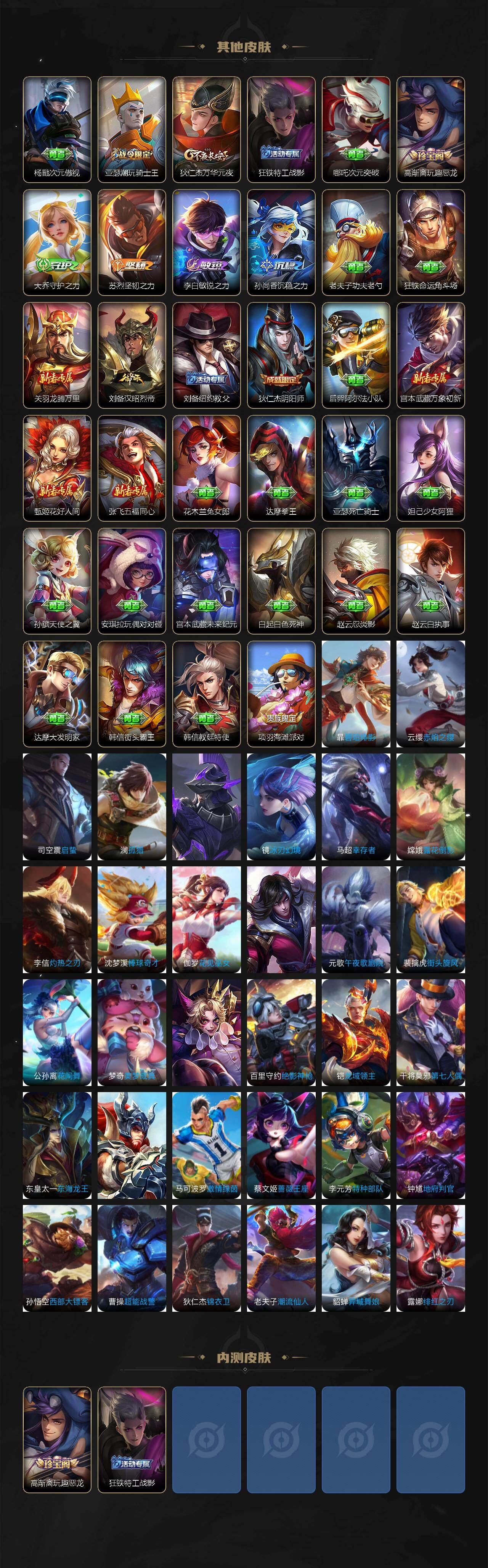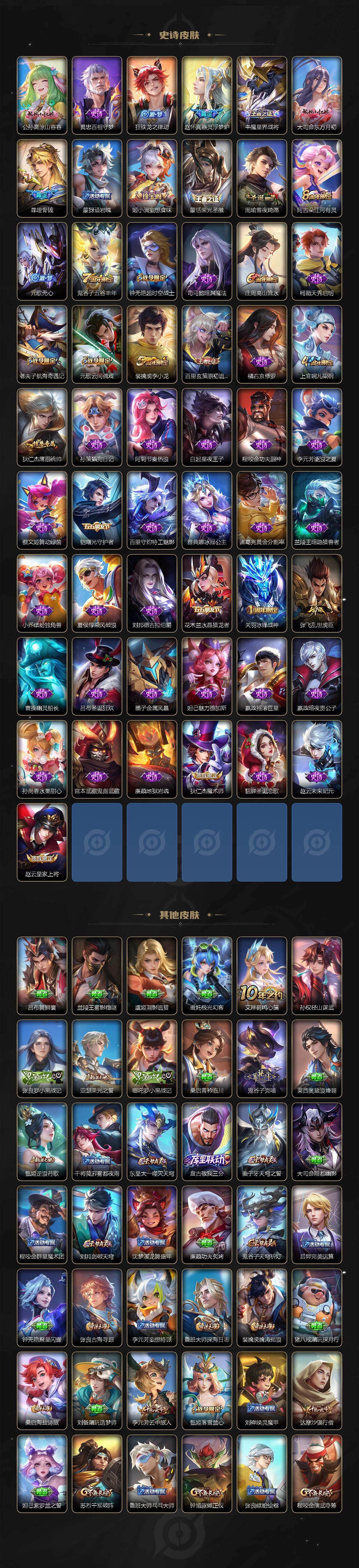 【史诗皮肤】:上官婉儿春霖将至,太乙真人瓦猫非猫,周瑜线条小狗,小乔线条小狗,项羽九幽镇关,女娲万灵启世,公孙离涂山容容,黄忠百相守梦,狂铁龙之律动,赵怀真器灵浮梦炉,牛魔星界战将,大司命东方月初,暃埋骨钱,蒙犽顽岩魄,姬小满妄想食味,蒙恬荣光圣徽,周瑜雪夜绮愿,阿古朵江河有灵,元歌无心,鬼谷子五谷丰年,钟无艳超时空战士,司马懿暗渊魔法,庄周高山流水,杨戬天秀启明,老夫子航海奇遇记,元歌云间偶戏,裴擒虎李小龙,百里玄策原初追逐者,橘右京修罗,上官婉儿梁祝,狄仁杰鹰眼统帅,孙策猫狗日记,阿轲节奏热浪,白起星夜王子,程咬金功夫厨神,李元芳逐浪之夏,蔡文姬舞动绿茵,铠曙光守护者,百里守约特工魅影,雅典娜冰冠公主,诸葛亮黄金分割率,兰陵王暗隐猎兽者,小乔缤纷独角兽,夏侯惇乘风破浪,刘邦德古拉伯爵,花木兰水晶猎龙者,关羽冰锋战神
